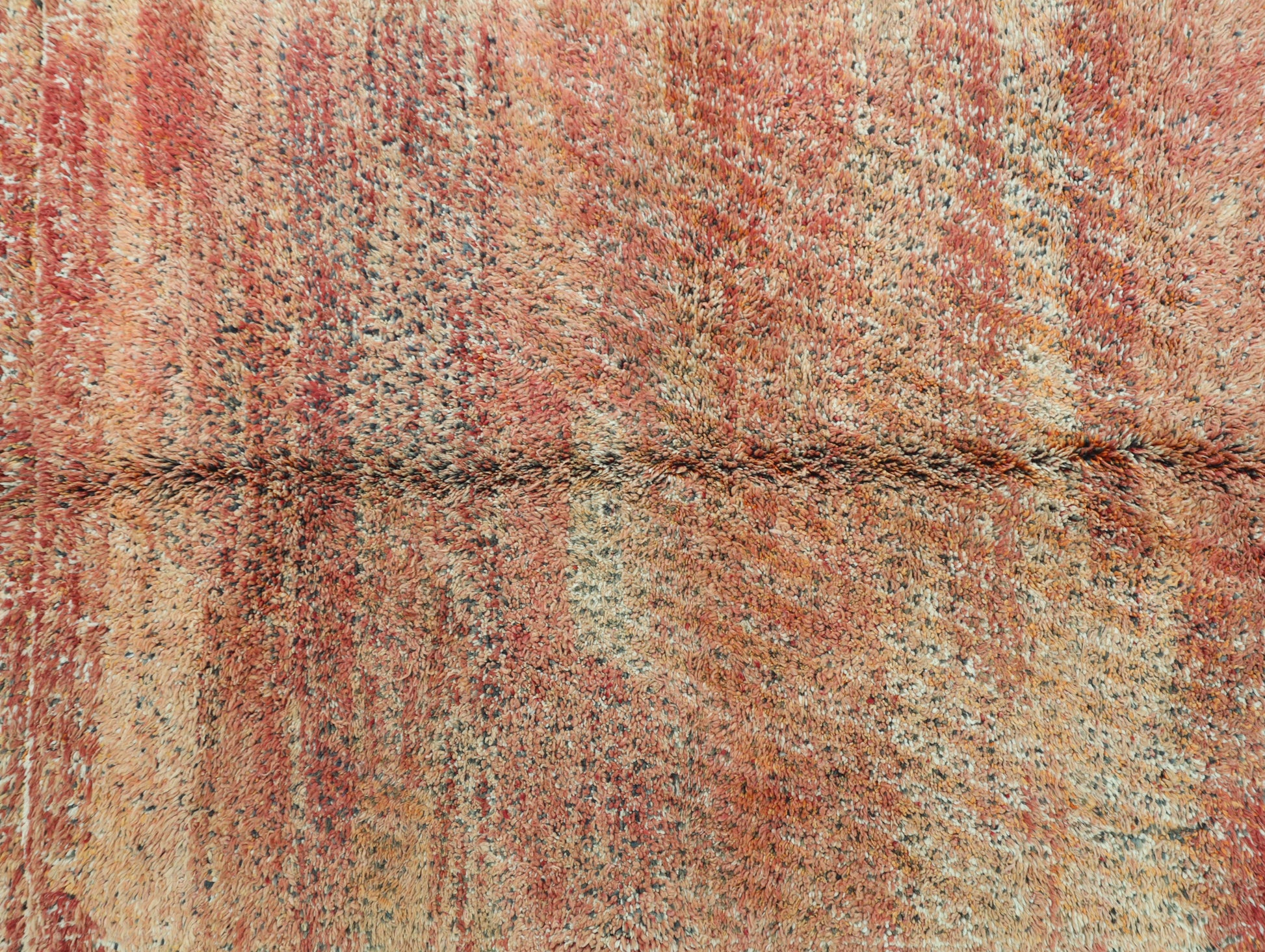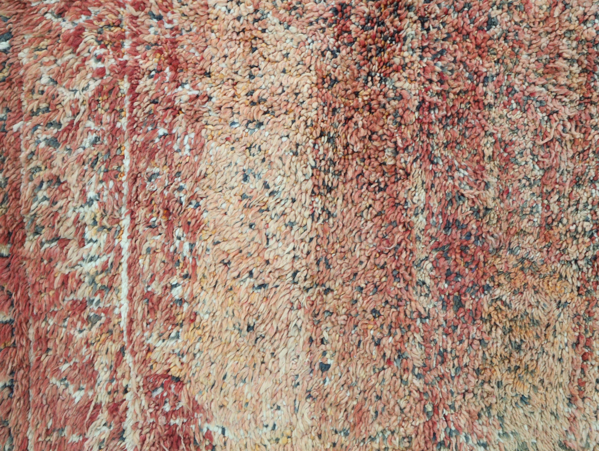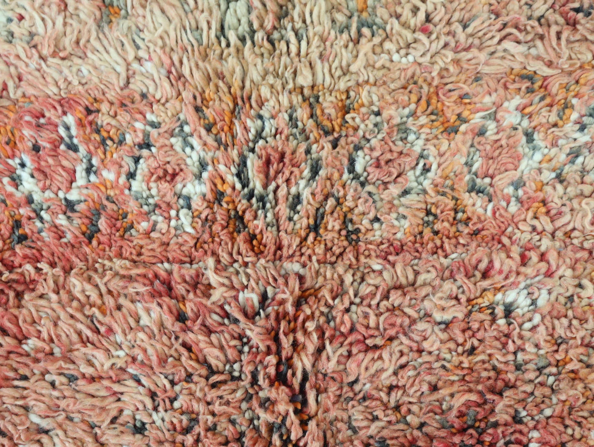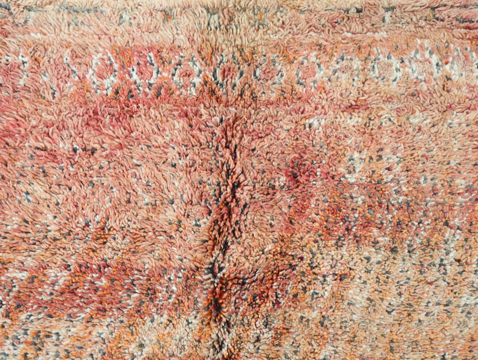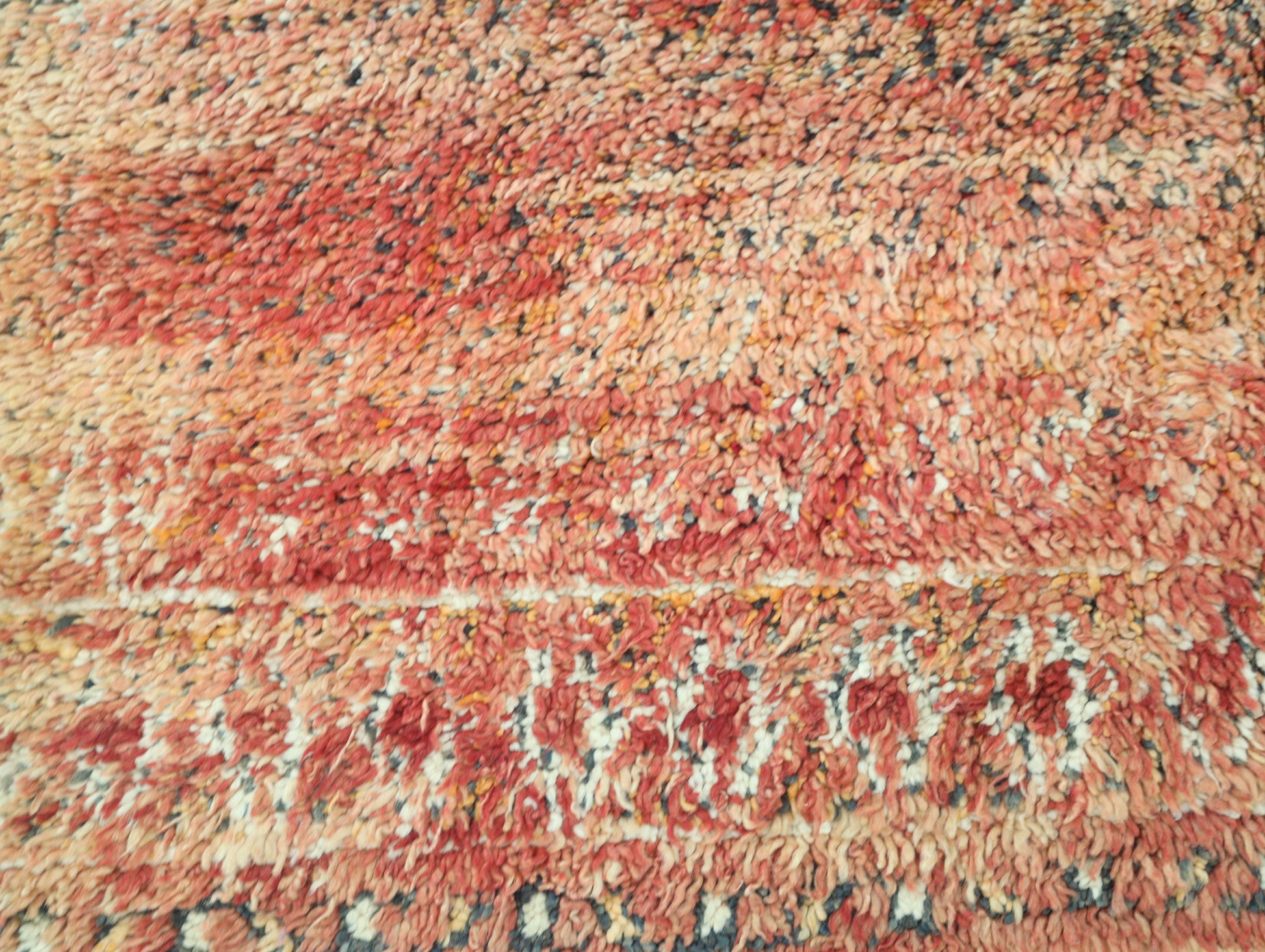 Wool, a sacred material for the Amazigh (Berber) people, forms the cornerstone of Moroccan rug design. Durable, long-lasting, and soft underfoot, wool is both functional and comfortable. In this piece, the wool pile is expertly knotted onto a wool foundation, adding substance and allowing it to gracefully embrace the floor.