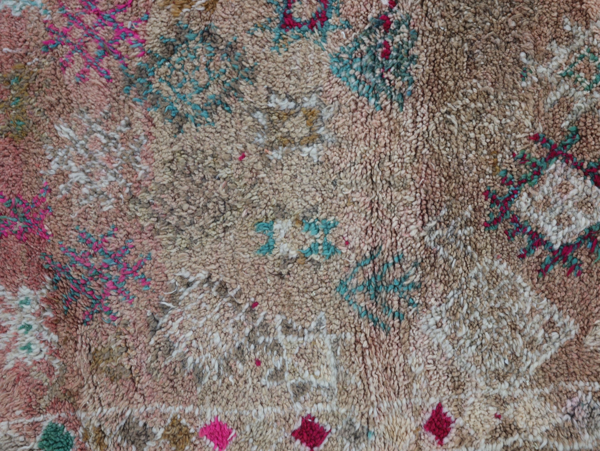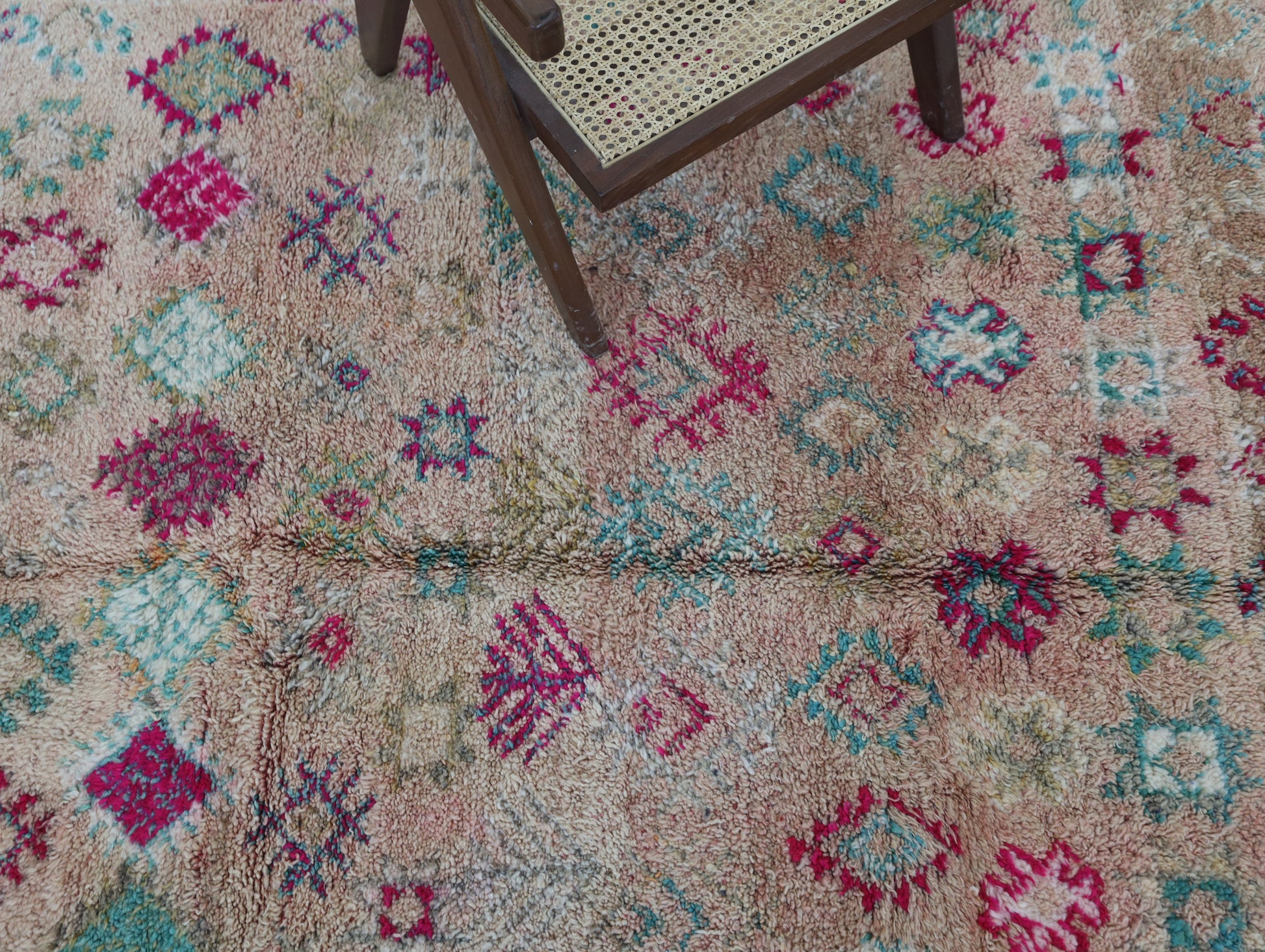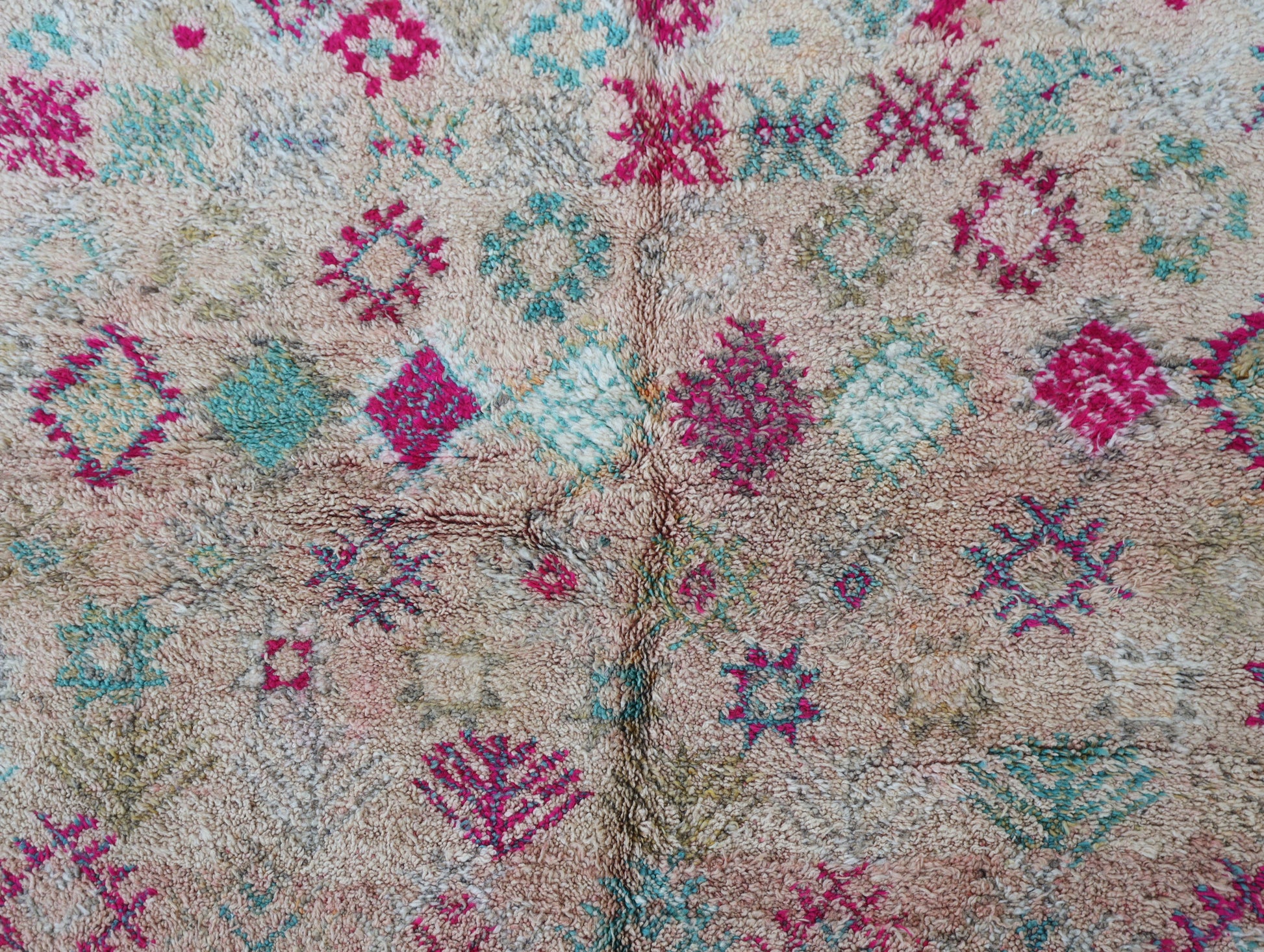 Originating in the Holy town of Boujad, these rugs, woven by diverse tribes, exhibit a wide spectrum of color, composition, and weave. Described as surreal, mystic, and mesmerizing, Boujad rugs transport us to a world beyond reality. Their construction, with twice as many horizontal as vertical knots, renders them floppy and easy to move.