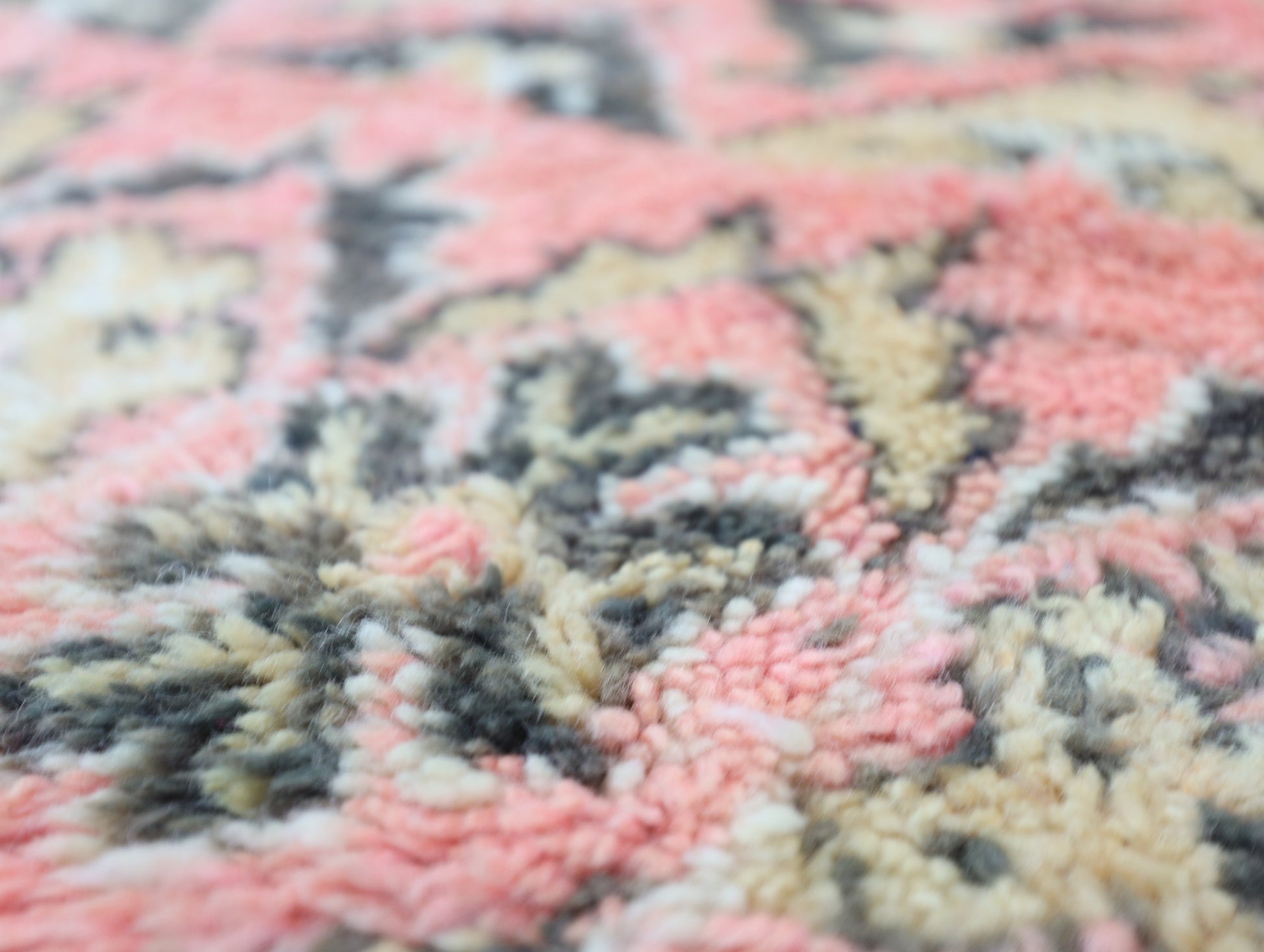 Originating in the Holy town of Boujad, these rugs, woven by diverse tribes, exhibit a wide spectrum of color, composition, and weave. Described as surreal, mystic, and mesmerizing, Boujad rugs transport us to a world beyond reality. Their construction, with twice as many horizontal as vertical knots, renders them floppy and easy to move.