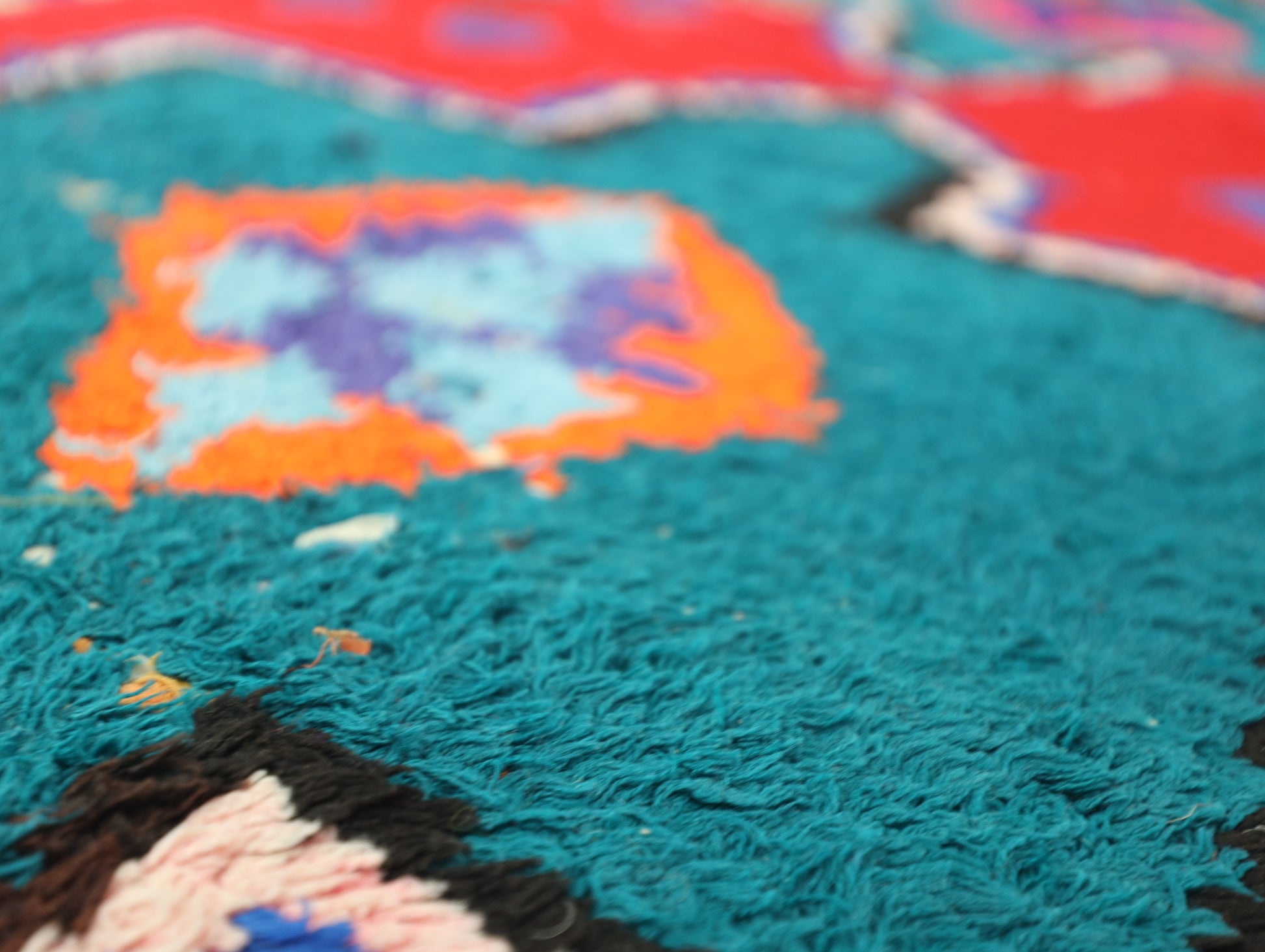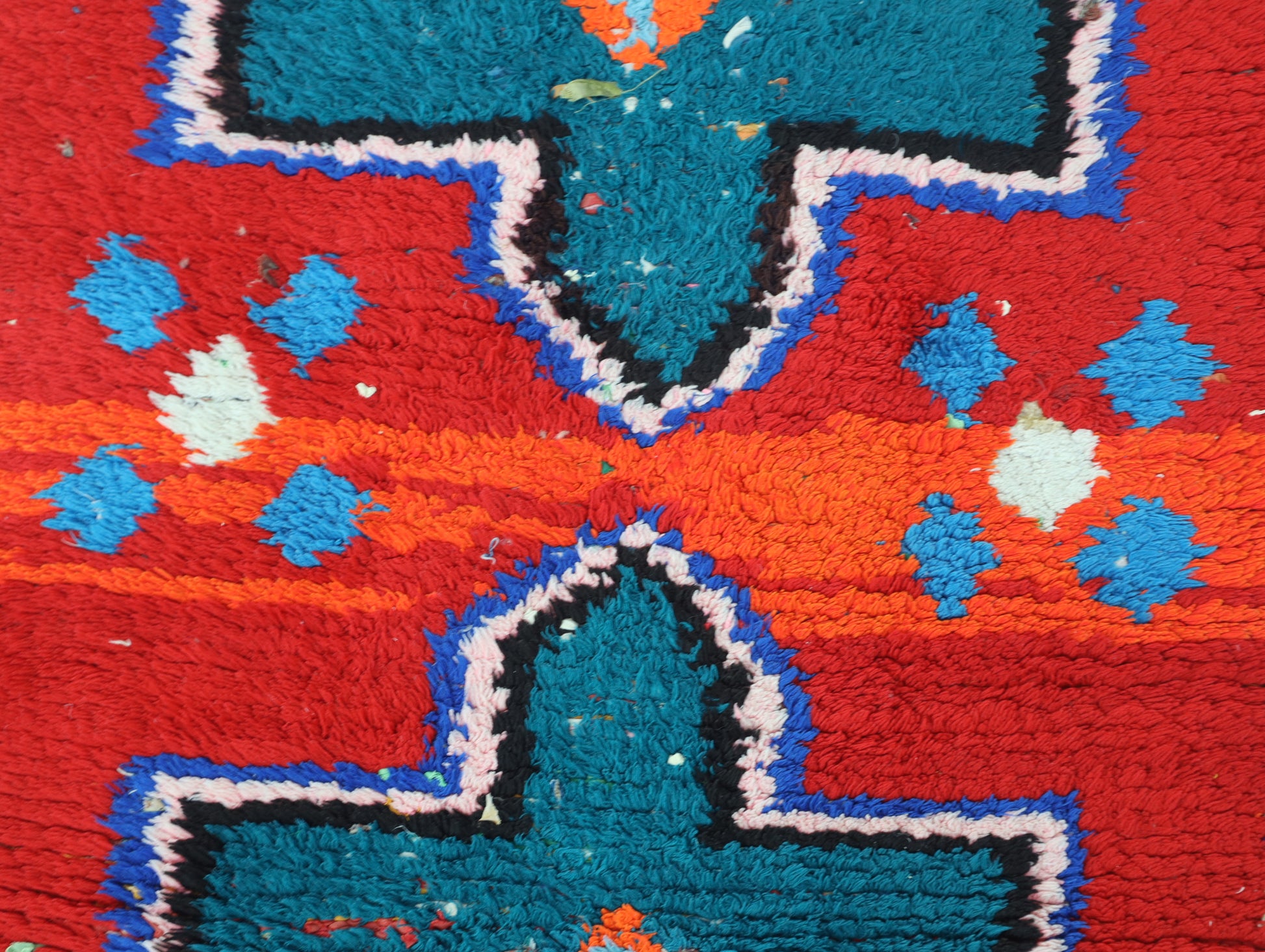 Azilal rugs boast abstract, painterly designs reminiscent of rugs from Ourika. What sets them apart is a vibrant color palette, achieved through the incorporation of cotton alongside wool..