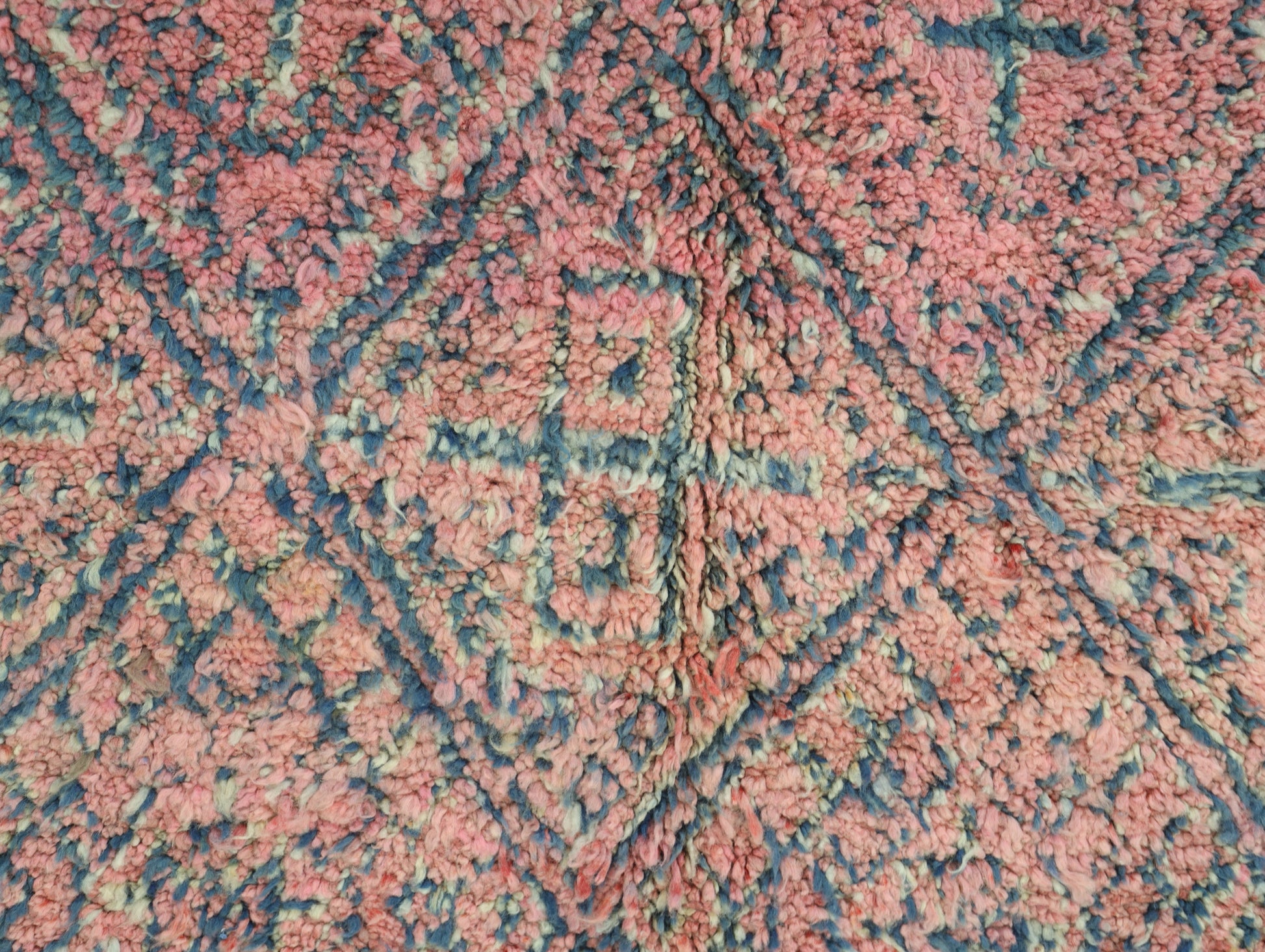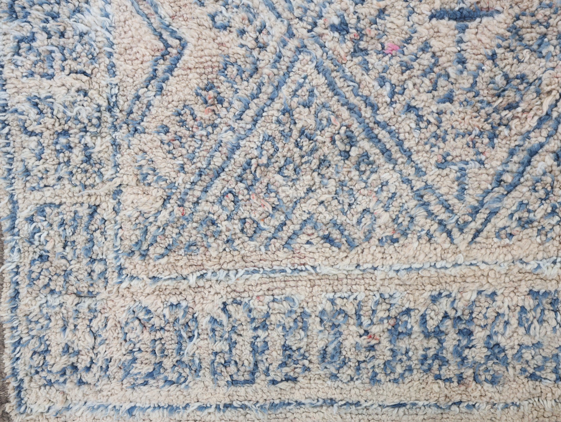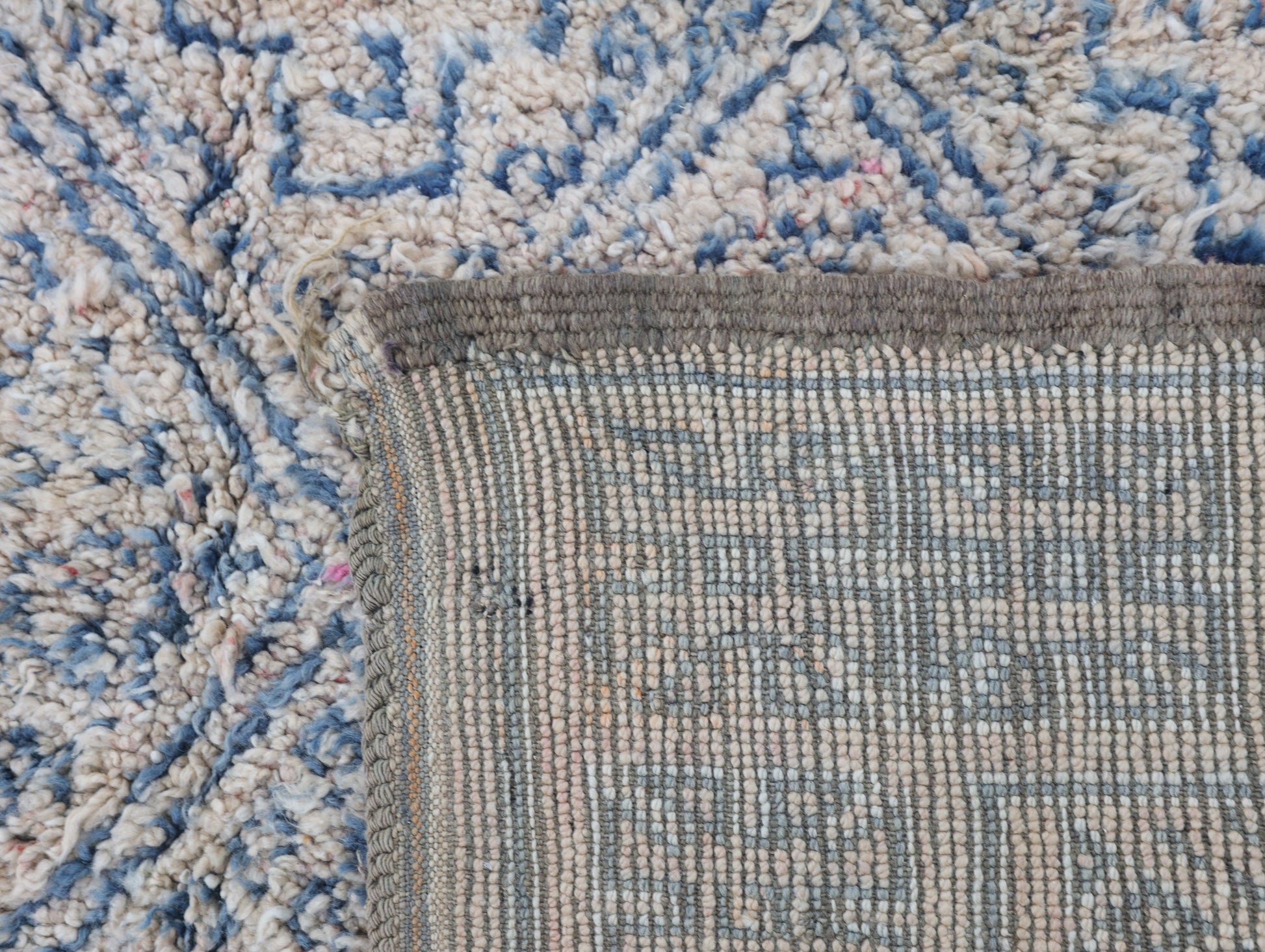 Wool, a sacred material for the Amazigh (Berber) people, forms the cornerstone of Moroccan rug design. Durable, long-lasting, and soft underfoot, wool is both functional and comfortable. In this piece, the wool pile is expertly knotted onto a wool foundation, adding substance and allowing it to gracefully embrace the floor.