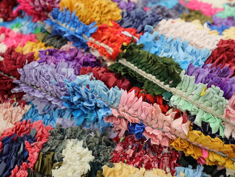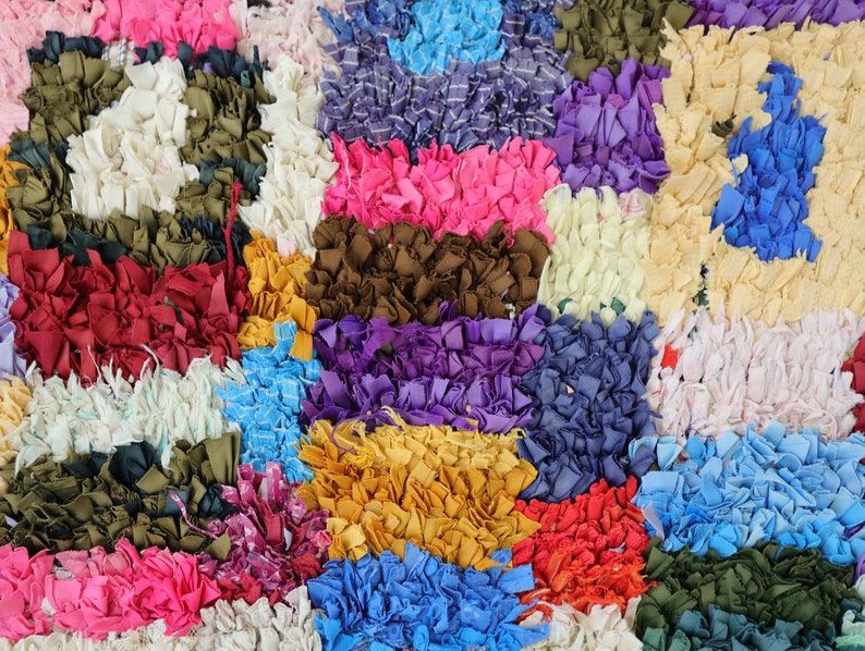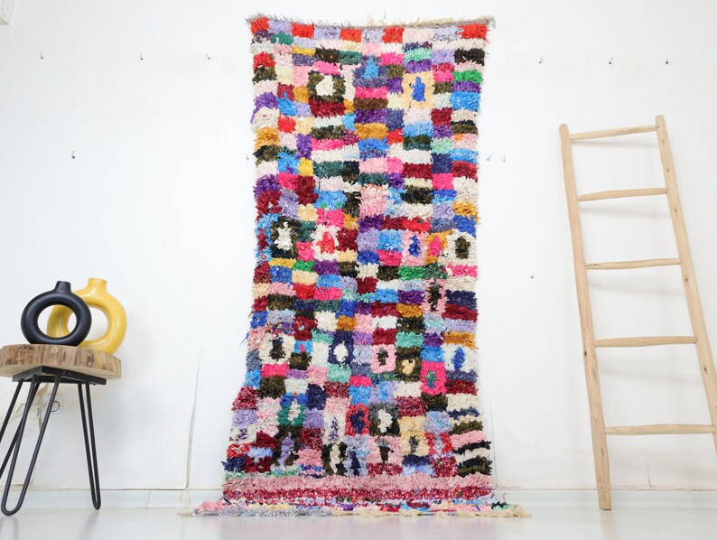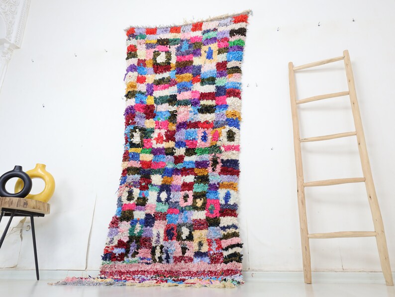 A truly unique vintage rug, meticulously hand-knotted by Berber Tribes in the Boucherouite style using upcycled textiles. Size: 3'0" x 7'9" (92 cm x 240 cm),