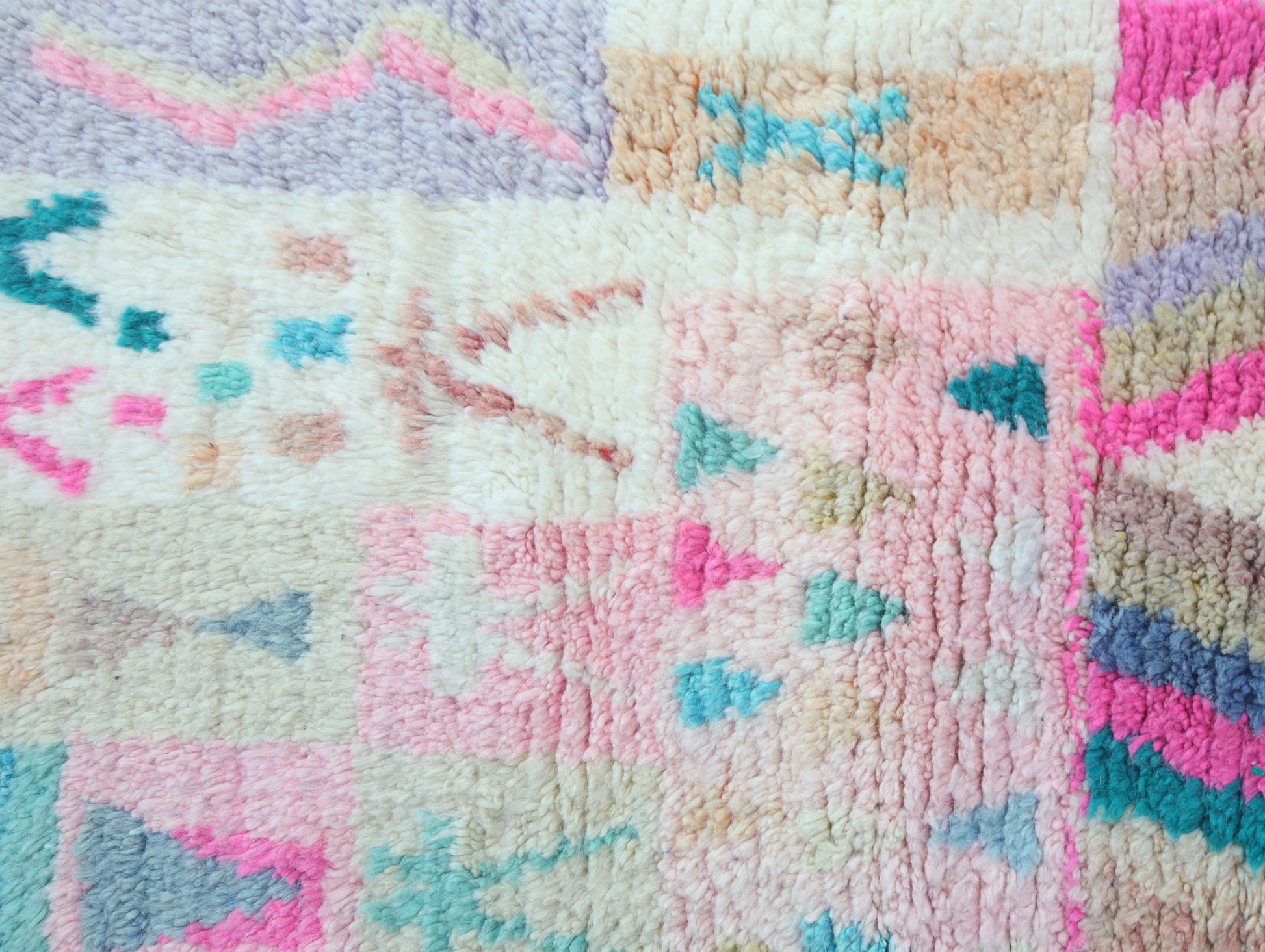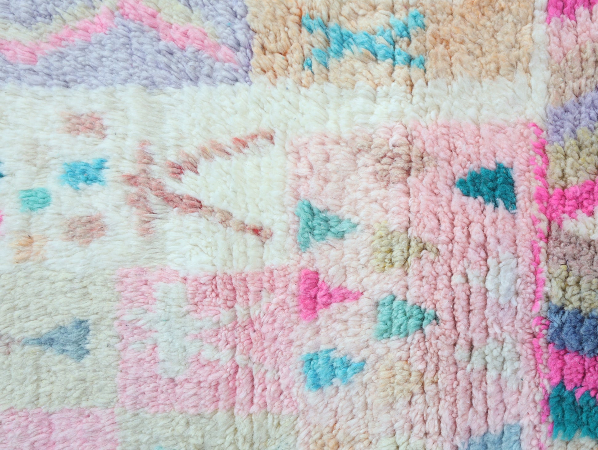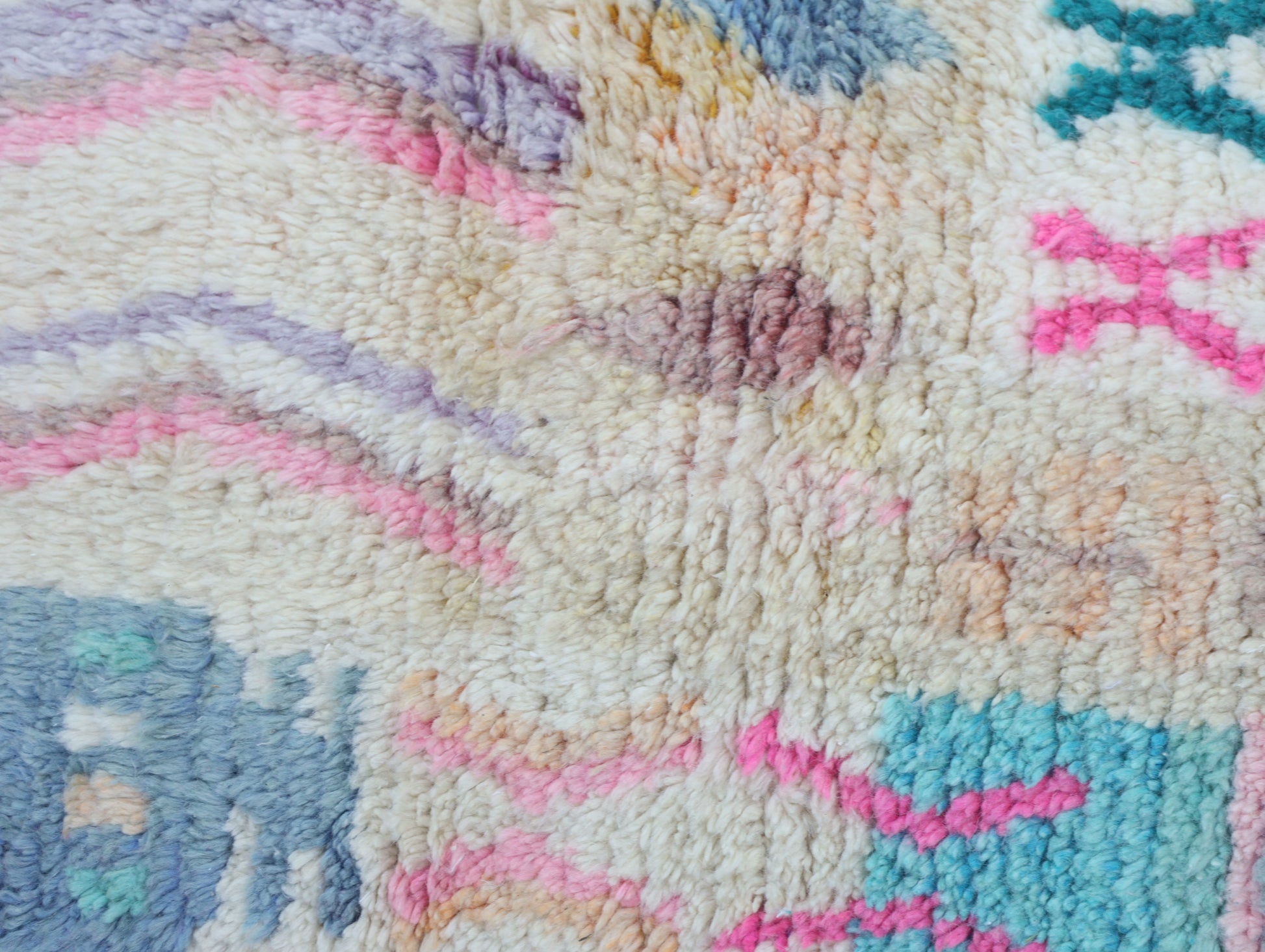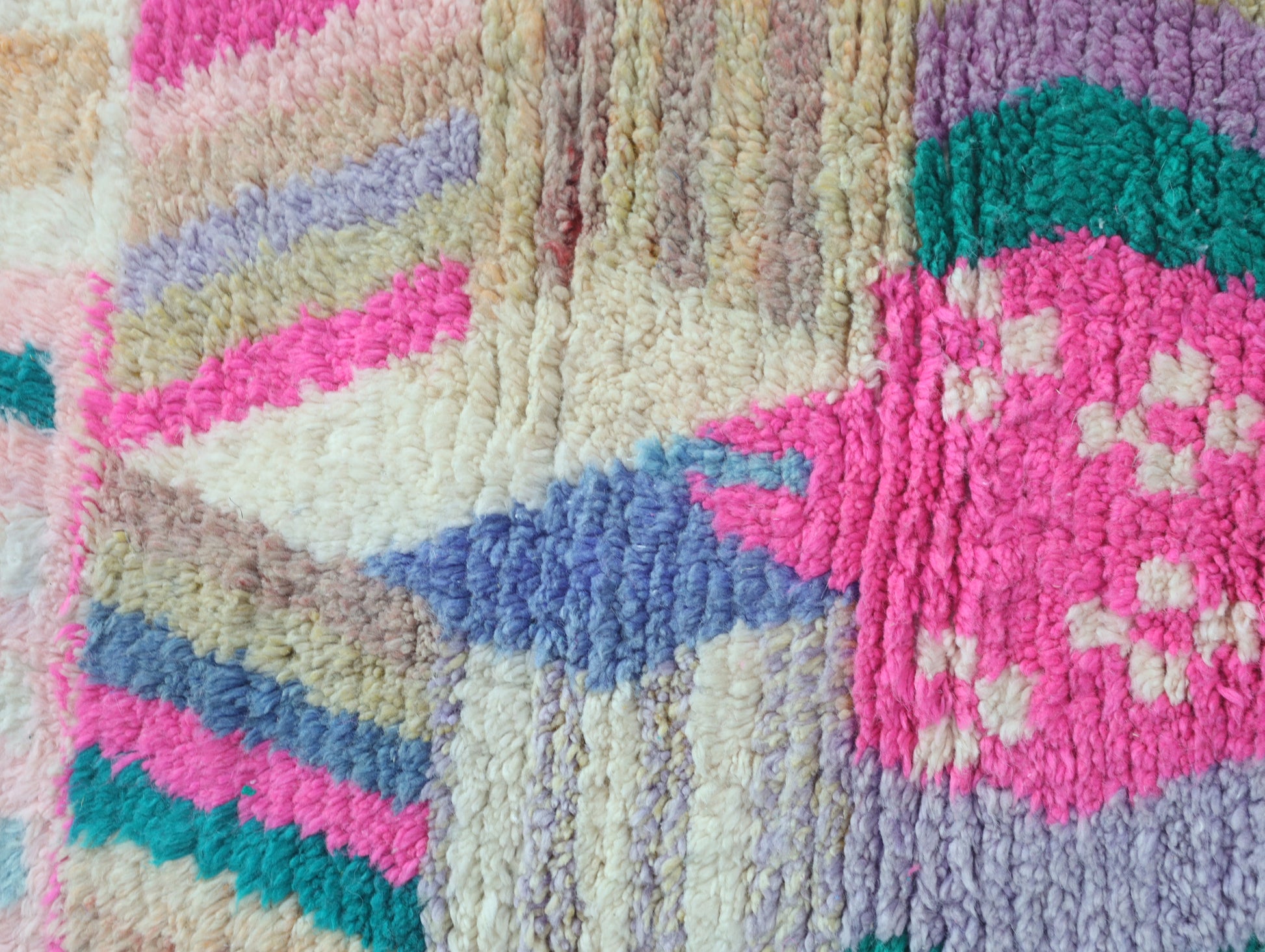 Originating in the Holy town of Boujad, these rugs, woven by diverse tribes, exhibit a wide spectrum of color, composition, and weave. Described as surreal, mystic, and mesmerizing, Boujad rugs transport us to a world beyond reality. Their construction, with twice as many horizontal as vertical knots, renders them floppy and easy to move.