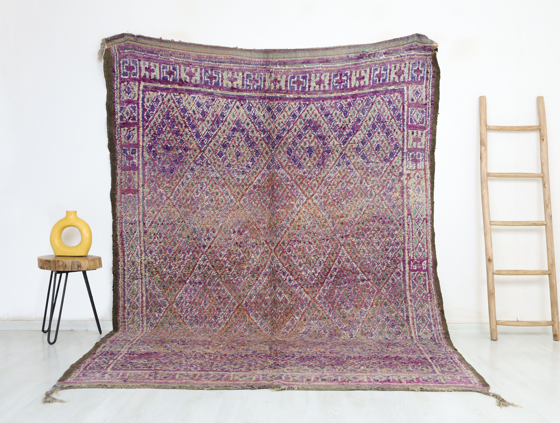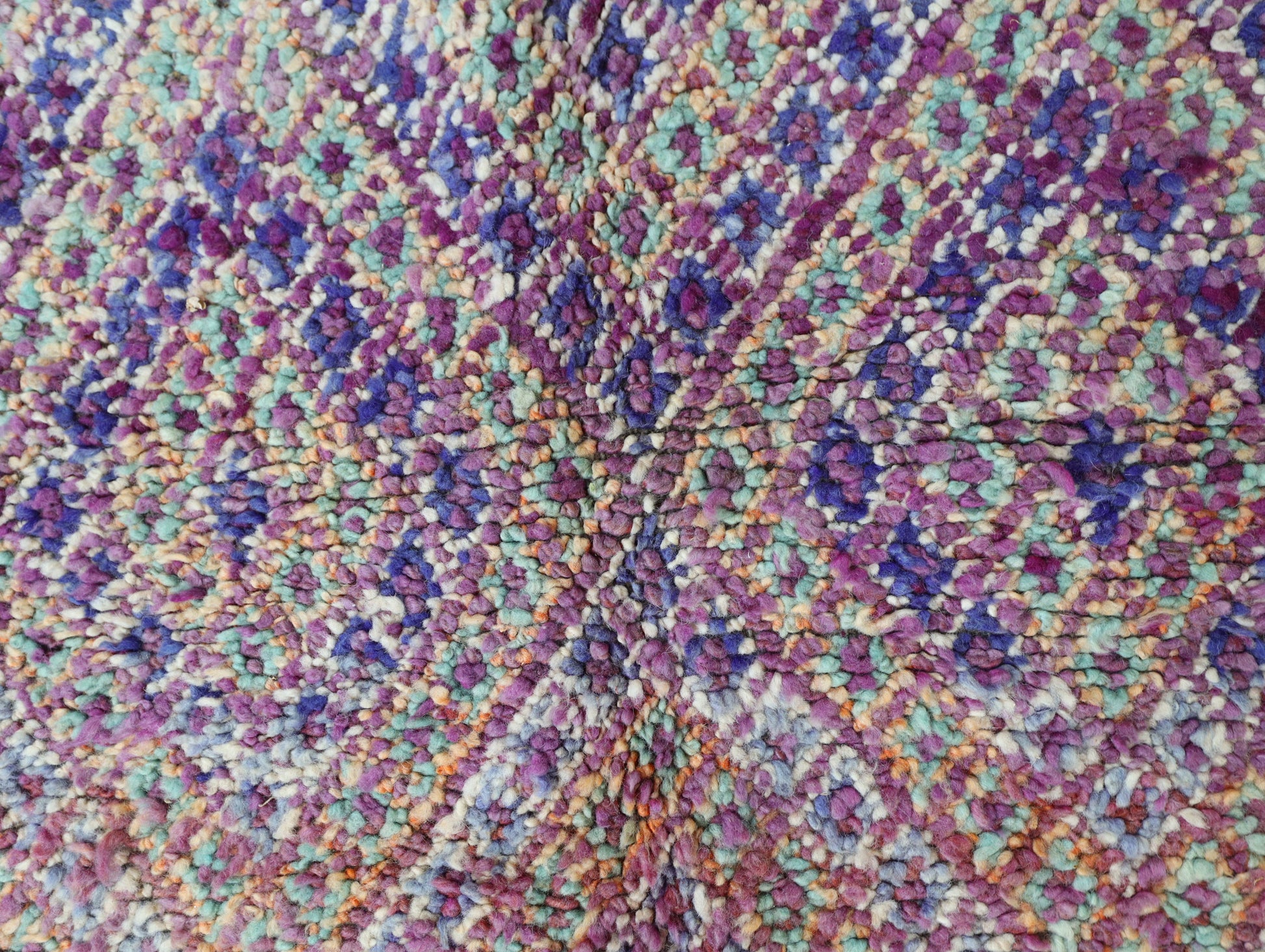 Originating in the Holy town of Boujad, these rugs, woven by diverse tribes, exhibit a wide spectrum of color, composition, and weave. Described as surreal, mystic, and mesmerizing, Boujad rugs transport us to a world beyond reality. Their construction, with twice as many horizontal as vertical knots, renders them floppy and easy to move.