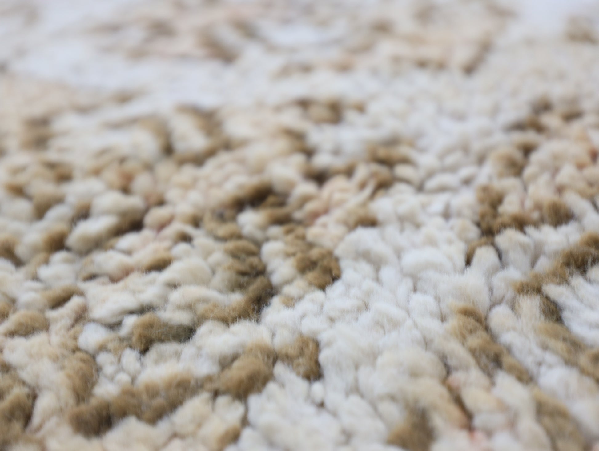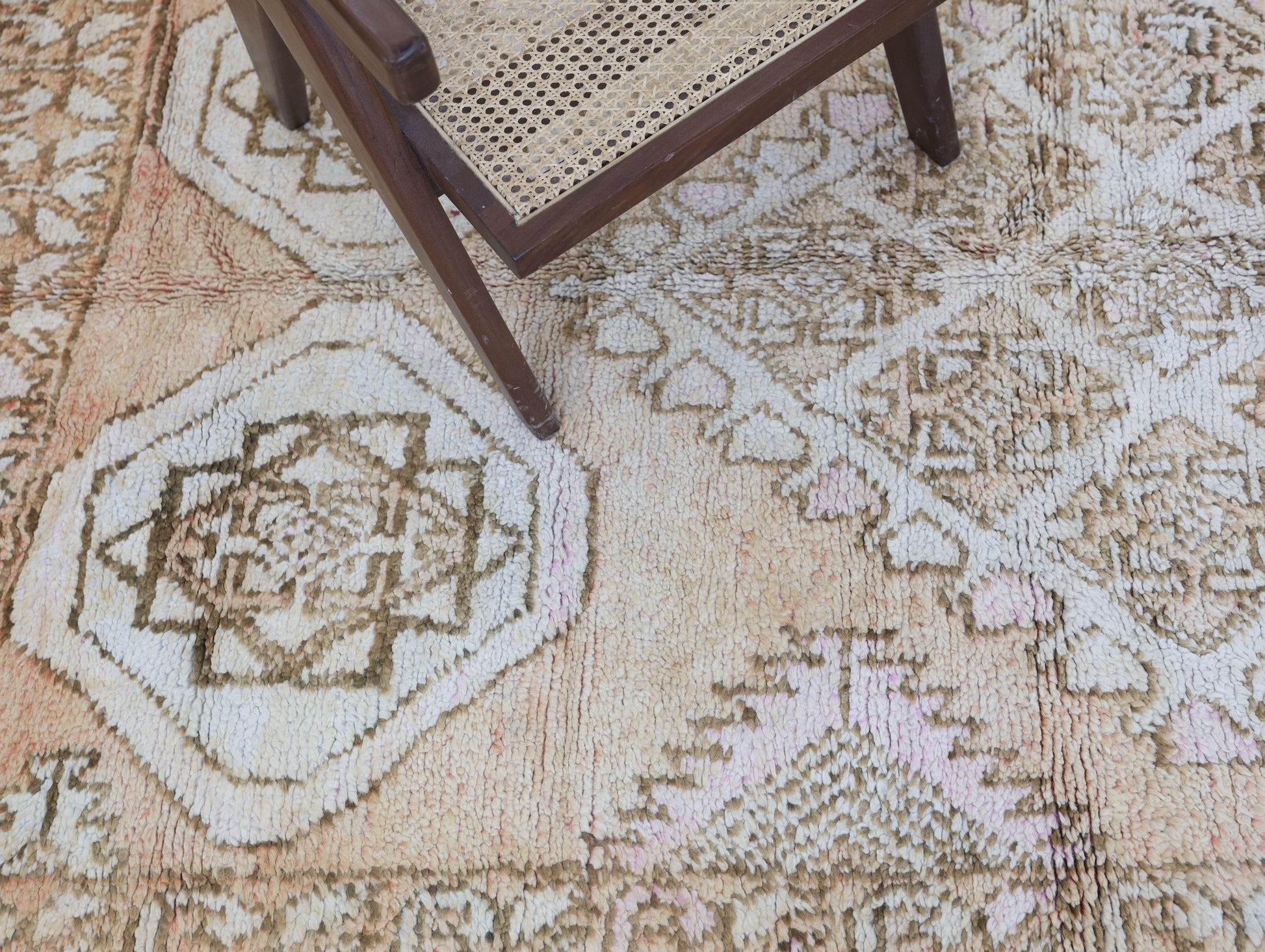 Wool, a sacred material for the Amazigh (Berber) people, forms the cornerstone of Moroccan rug design. Durable, long-lasting, and soft underfoot, wool is both functional and comfortable. In this piece, the wool pile is expertly knotted onto a wool foundation, adding substance and allowing it to gracefully embrace the floor.