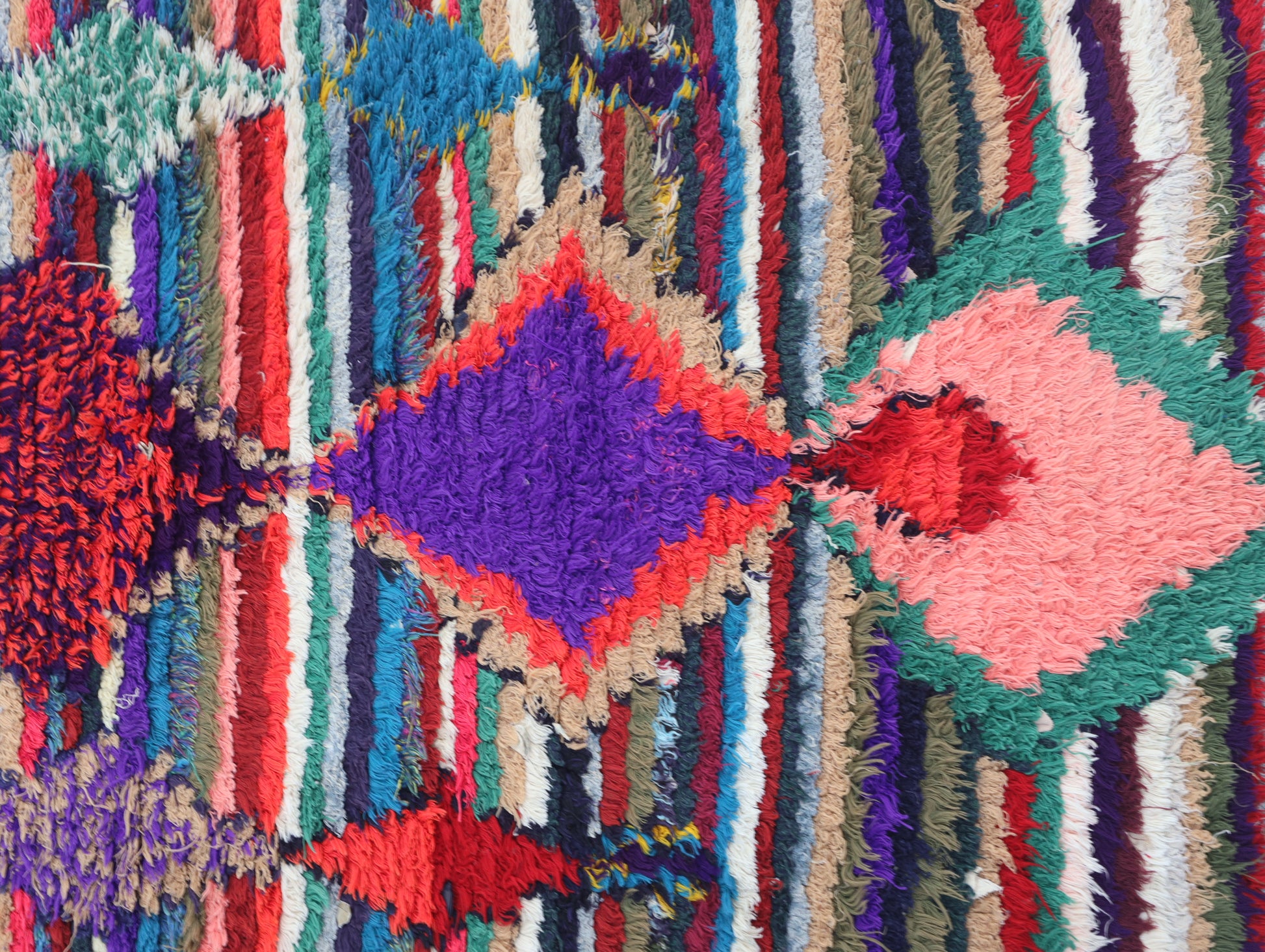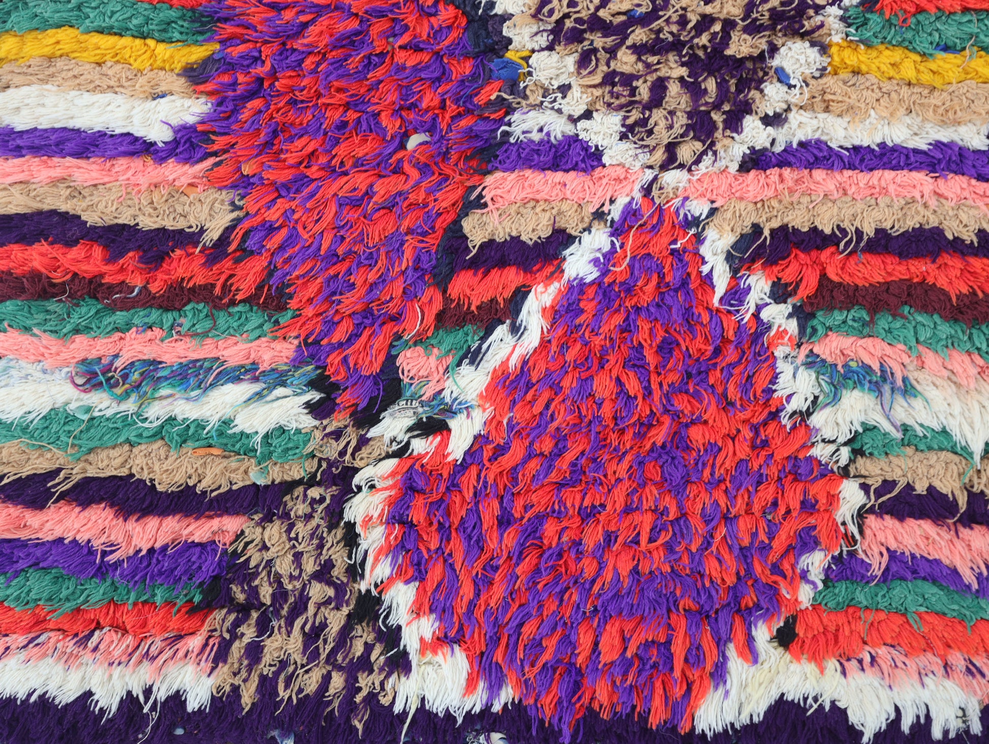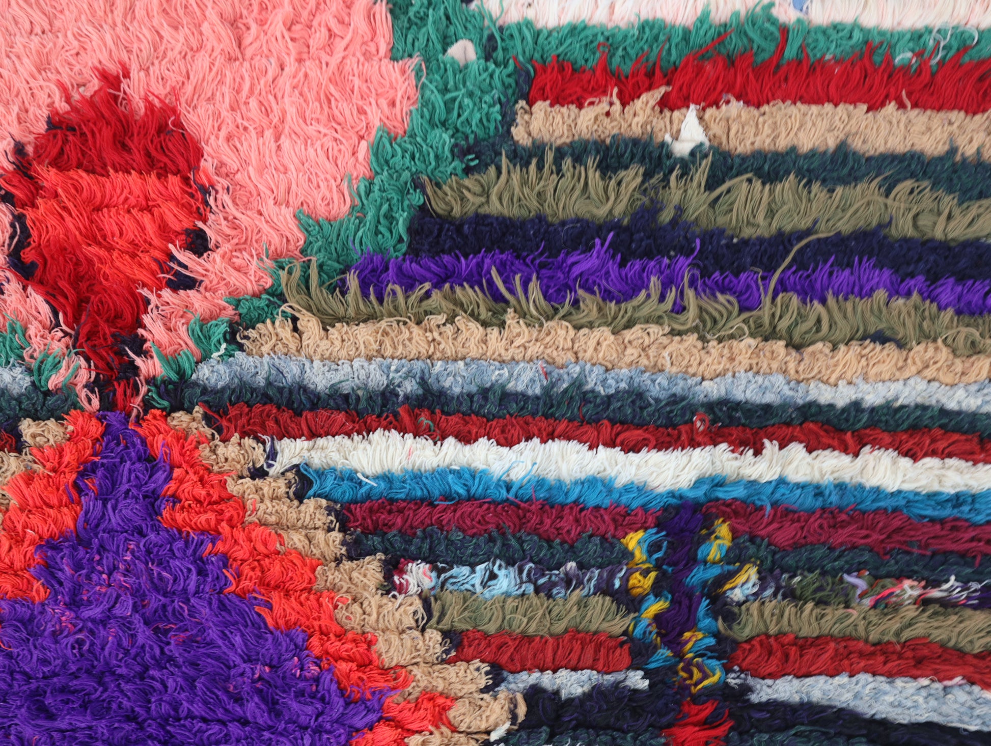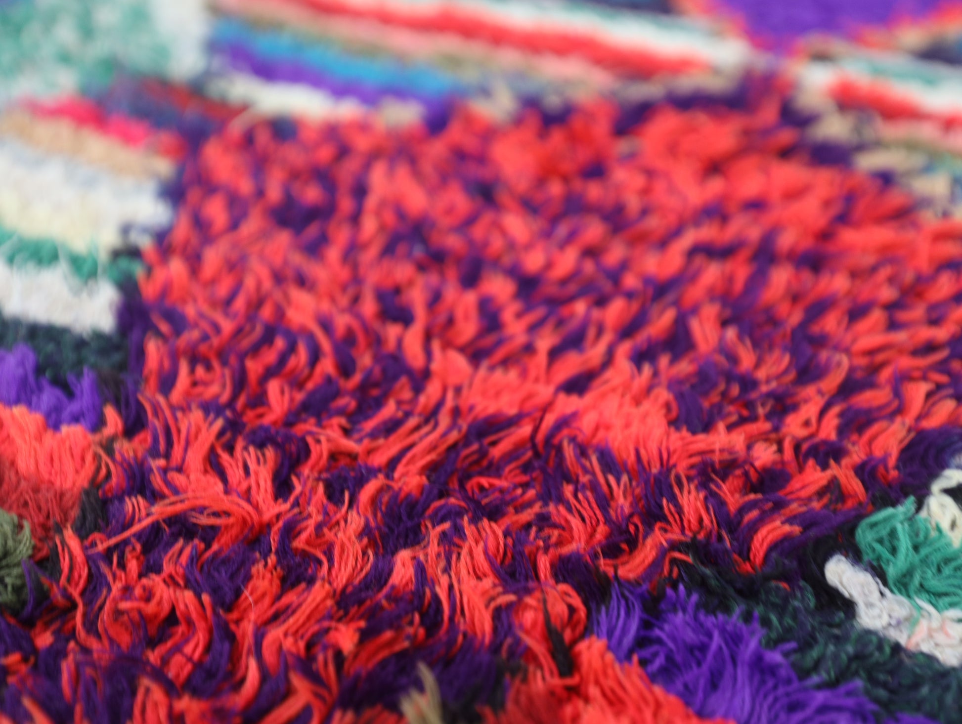 Azilal rugs boast abstract, painterly designs reminiscent of rugs from Ourika. What sets them apart is a vibrant color palette, achieved through the incorporation of cotton alongside wool..