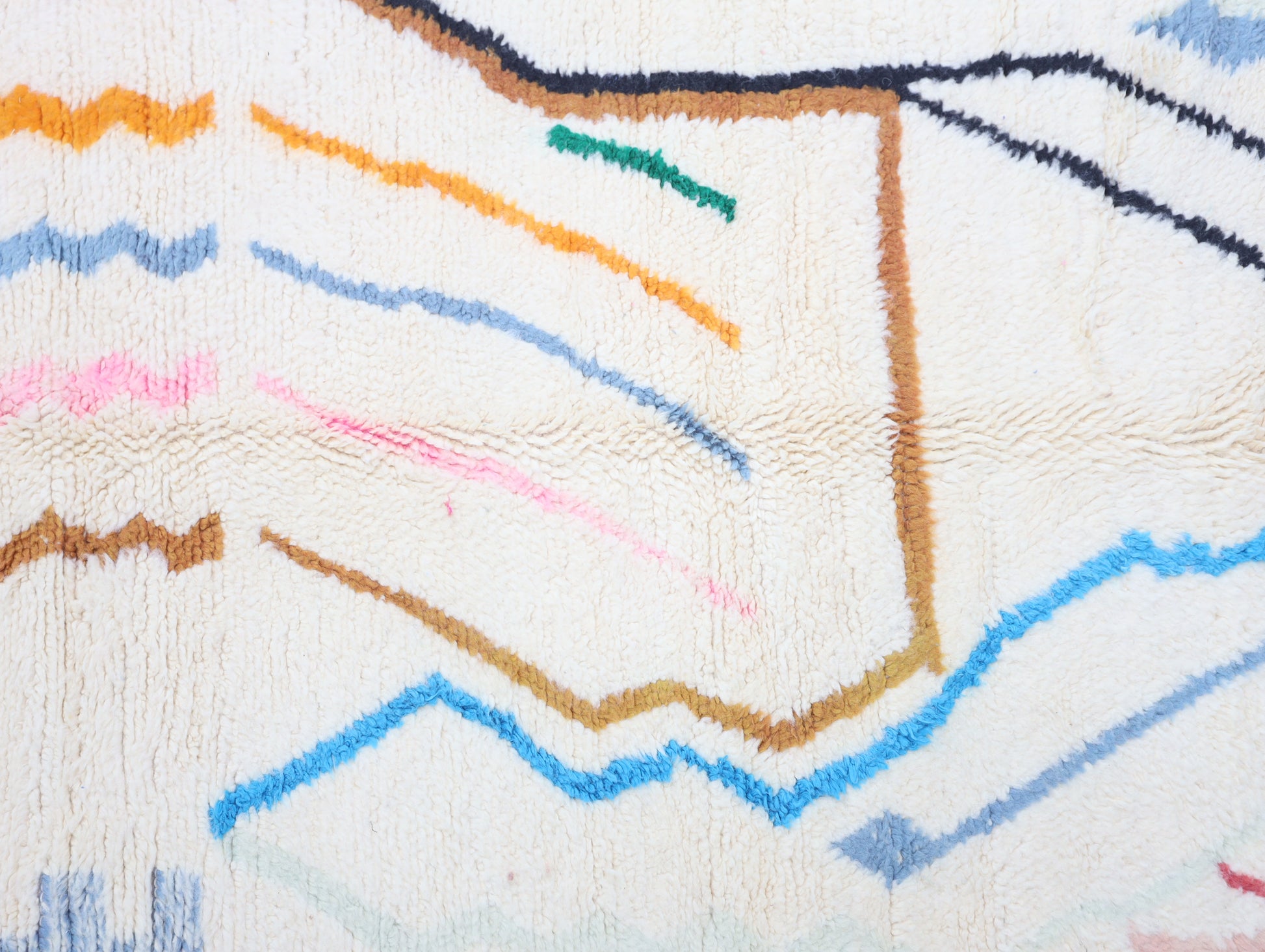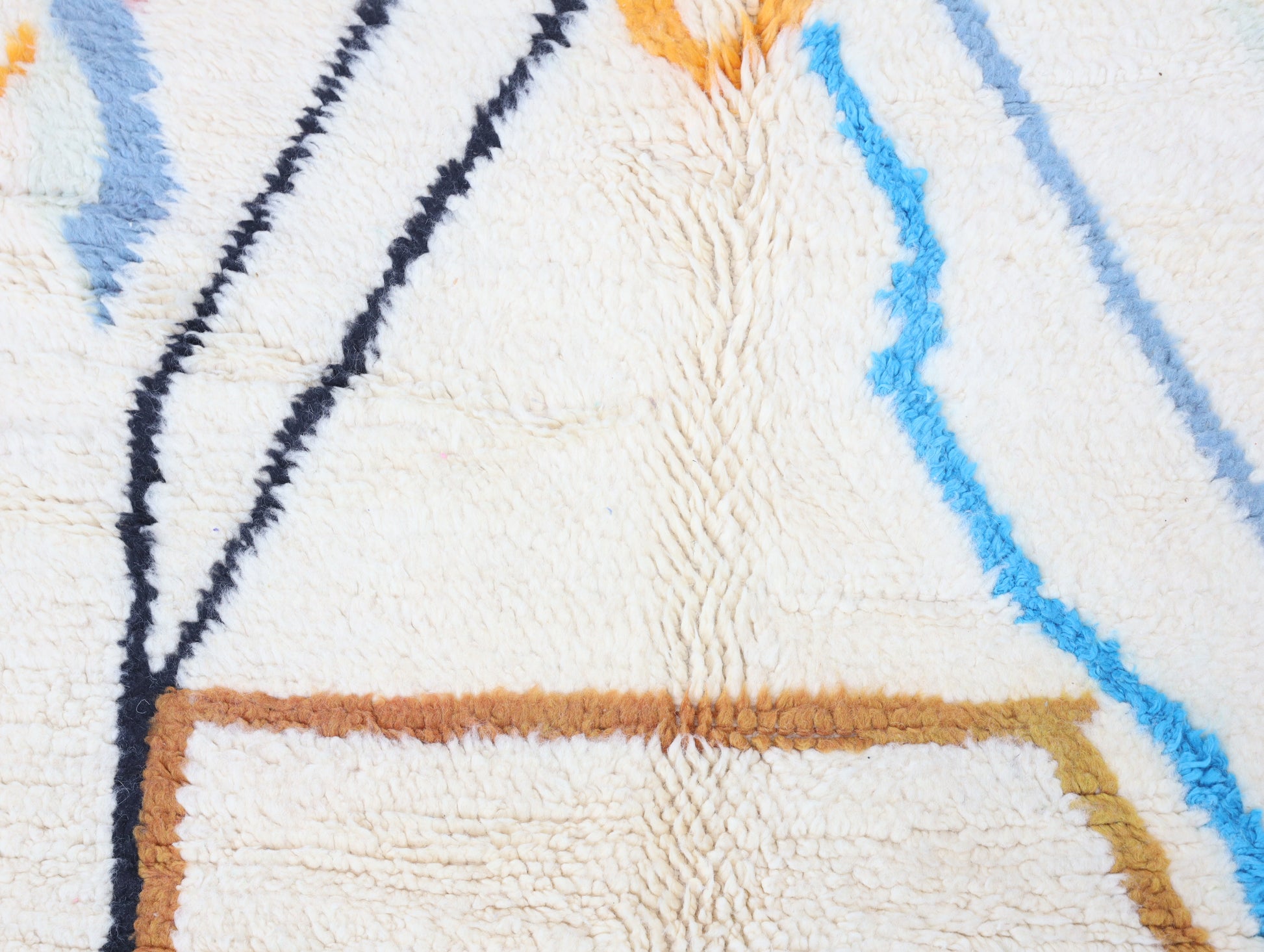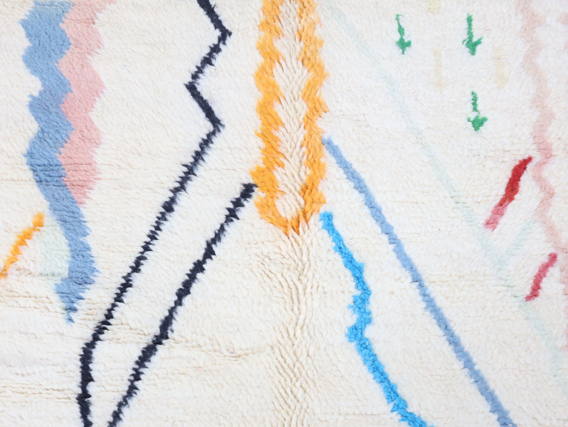 Sourced locally, Moroccan wool produces a dense, sturdy pile that feels soft and fluffy underfoot. While a touch of shedding is natural, it's a small price to pay for the cherished wild, tousled texture of the high pile—a comfort beloved for its durability, longevity, and the soft embrace it offers with every step.