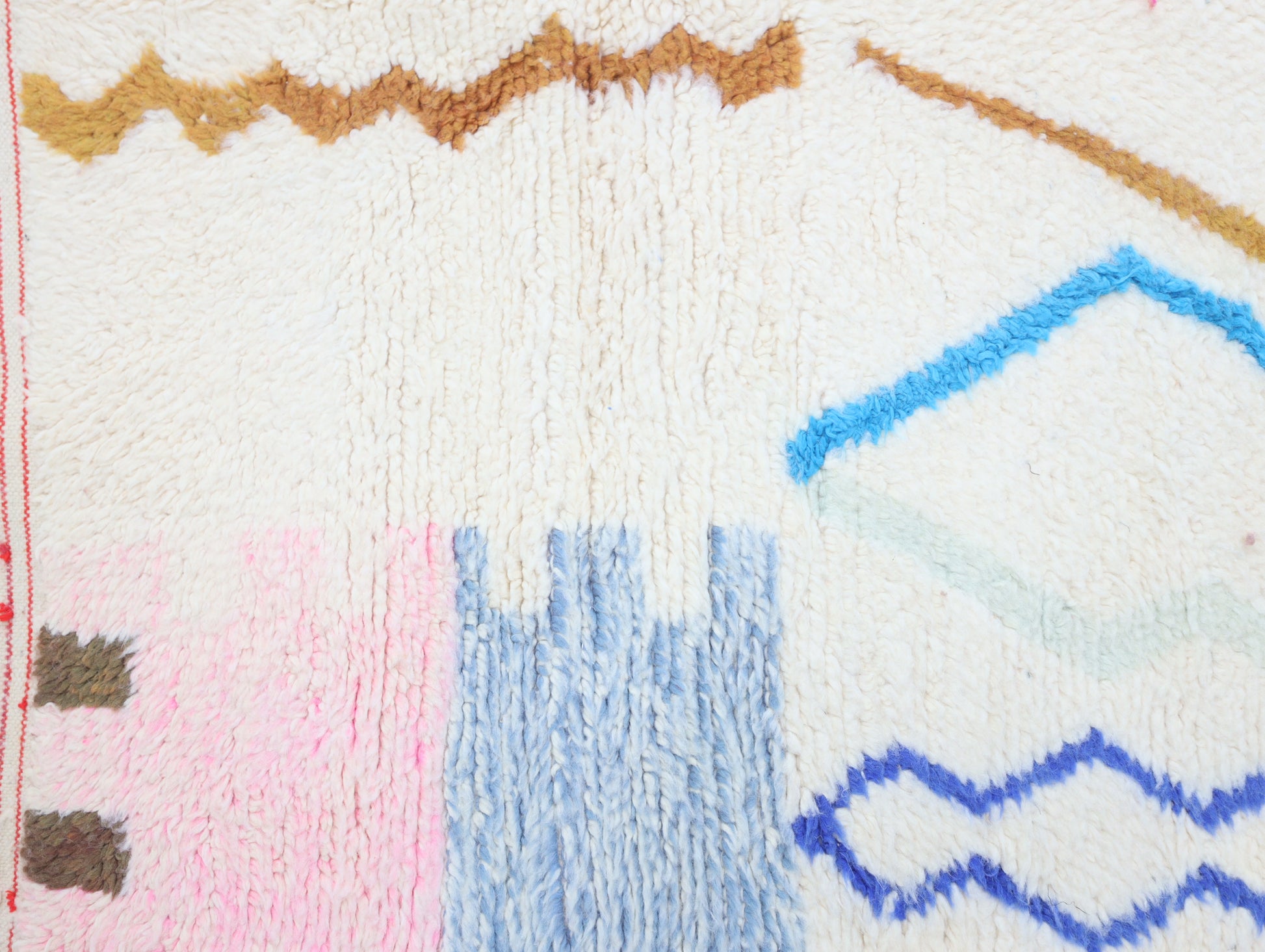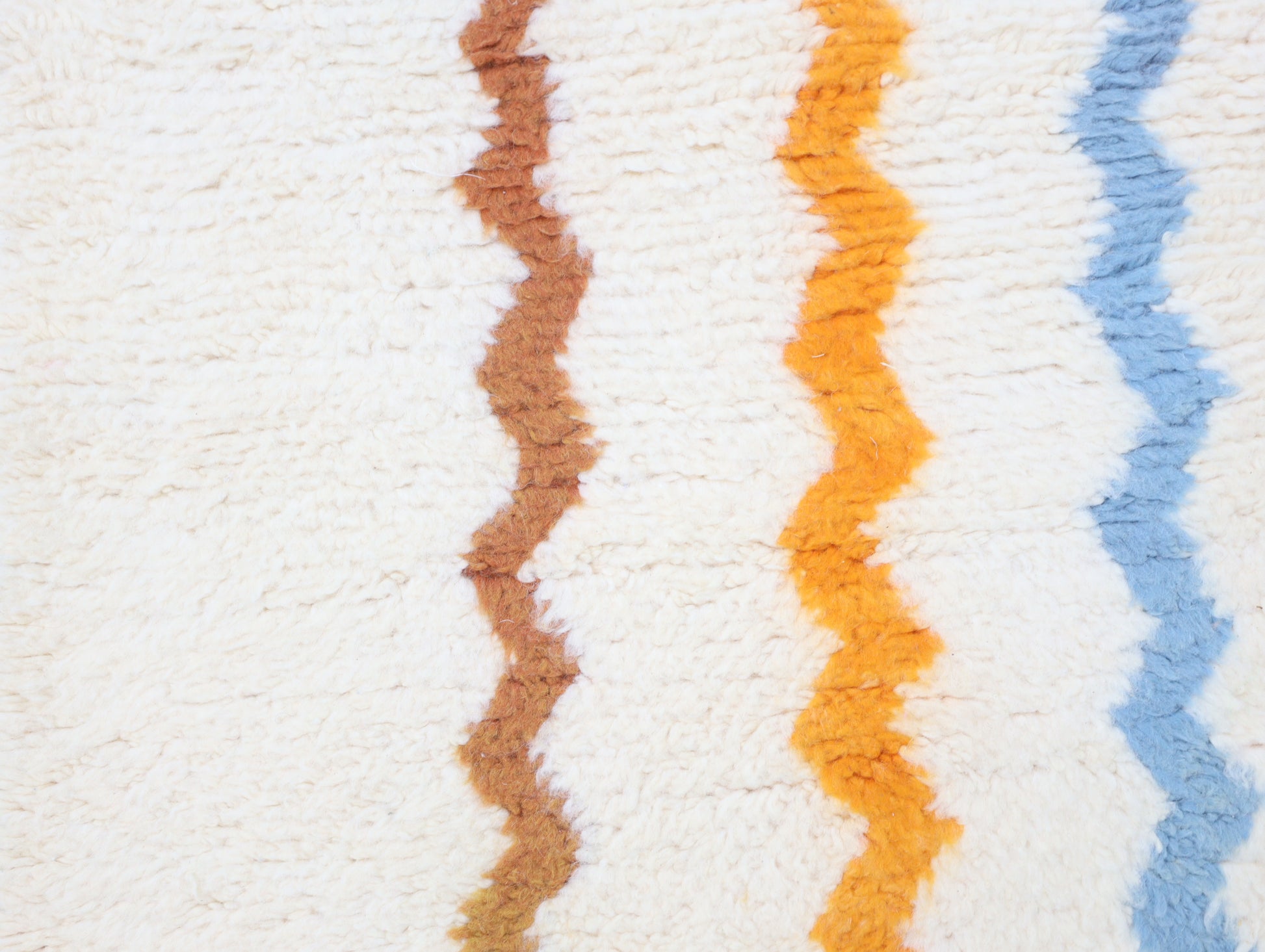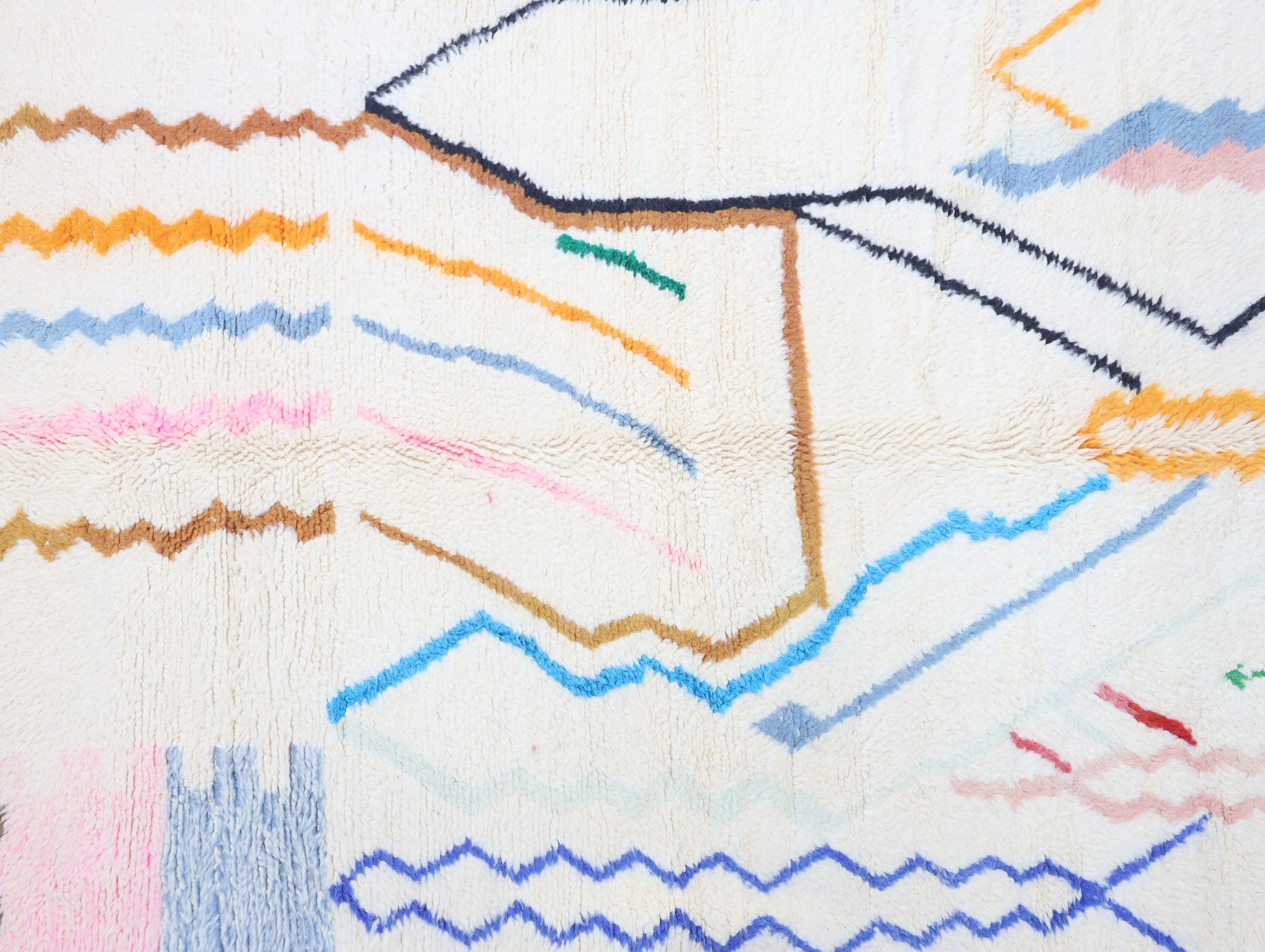 Sourced locally, Moroccan wool produces a dense, sturdy pile that feels soft and fluffy underfoot. While a touch of shedding is natural, it's a small price to pay for the cherished wild, tousled texture of the high pile—a comfort beloved for its durability, longevity, and the soft embrace it offers with every step.