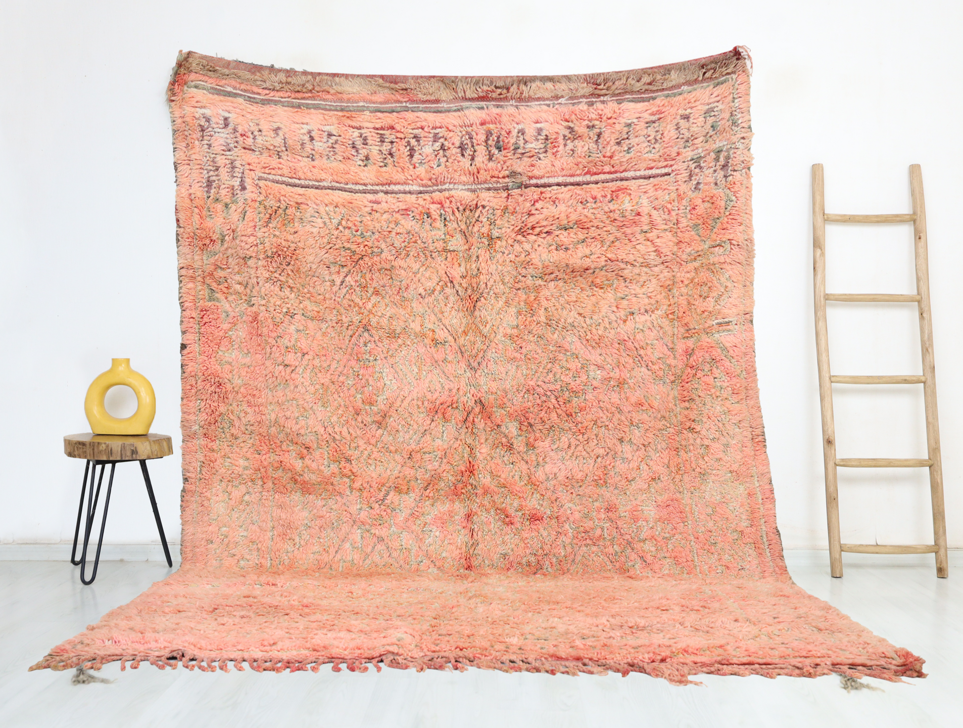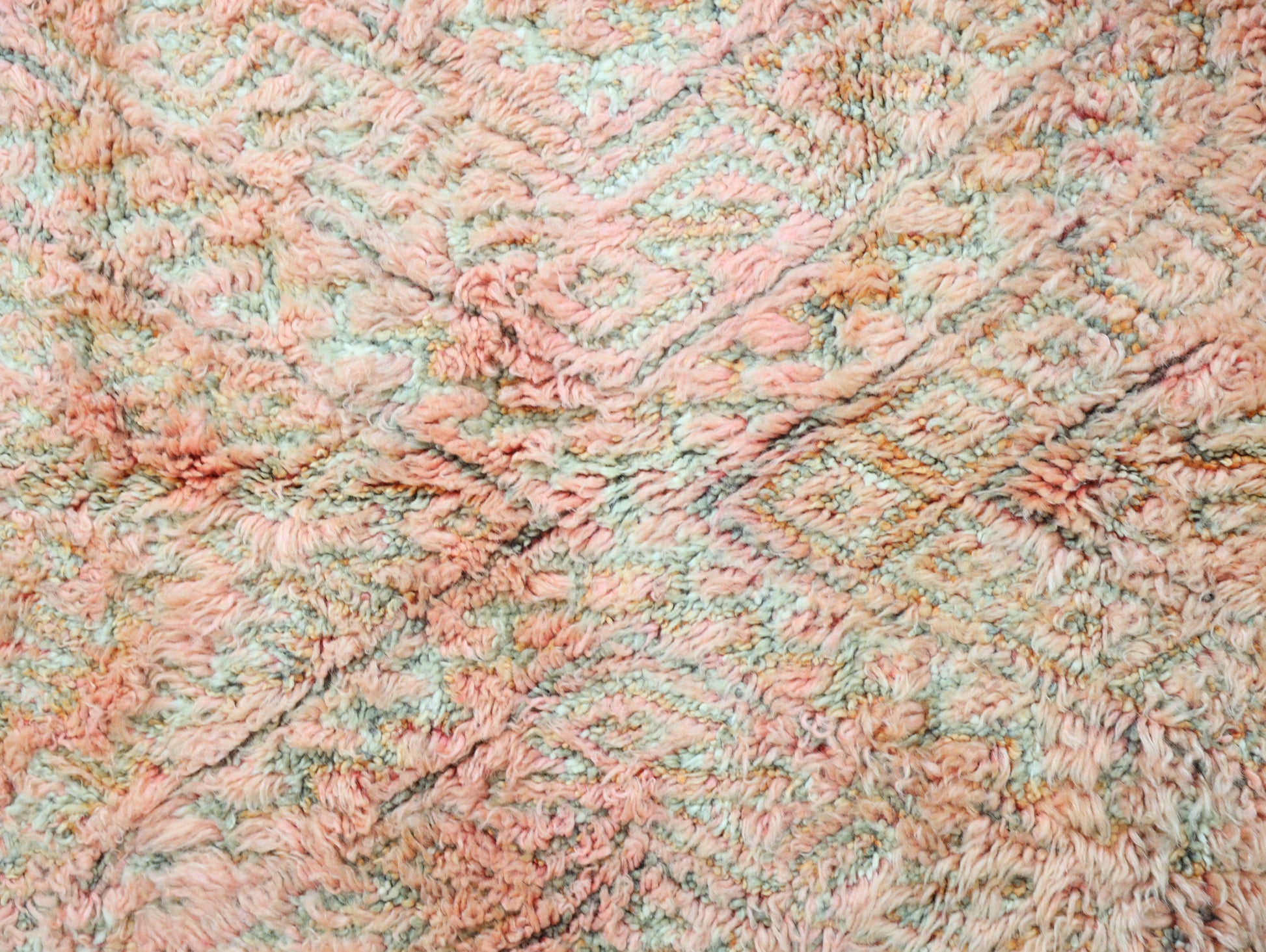Originating in the Holy town of Boujad, these rugs, woven by diverse tribes, exhibit a wide spectrum of color, composition, and weave. Described as surreal, mystic, and mesmerizing, Boujad rugs transport us to a world beyond reality. Their construction, with twice as many horizontal as vertical knots, renders them floppy and easy to move.