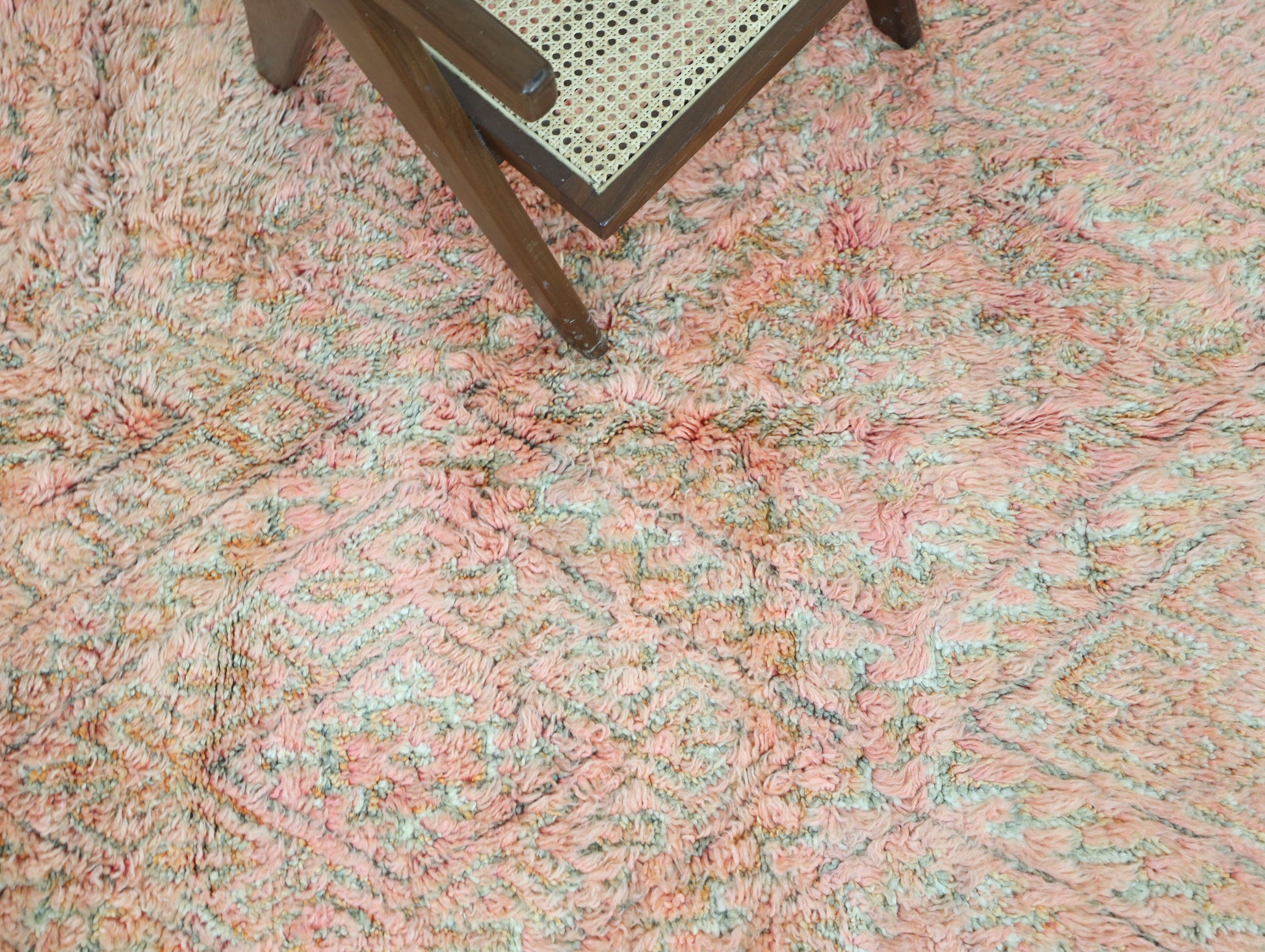 Wool, a sacred material for the Amazigh (Berber) people, forms the cornerstone of Moroccan rug design. Durable, long-lasting, and soft underfoot, wool is both functional and comfortable. In this piece, the wool pile is expertly knotted onto a wool foundation, adding substance and allowing it to gracefully embrace the floor.