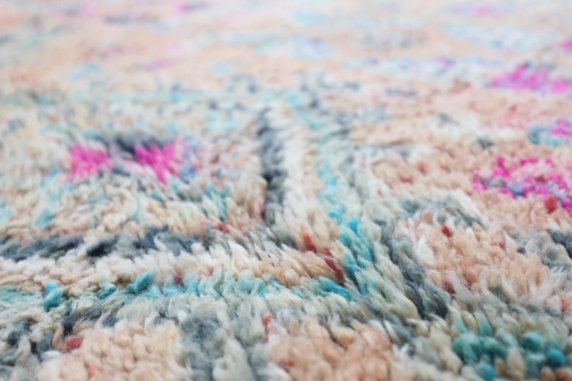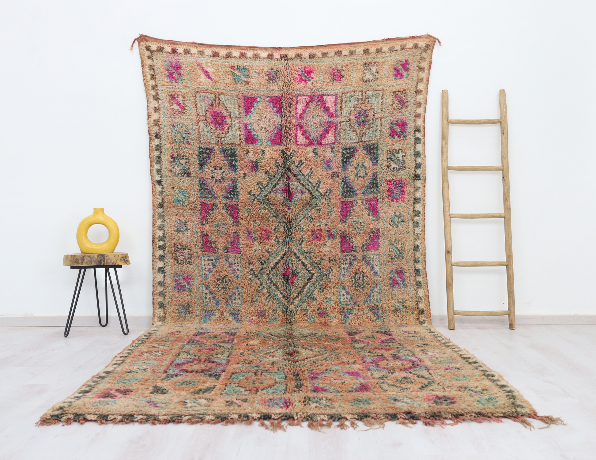 Wool, a sacred material for the Amazigh (Berber) people, forms the cornerstone of Moroccan rug design. Durable, long-lasting, and soft underfoot, wool is both functional and comfortable. In this piece, the wool pile is expertly knotted onto a wool foundation, adding substance and allowing it to gracefully embrace the floor.