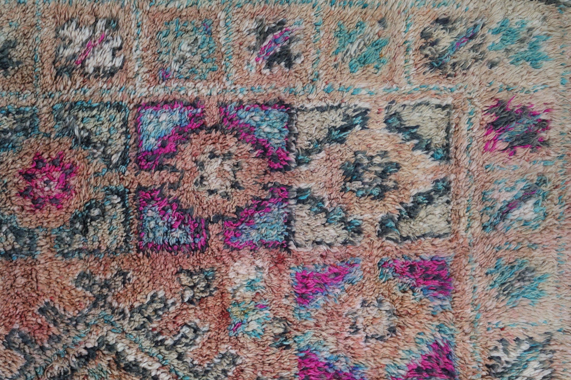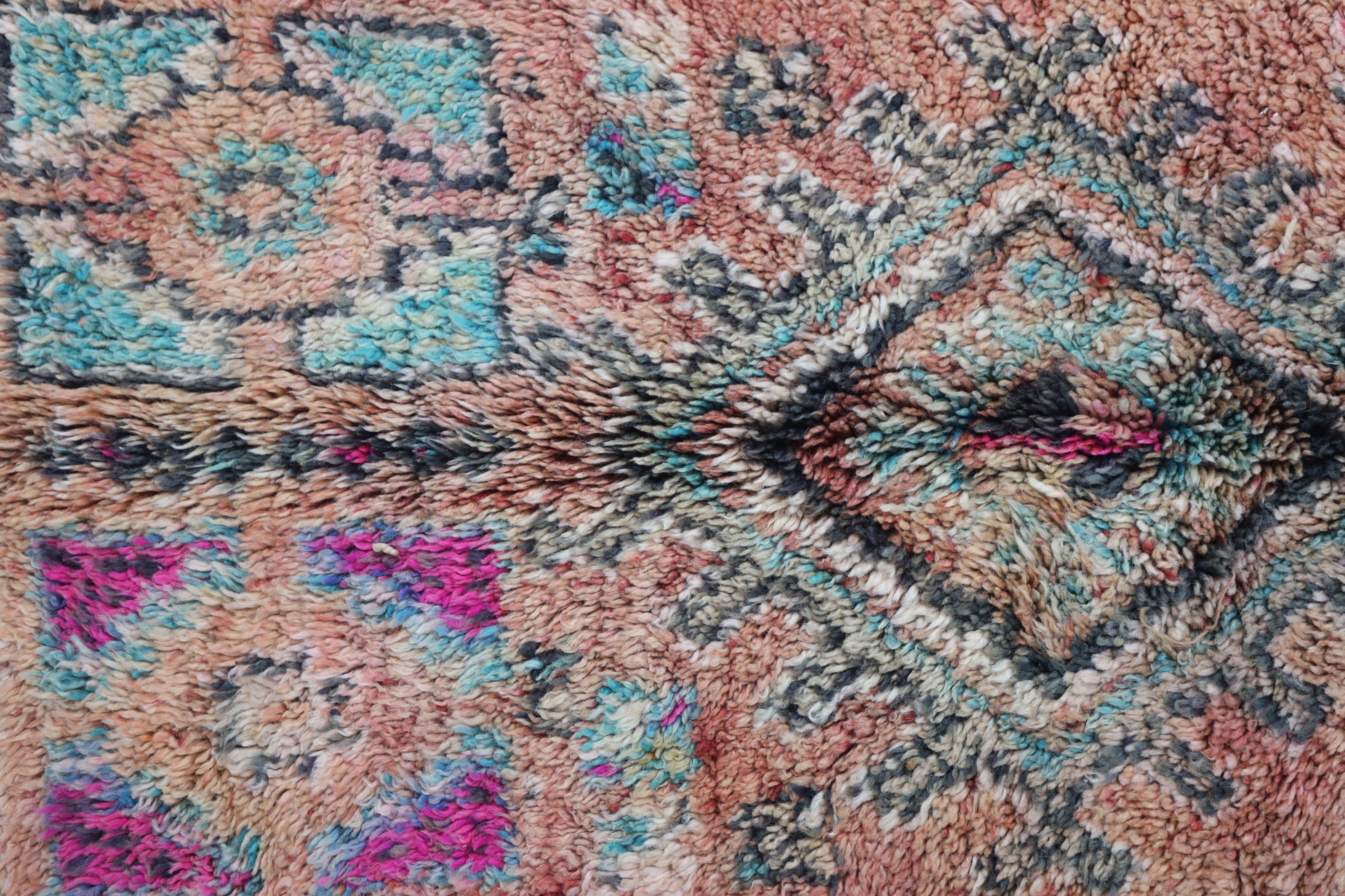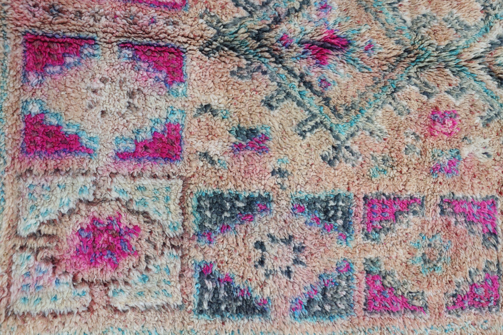 Originating in the Holy town of Boujad, these rugs, woven by diverse tribes, exhibit a wide spectrum of color, composition, and weave. Described as surreal, mystic, and mesmerizing, Boujad rugs transport us to a world beyond reality. Their construction, with twice as many horizontal as vertical knots, renders them floppy and easy to move.
