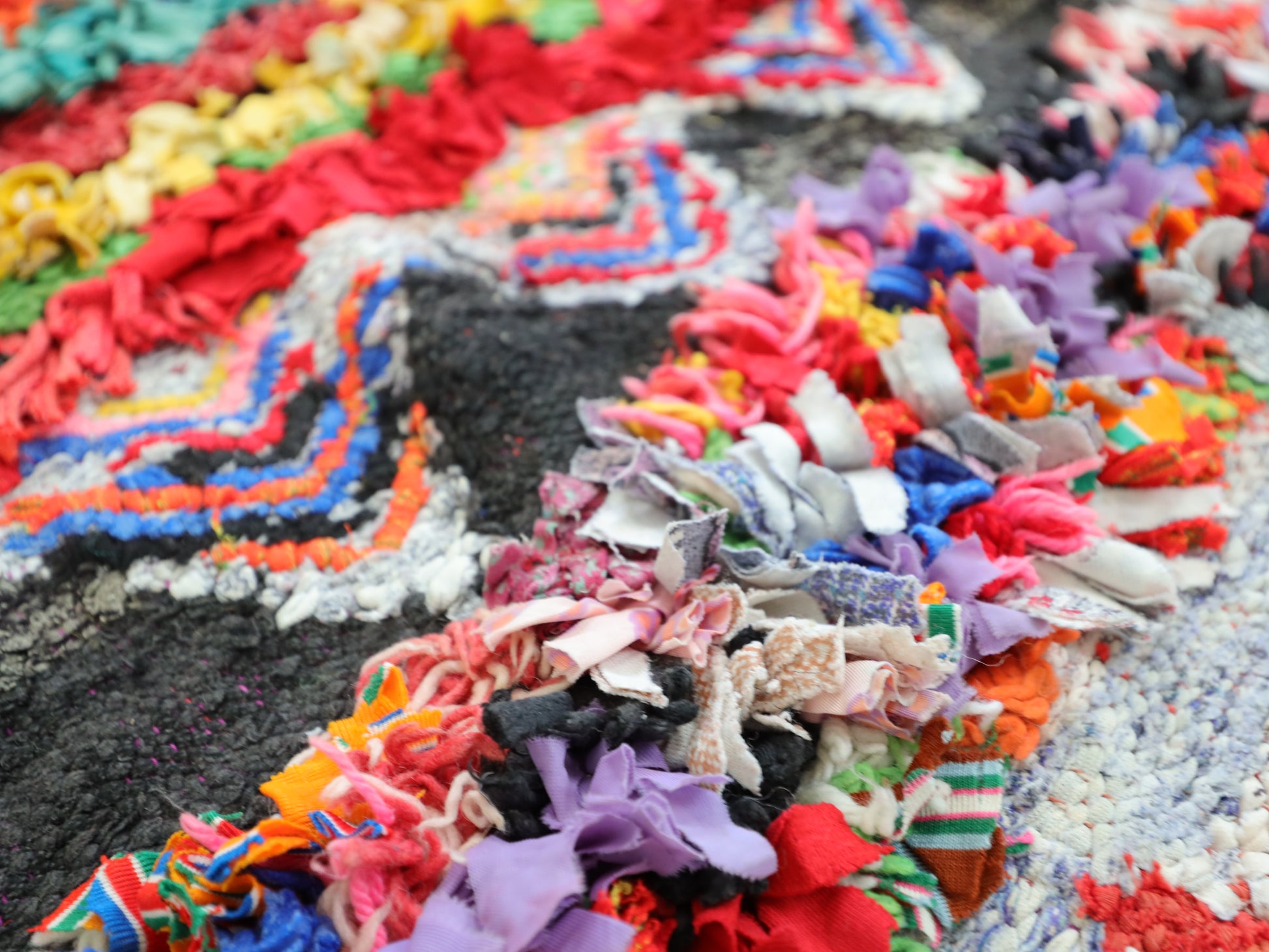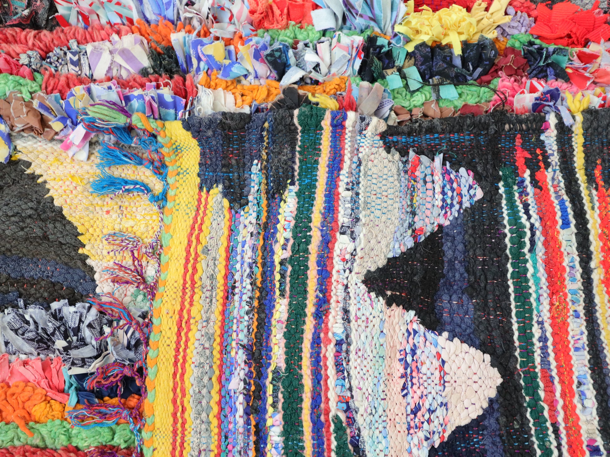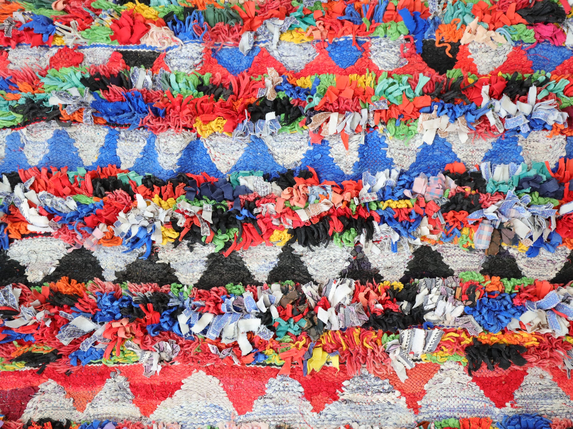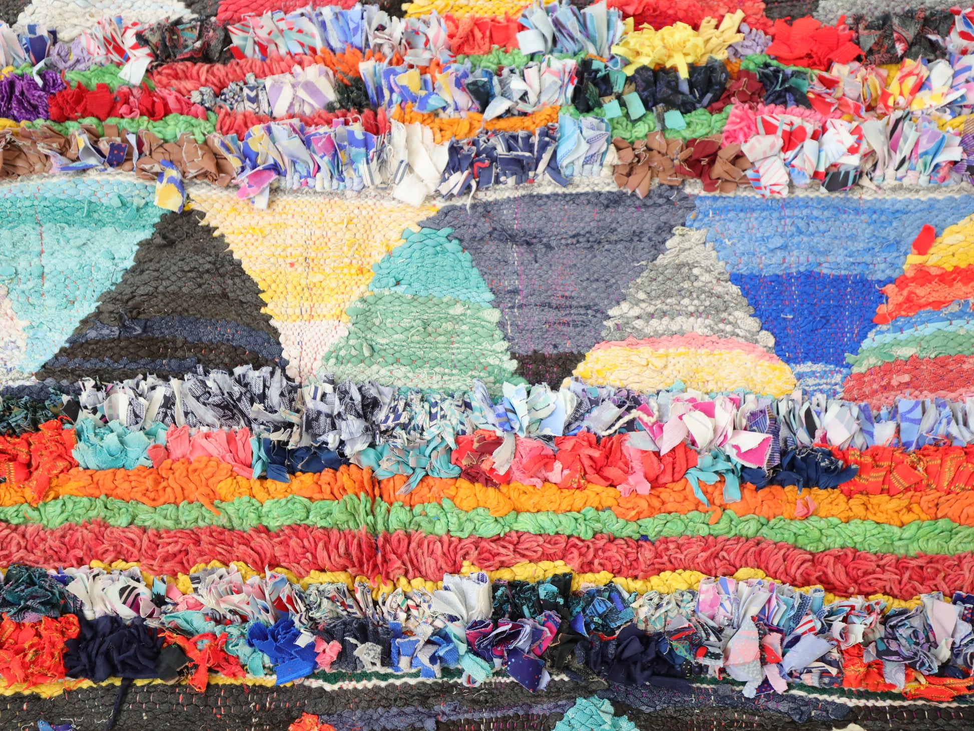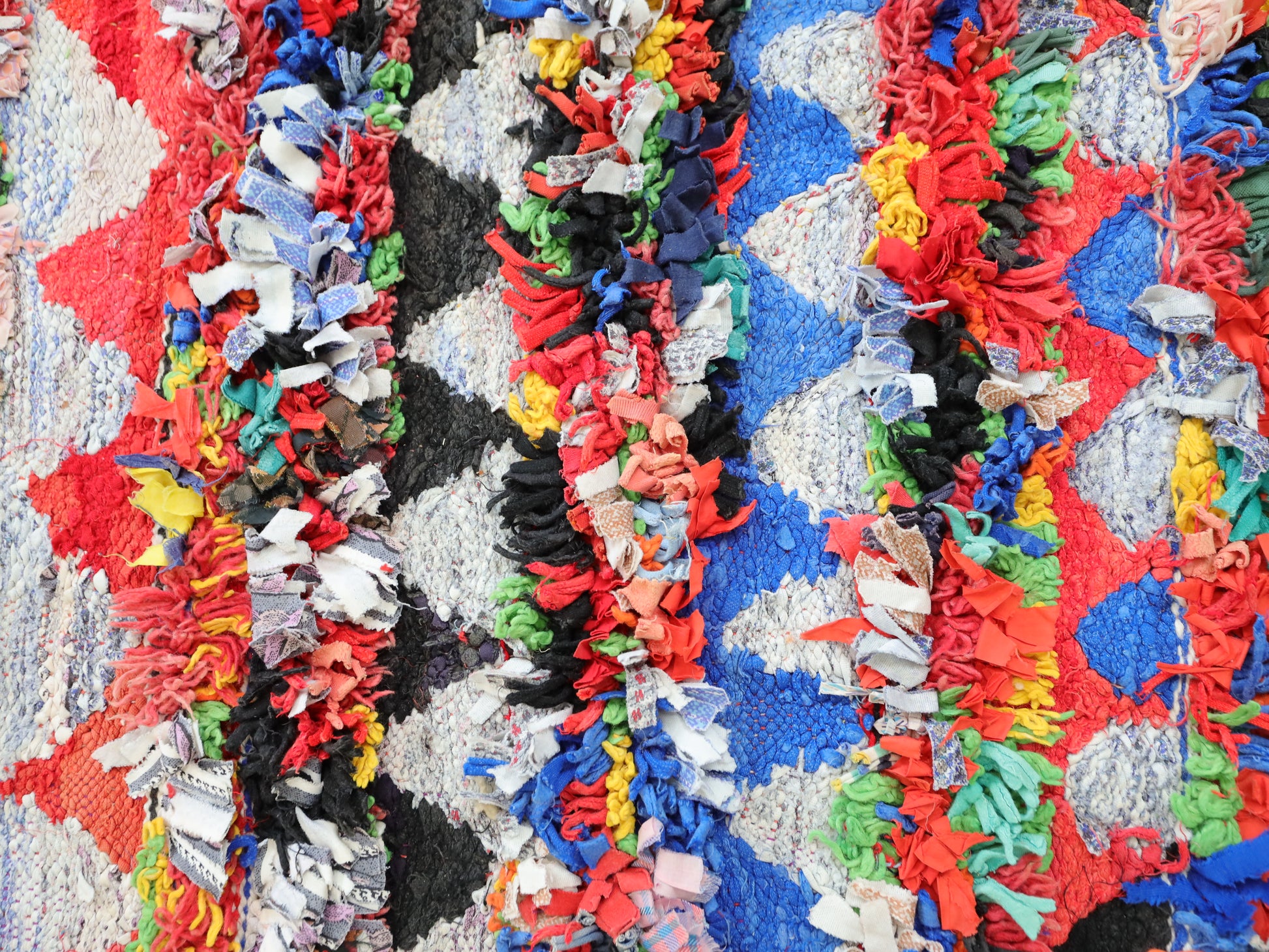 An unparalleled vintage masterpiece, carefully crafted by Berber Tribes in the Boucherouite style using upcycled textiles. Measurements: 5'5" x 11'2" (167 cm x 340 cm),