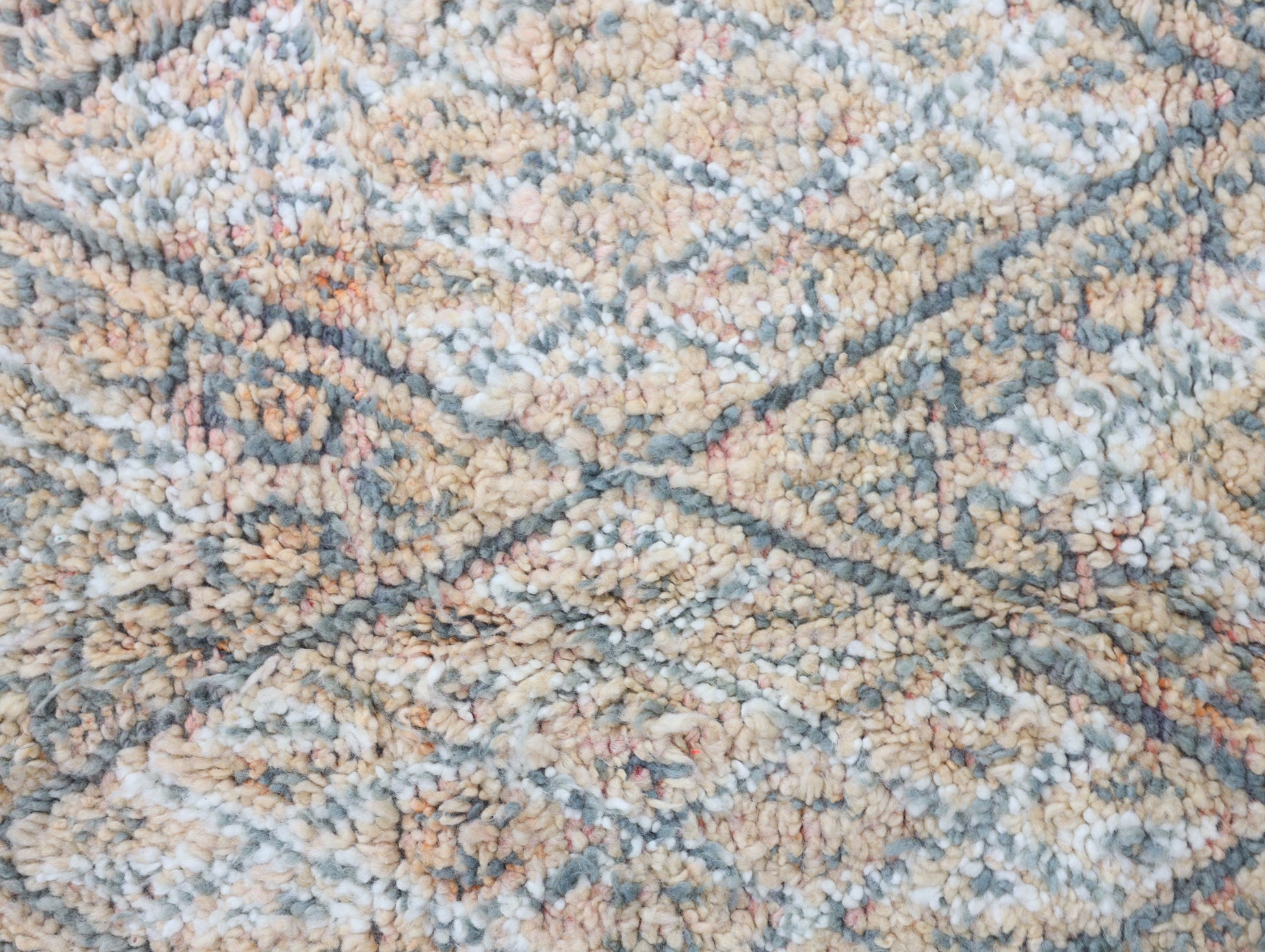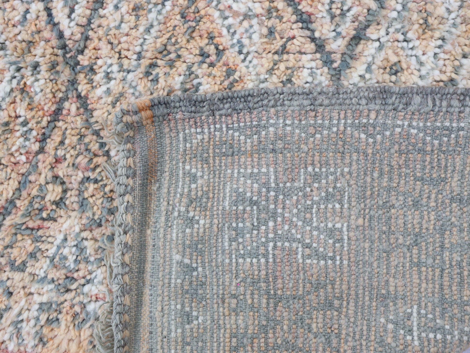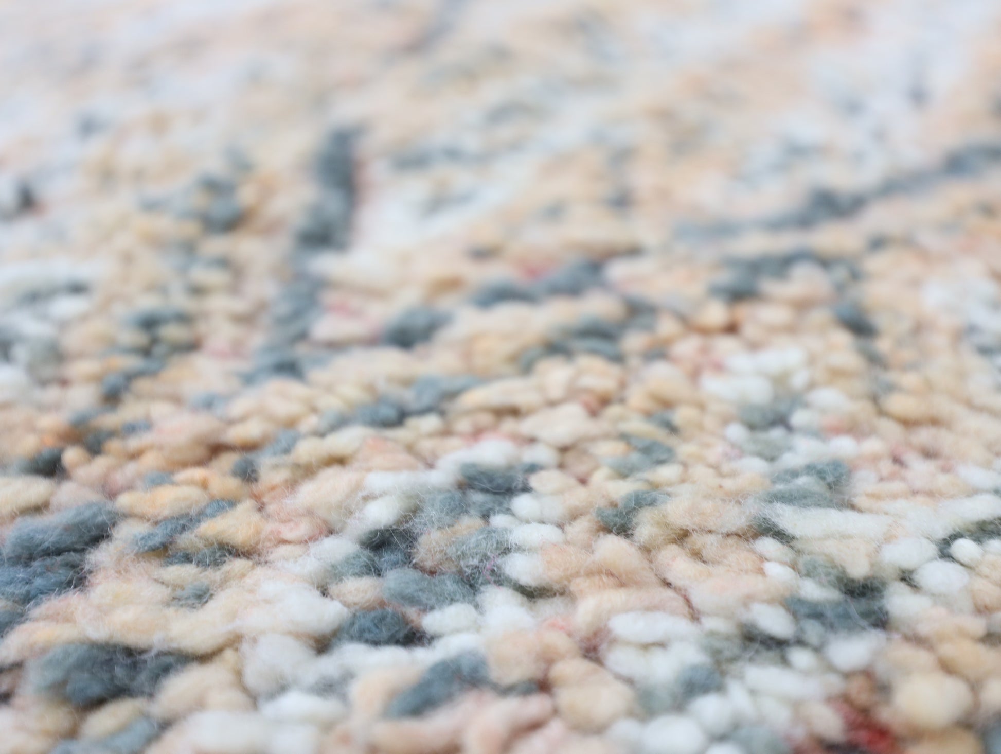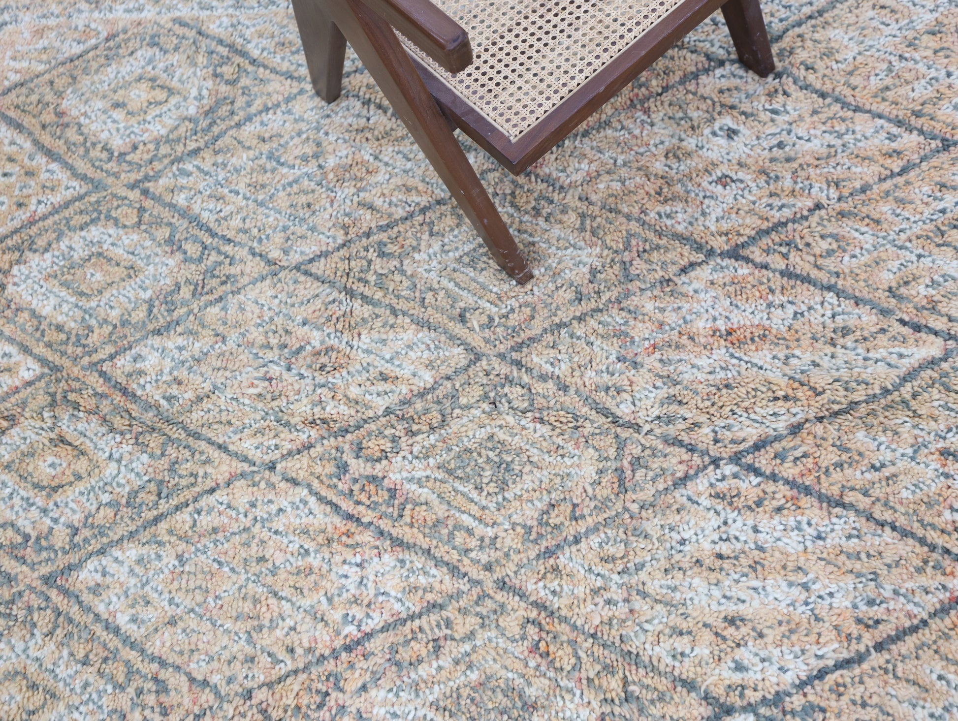 Wool, a sacred material for the Amazigh (Berber) people, forms the cornerstone of Moroccan rug design. Durable, long-lasting, and soft underfoot, wool is both functional and comfortable. In this piece, the wool pile is expertly knotted onto a wool foundation, adding substance and allowing it to gracefully embrace the floor.