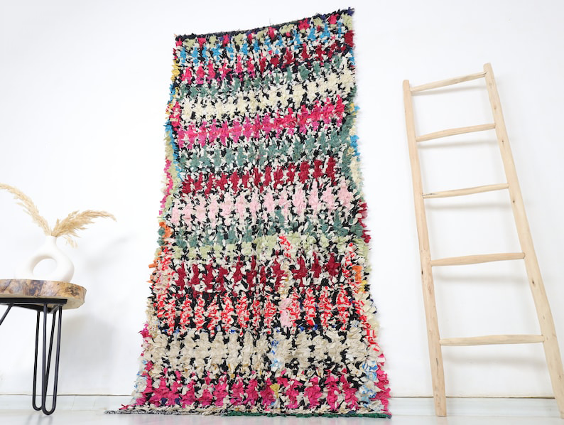 An unparalleled vintage masterpiece, carefully crafted  by Berber Tribes in the Boucherouite style using upcycled textiles. Measurements: 3'3" x 7'0" (99 cm x 213 cm),