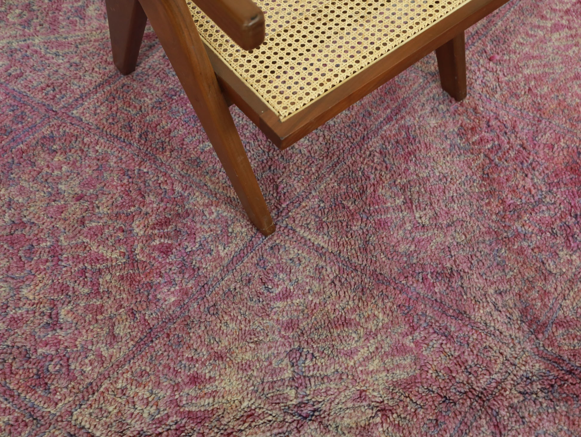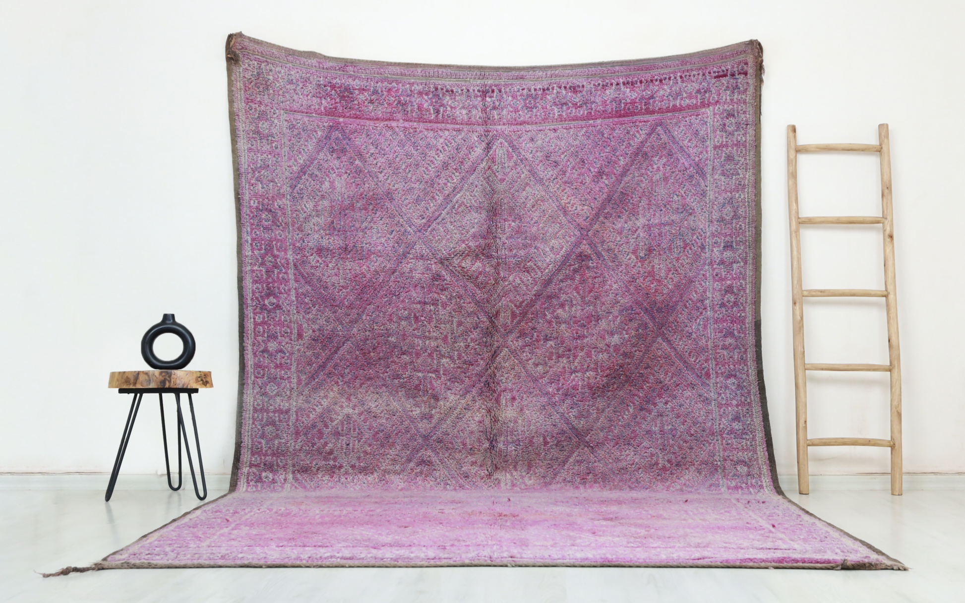 Originating in the Holy town of Boujad, these rugs, woven by diverse tribes, exhibit a wide spectrum of color, composition, and weave. Described as surreal, mystic, and mesmerizing, Boujad rugs transport us to a world beyond reality. Their construction, with twice as many horizontal as vertical knots, renders them floppy and easy to move.