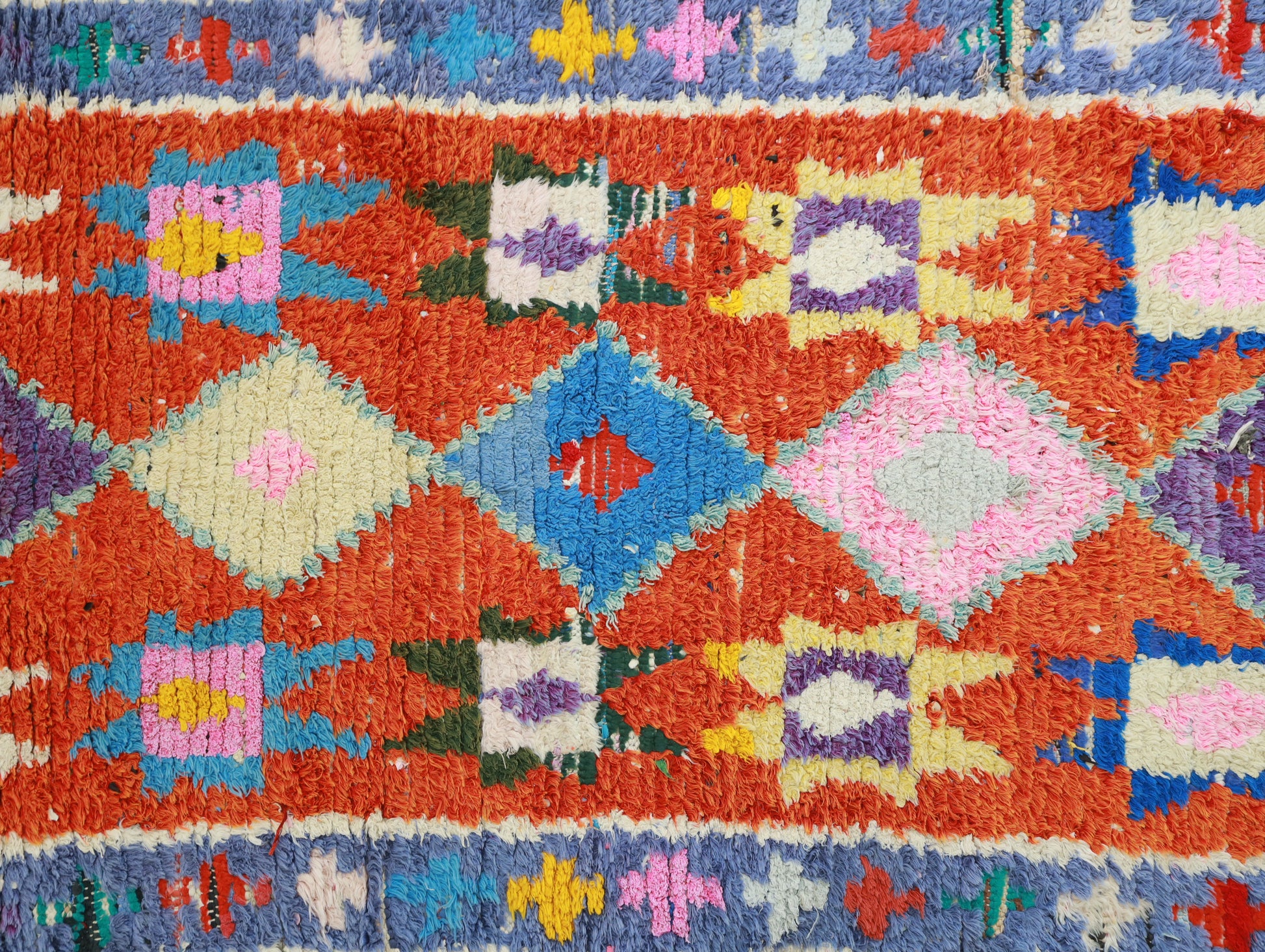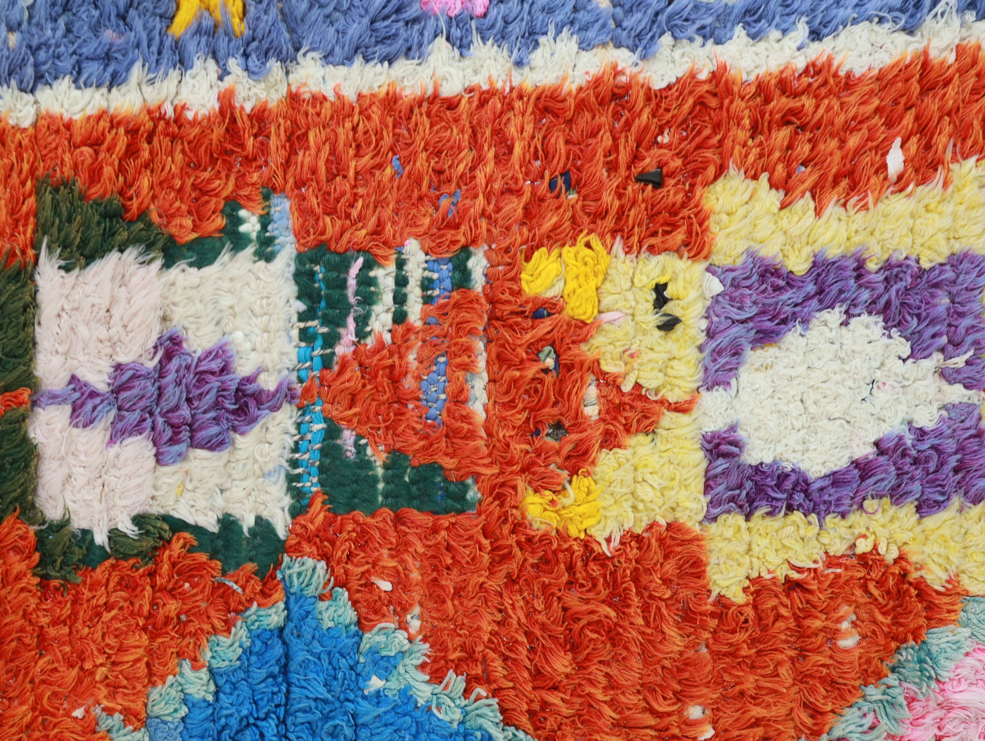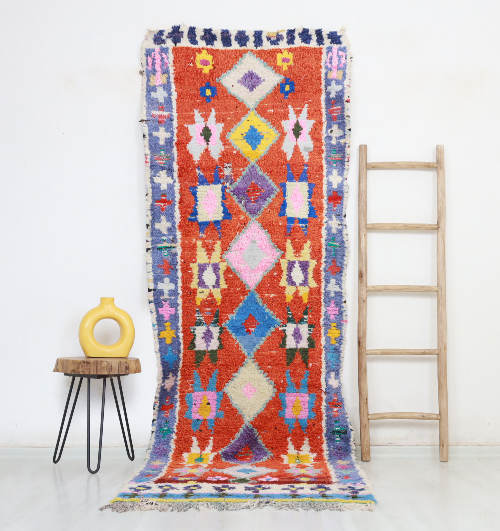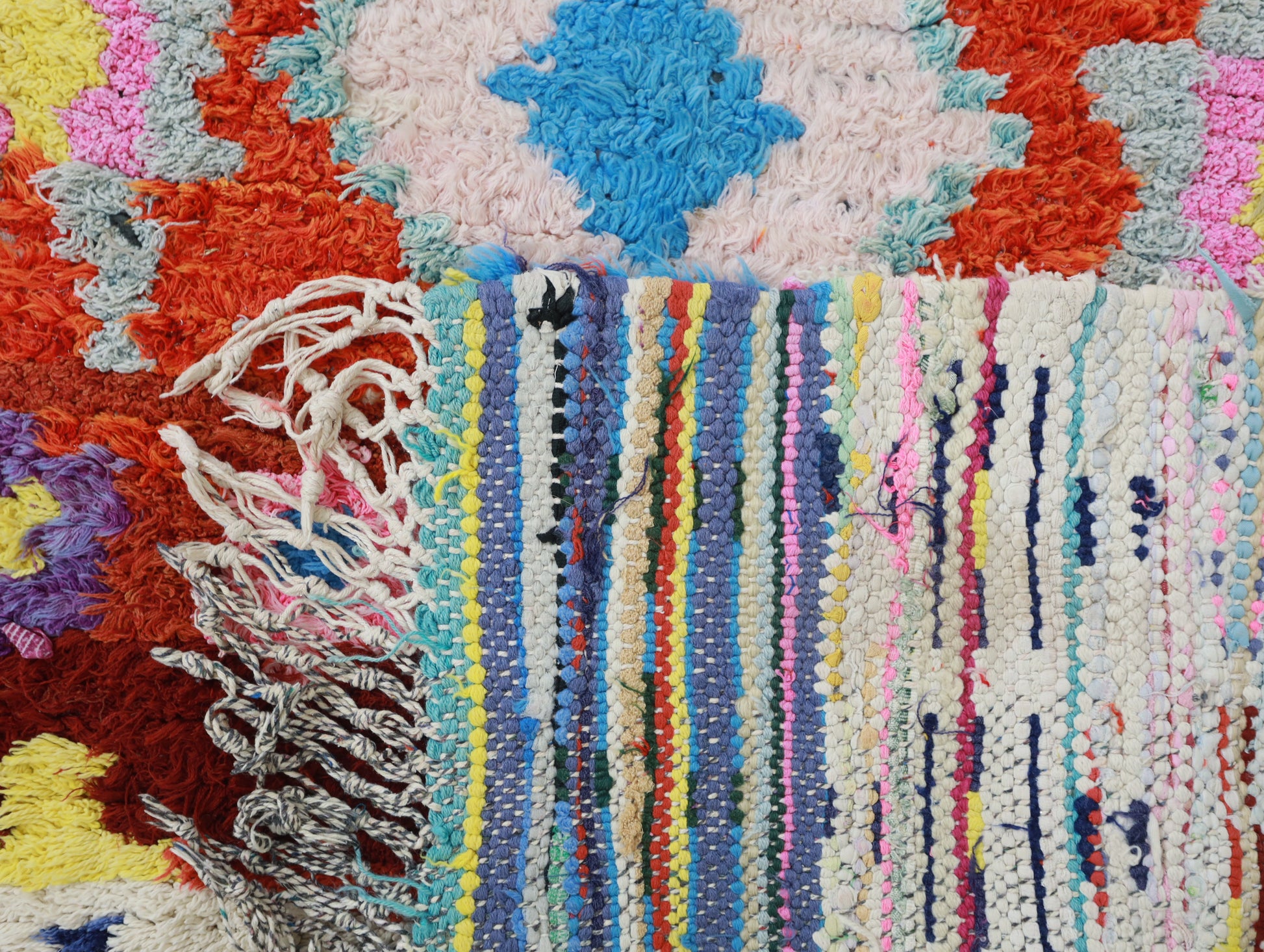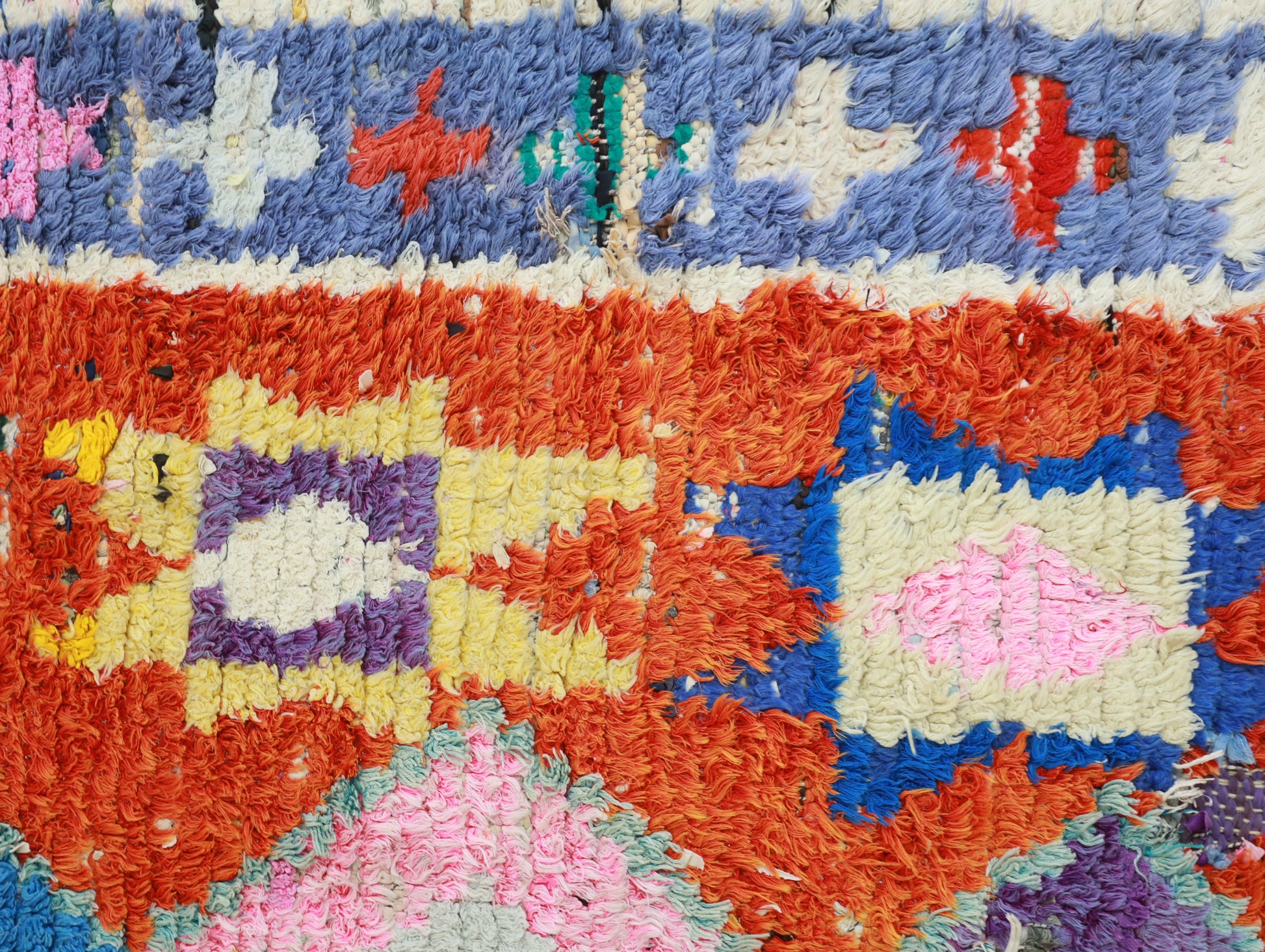 An unparalleled vintage masterpiece, carefully crafted by Berber Tribes in the Boucherouite style using upcycled textiles. Measurements: 3'3" x 9'5" (100 cm x 290 cm),