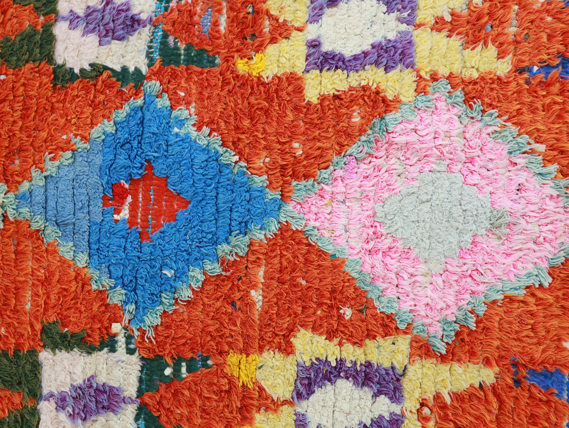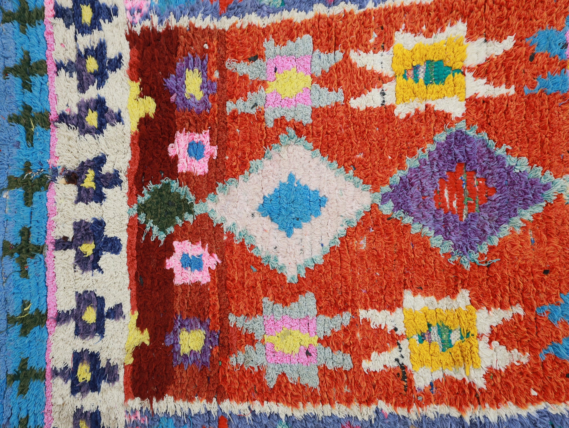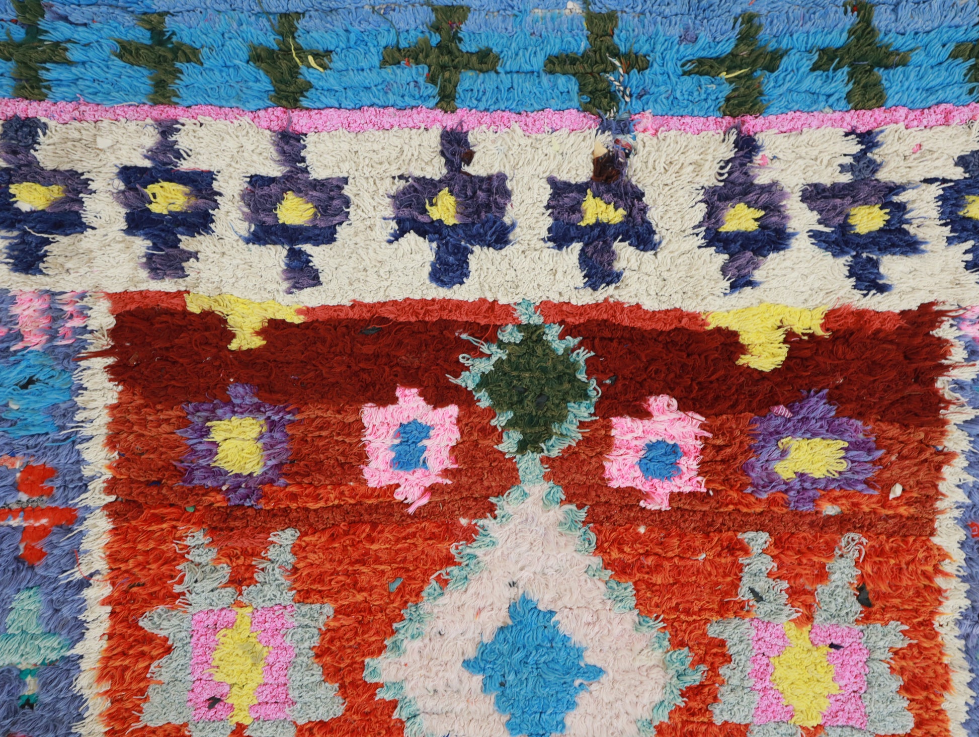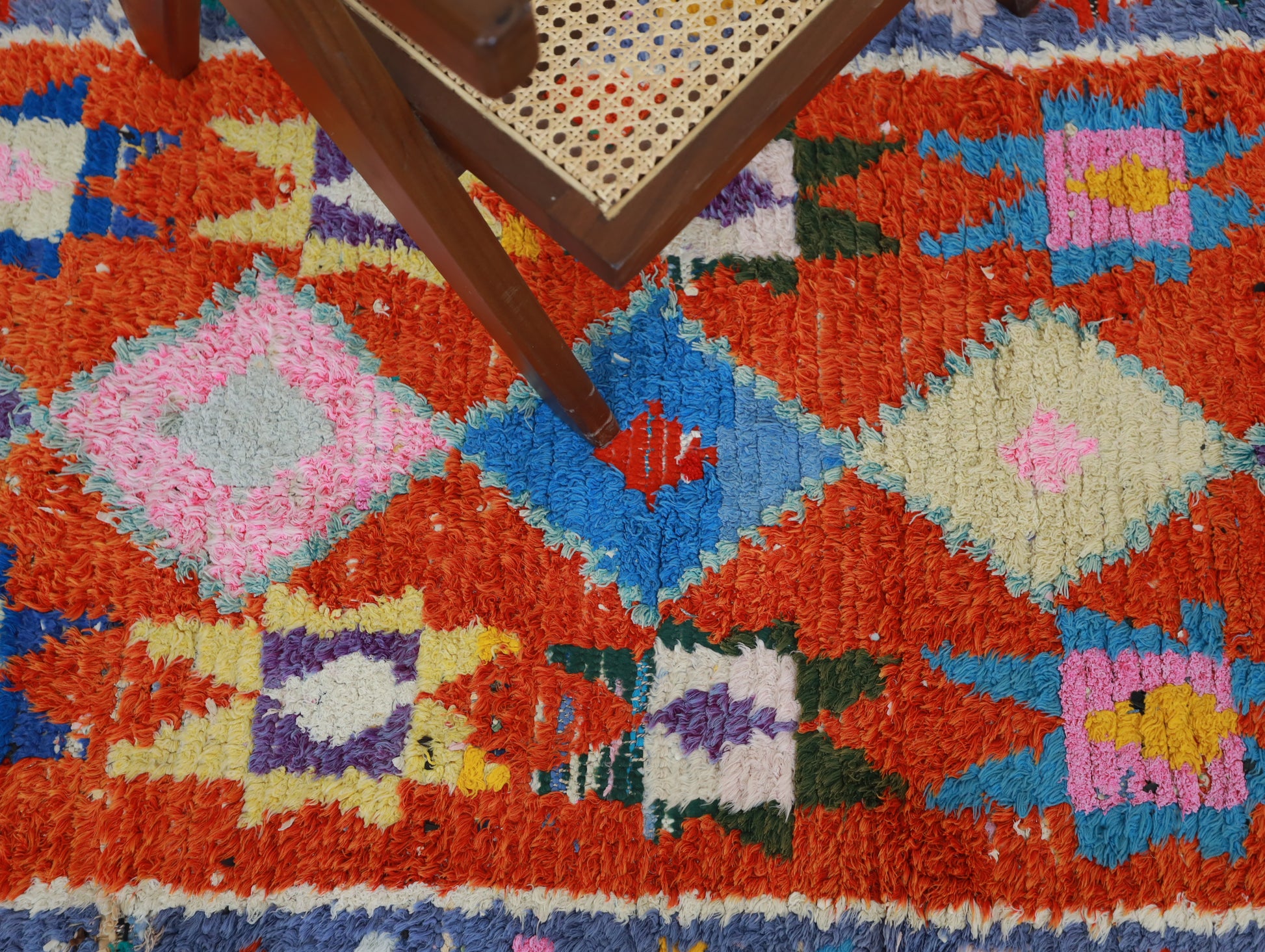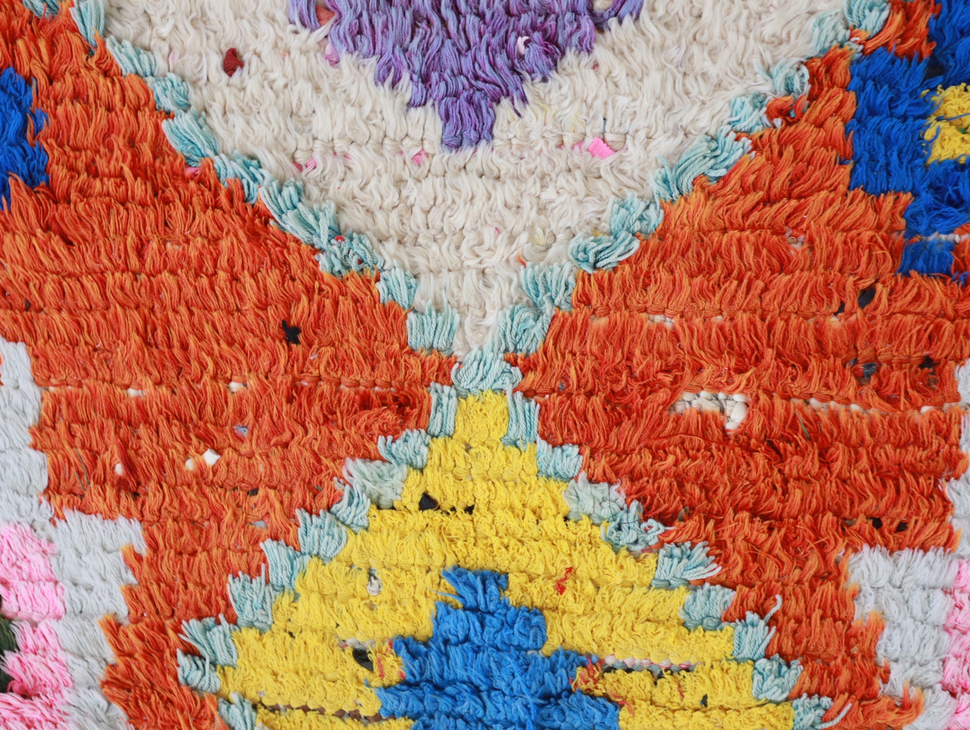 Azilal rugs boast abstract, painterly designs reminiscent of rugs from Ourika. What sets them apart is a vibrant color palette, achieved through the incorporation of cotton alongside wool..