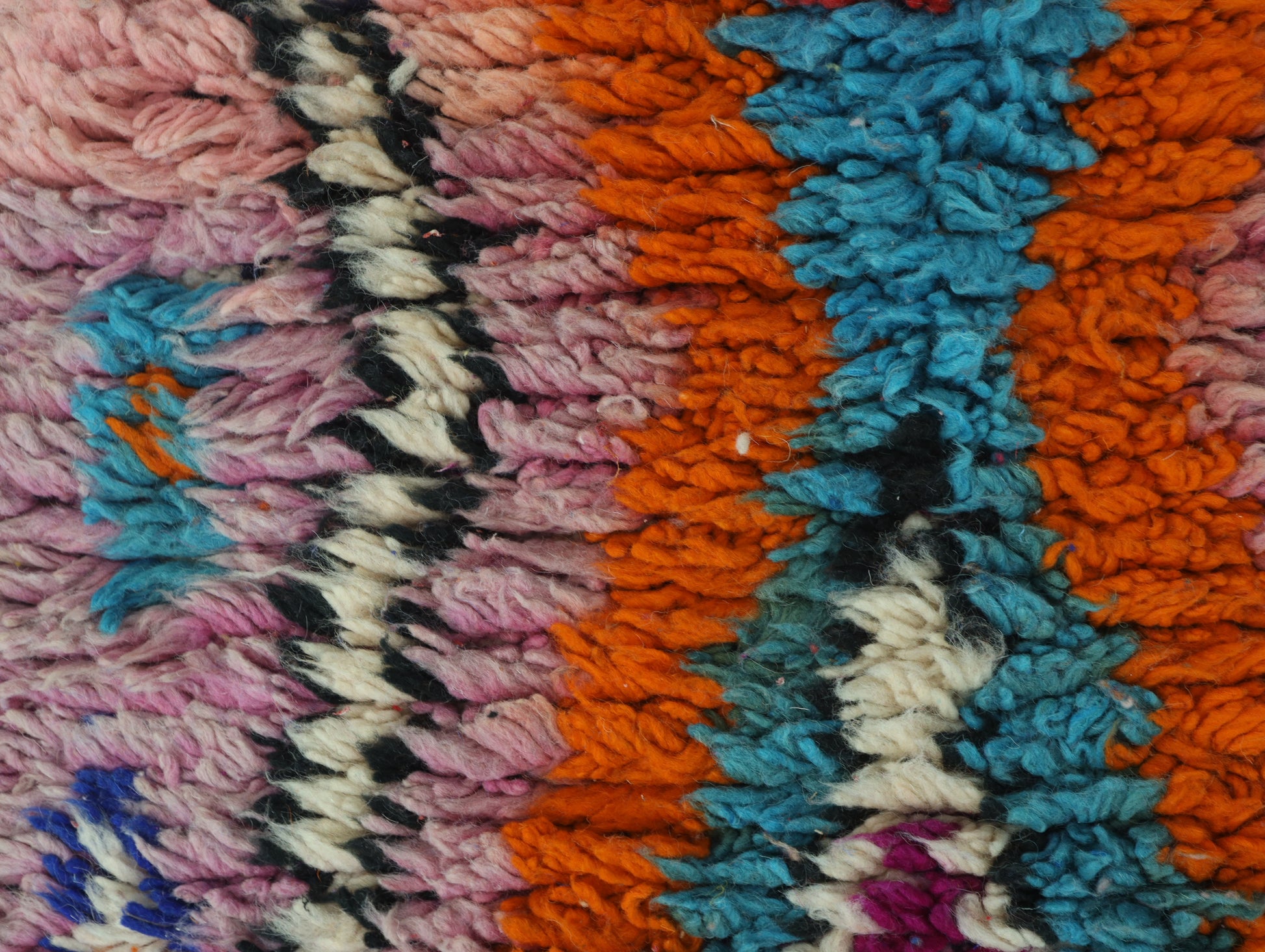 Originating in the Holy town of Boujad, these rugs, woven by diverse tribes, exhibit a wide spectrum of color, composition, and weave. Described as surreal, mystic, and mesmerizing, Boujad rugs transport us to a world beyond reality. Their construction, with twice as many horizontal as vertical knots, renders them floppy and easy to move.