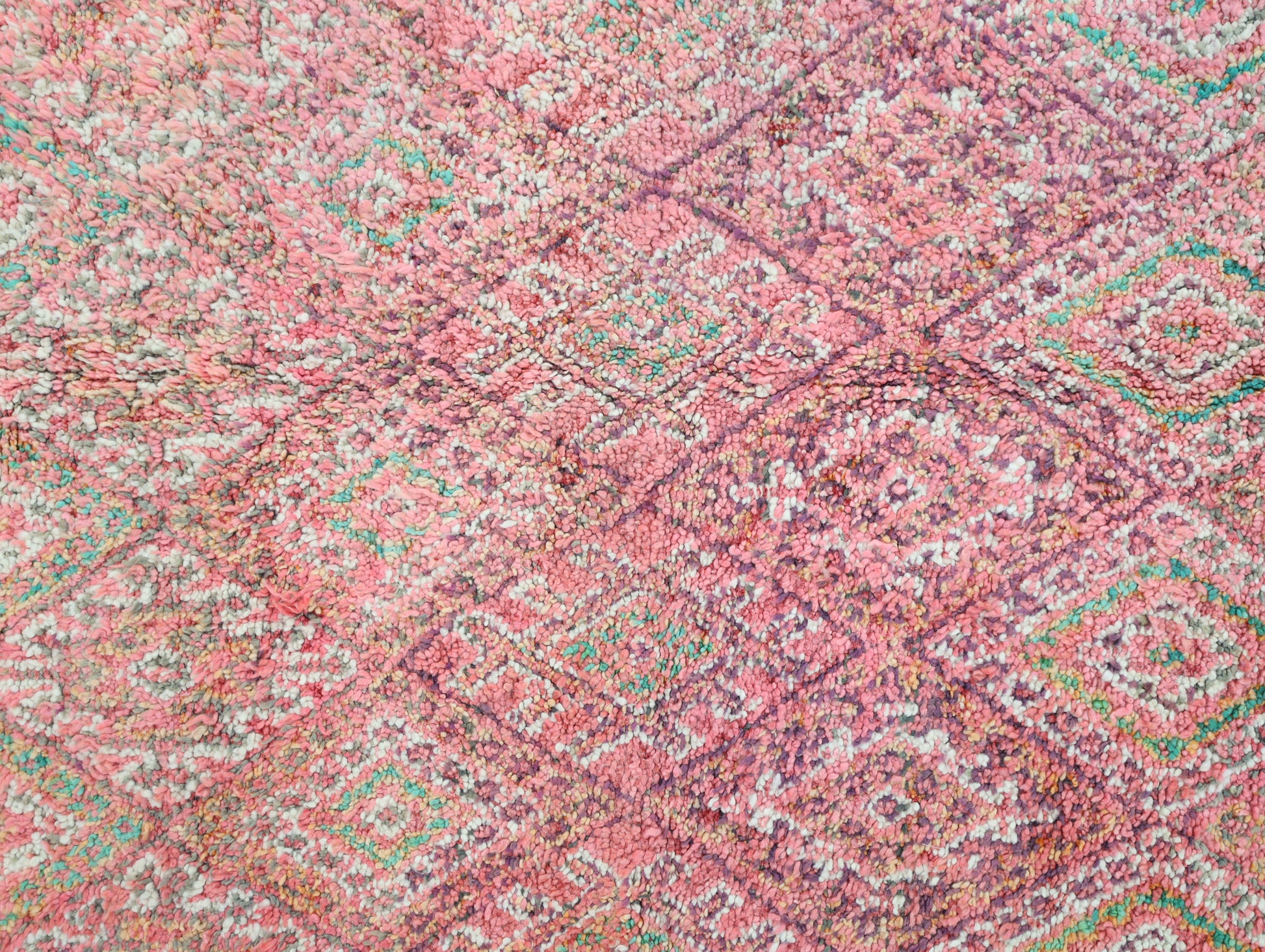 Originating in the Holy town of Boujad, these rugs, woven by diverse tribes, exhibit a wide spectrum of color, composition, and weave. Described as surreal, mystic, and mesmerizing, Boujad rugs transport us to a world beyond reality. Their construction, with twice as many horizontal as vertical knots, renders them floppy and easy to move.