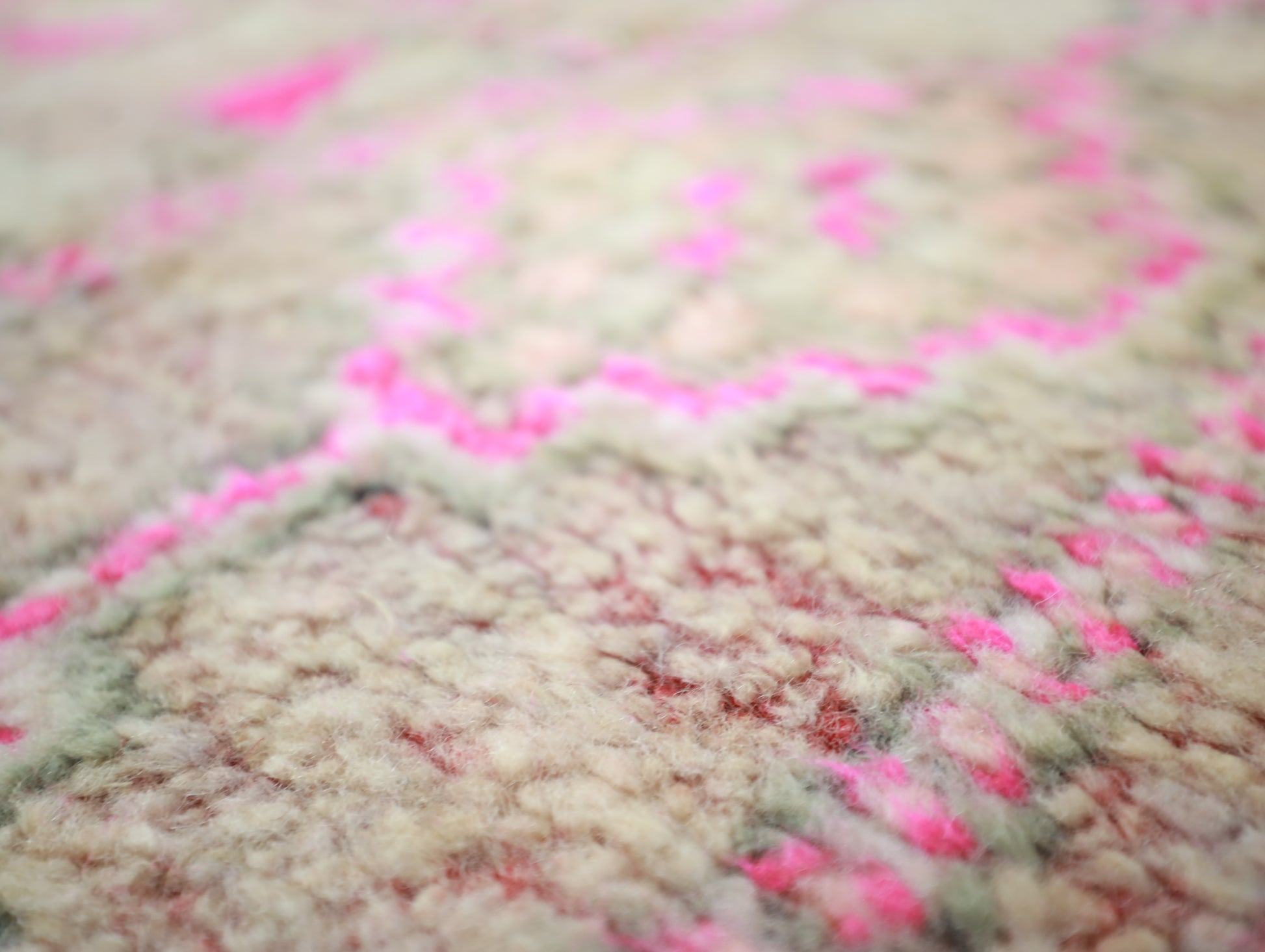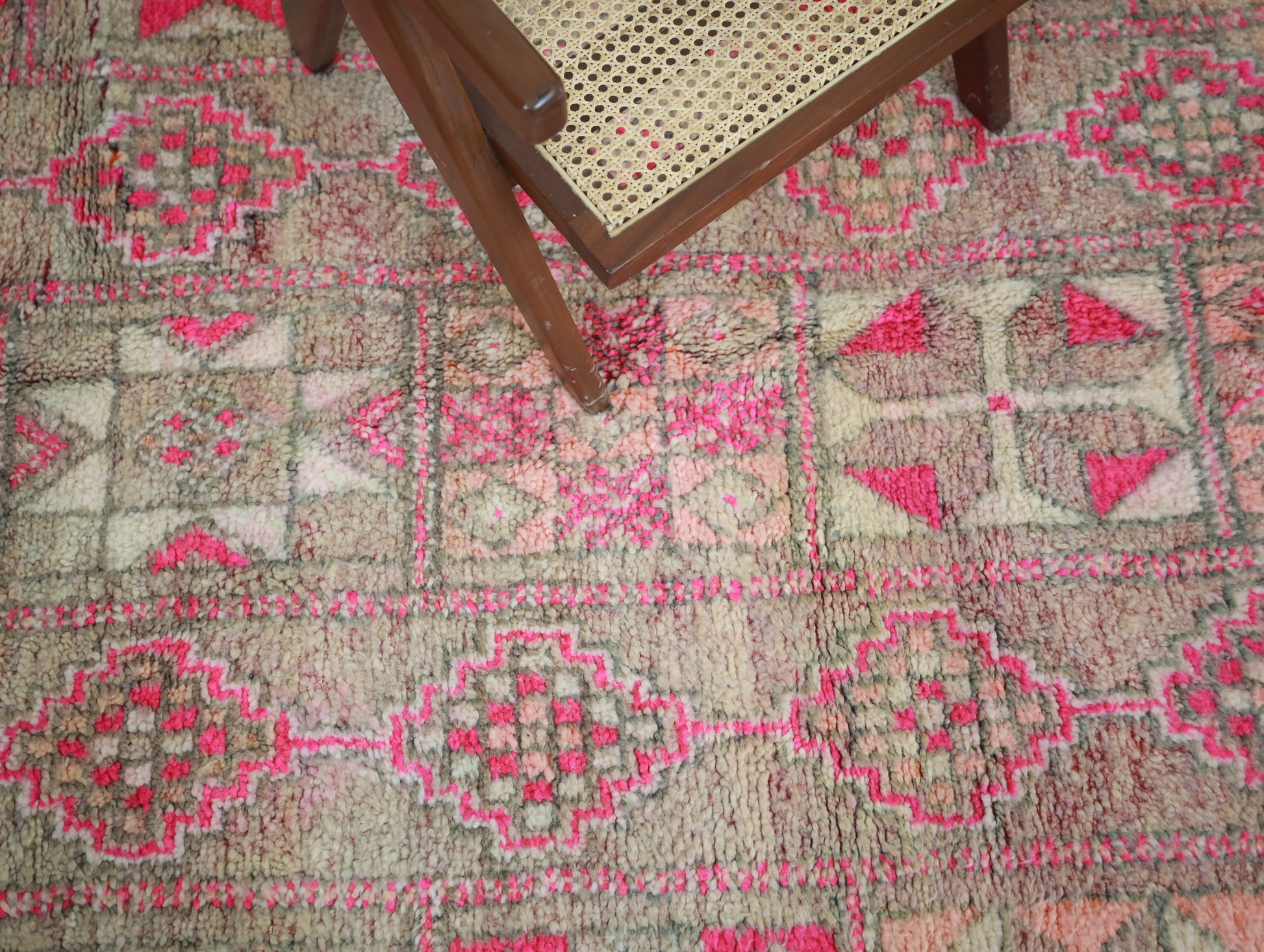 Wool, a sacred material for the Amazigh (Berber) people, forms the cornerstone of Moroccan rug design. Durable, long-lasting, and soft underfoot, wool is both functional and comfortable. In this piece, the wool pile is expertly knotted onto a wool foundation, adding substance and allowing it to gracefully embrace the floor.