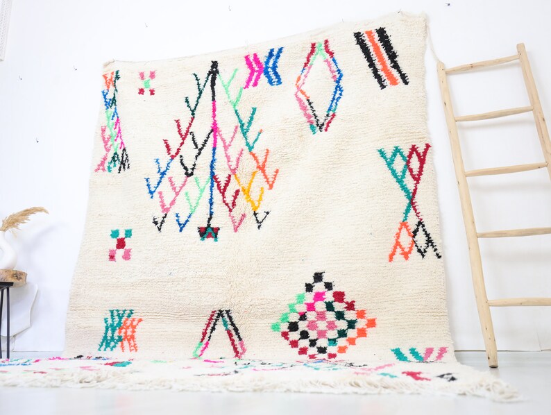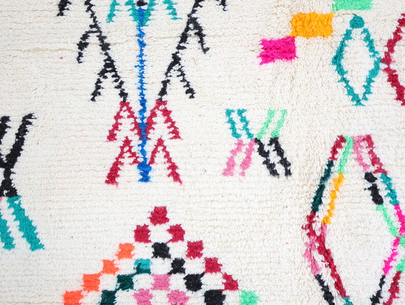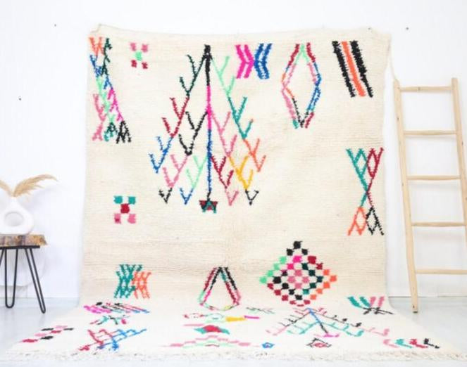 Azilal rugs boast abstract, painterly designs reminiscent of rugs from Ourika. What sets them apart is a vibrant color palette, achieved through the incorporation of cotton alongside wool.