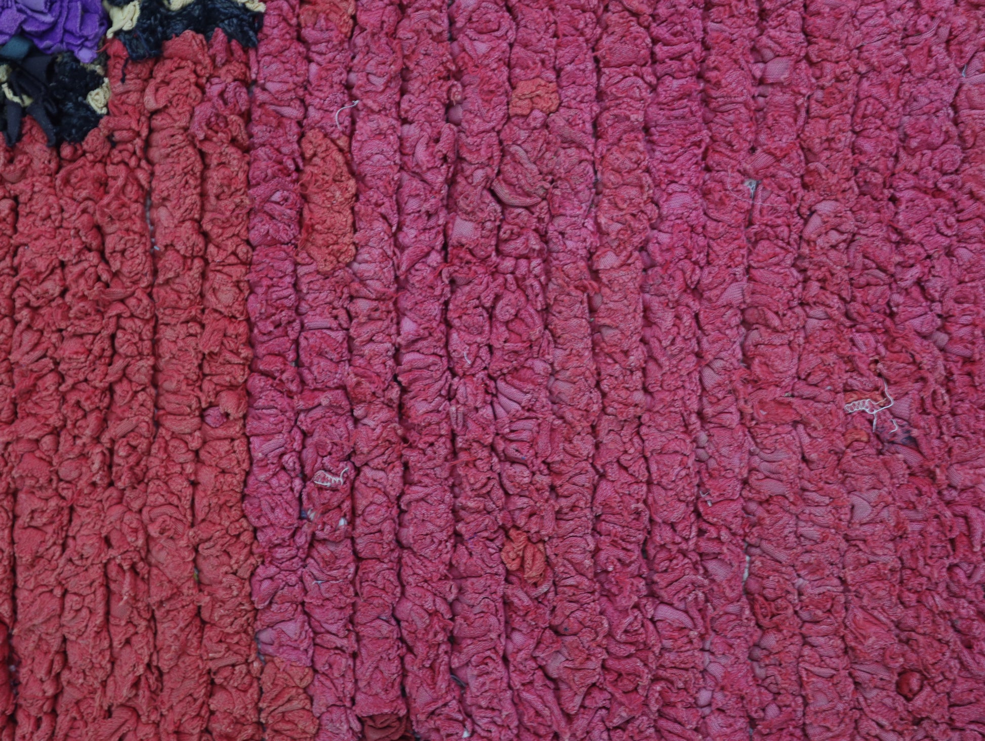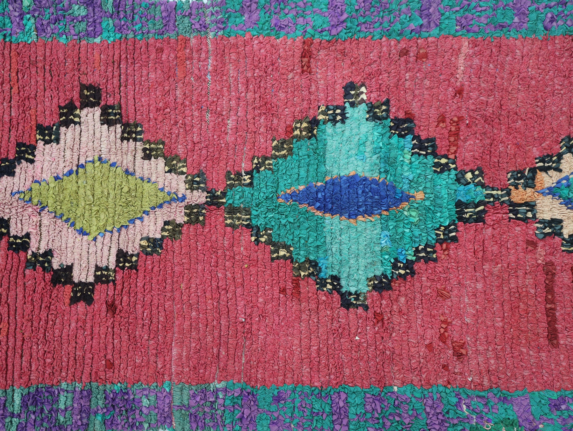 An unparalleled vintage masterpiece, carefully crafted by Berber Tribes in the Boucherouite style using upcycled textiles. Measurements: 3'3" x 8'1" (100 cm x 247 cm),