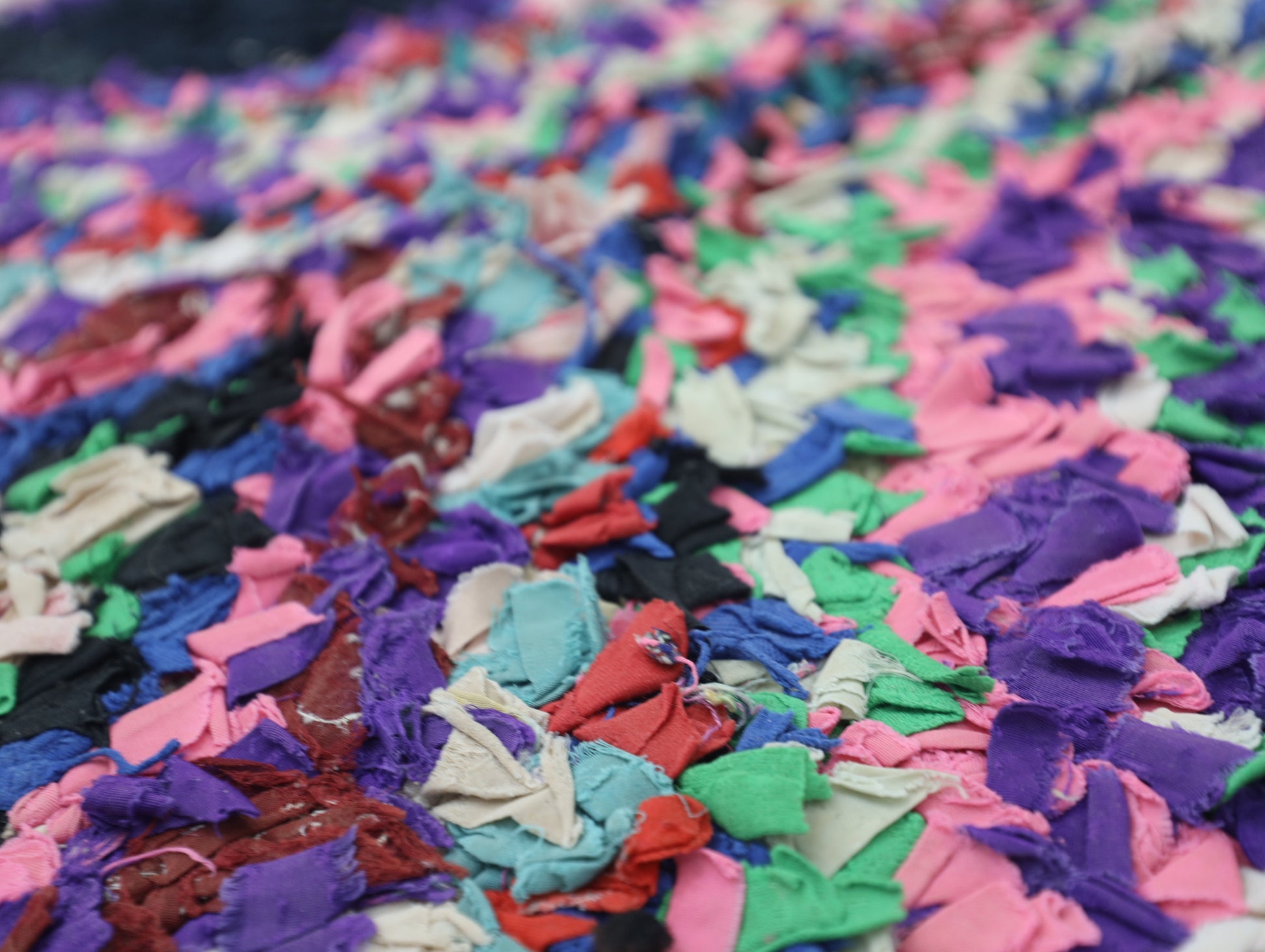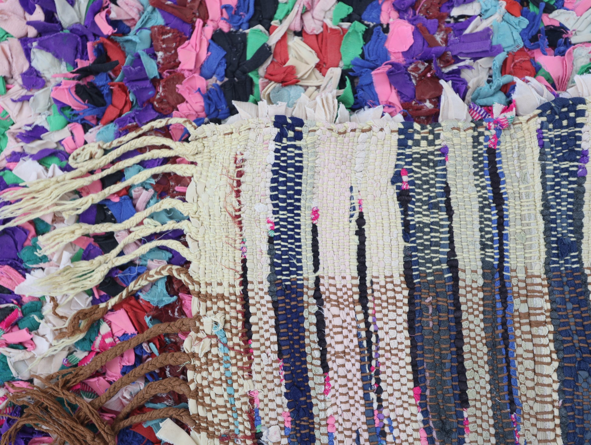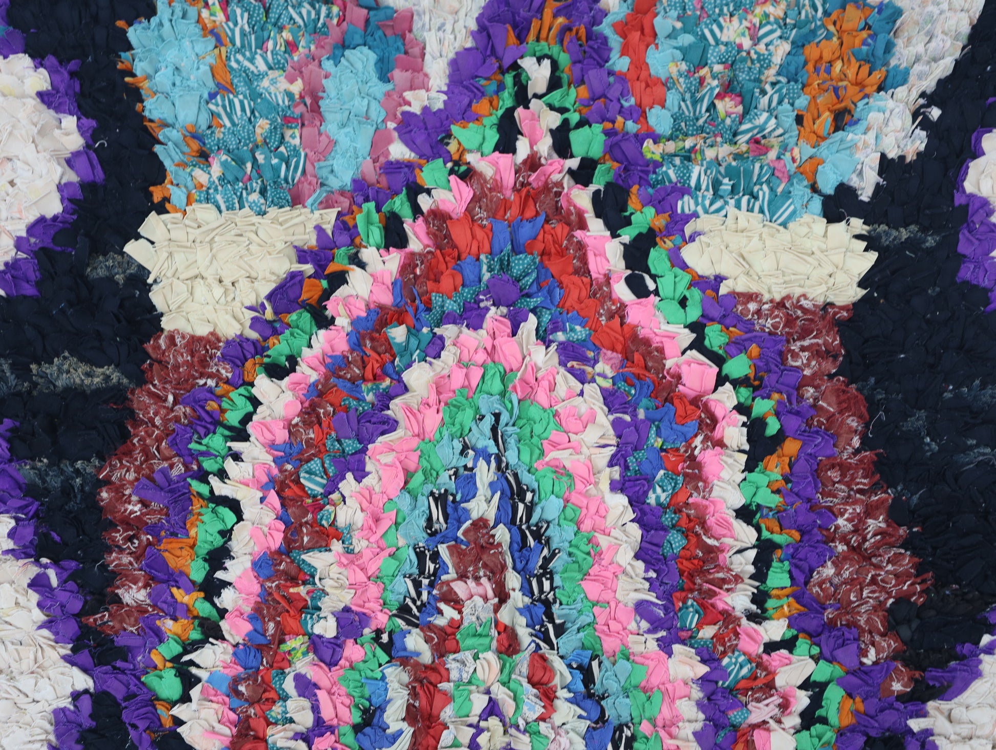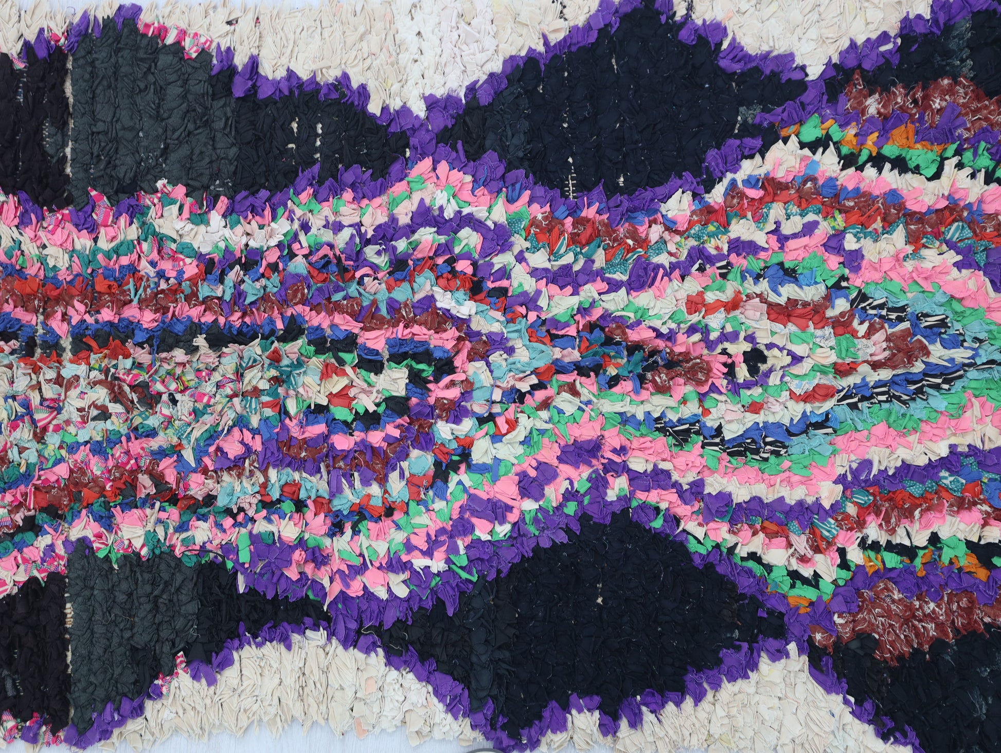 An unparalleled vintage masterpiece, carefully crafted by Berber Tribes in the Boucherouite style using upcycled textiles. Measurements: 3'3" x 5'8" (100 cm x 177 cm),