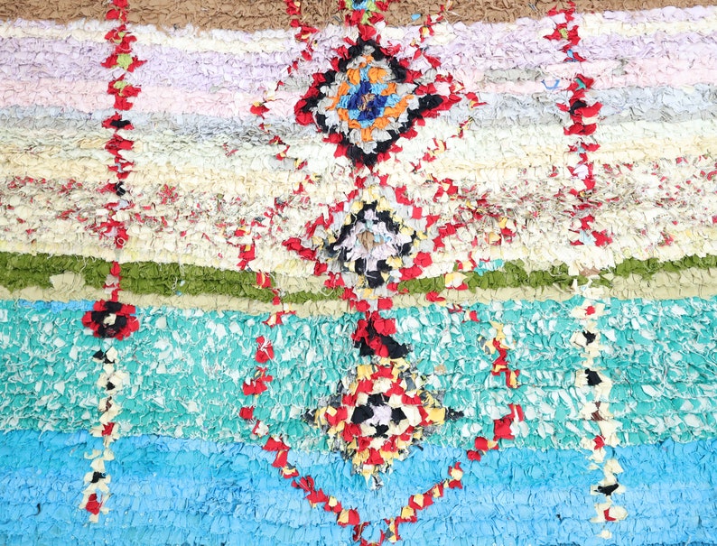 An unparalleled vintage masterpiece, carefully crafted by Berber Tribes in the Boucherouite style using upcycled textiles. Measurements: 4'7" x 9'2" (140 cm x 280 cm),