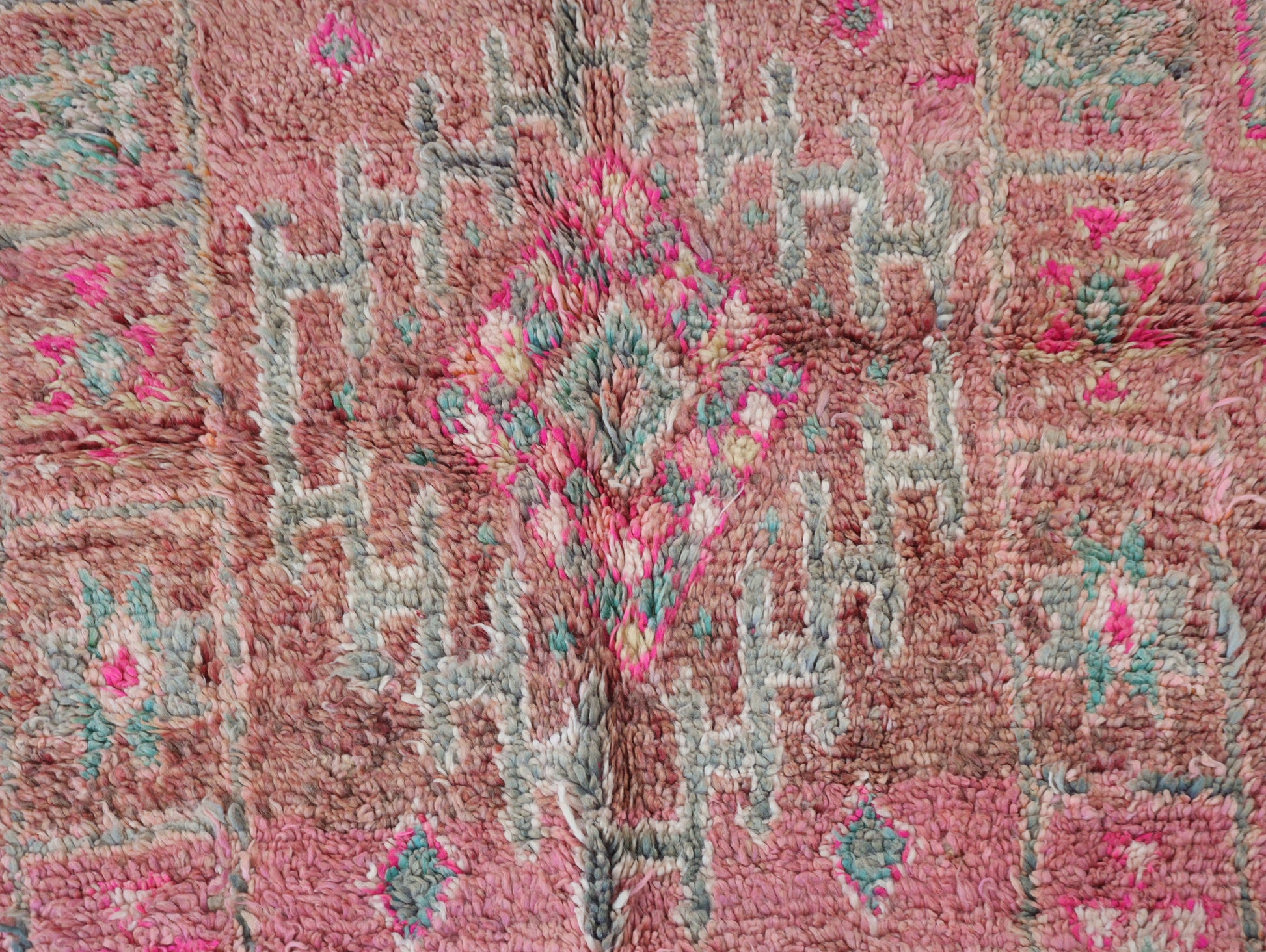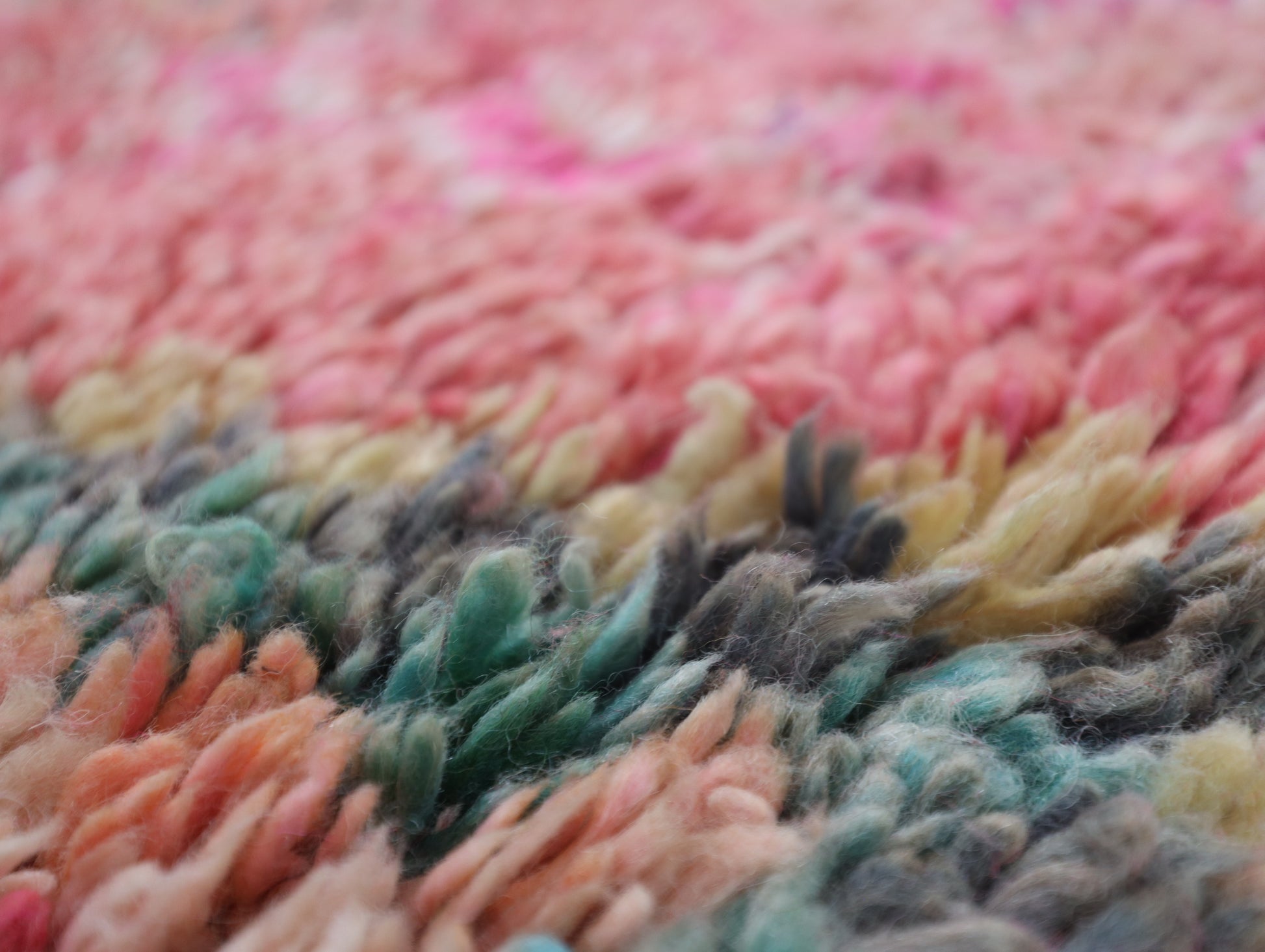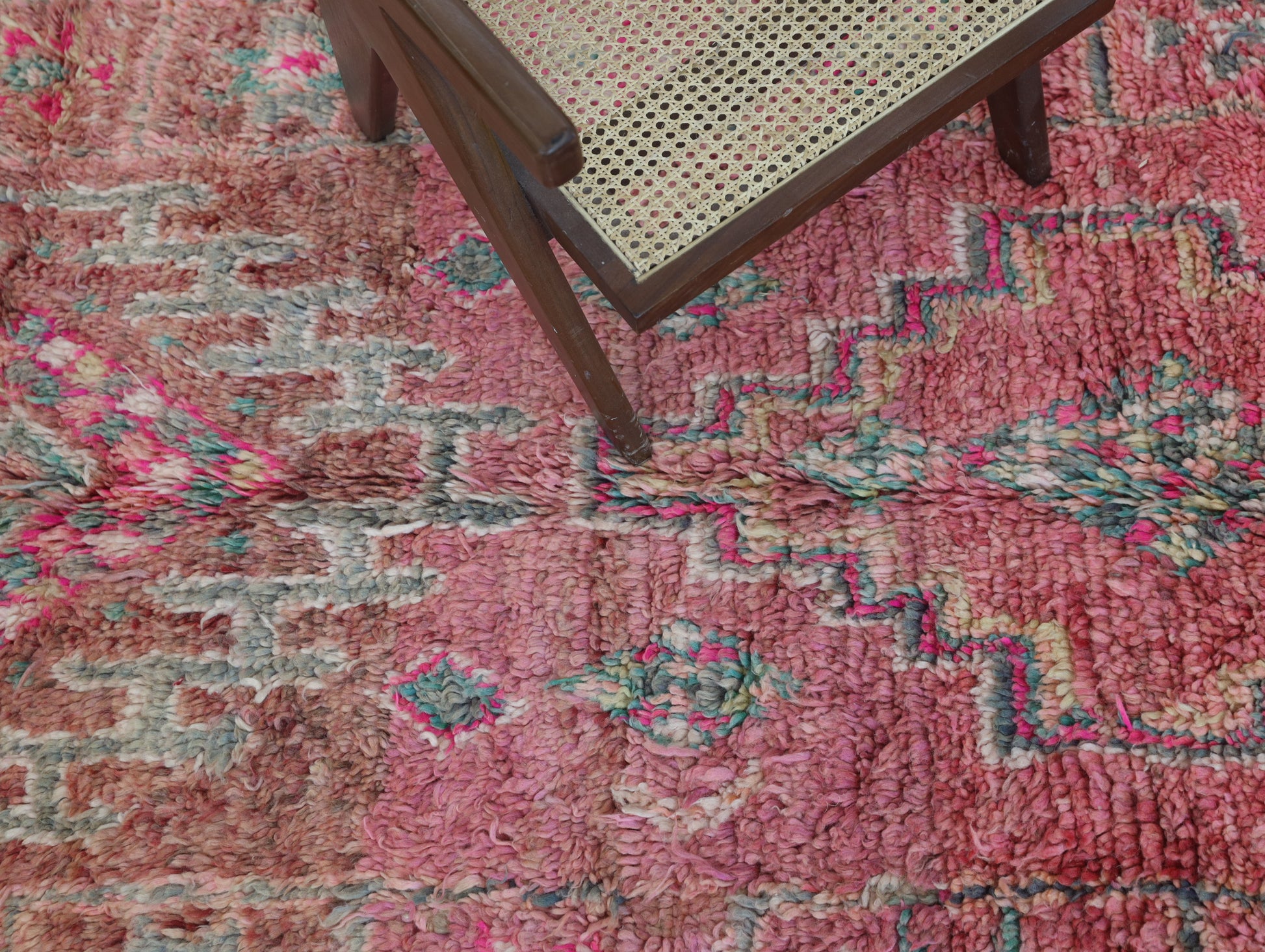 Originating in the Holy town of Boujad, these rugs, woven by diverse tribes, exhibit a wide spectrum of color, composition, and weave. Described as surreal, mystic, and mesmerizing, Boujad rugs transport us to a world beyond reality. Their construction, with twice as many horizontal as vertical knots, renders them floppy and easy to move.