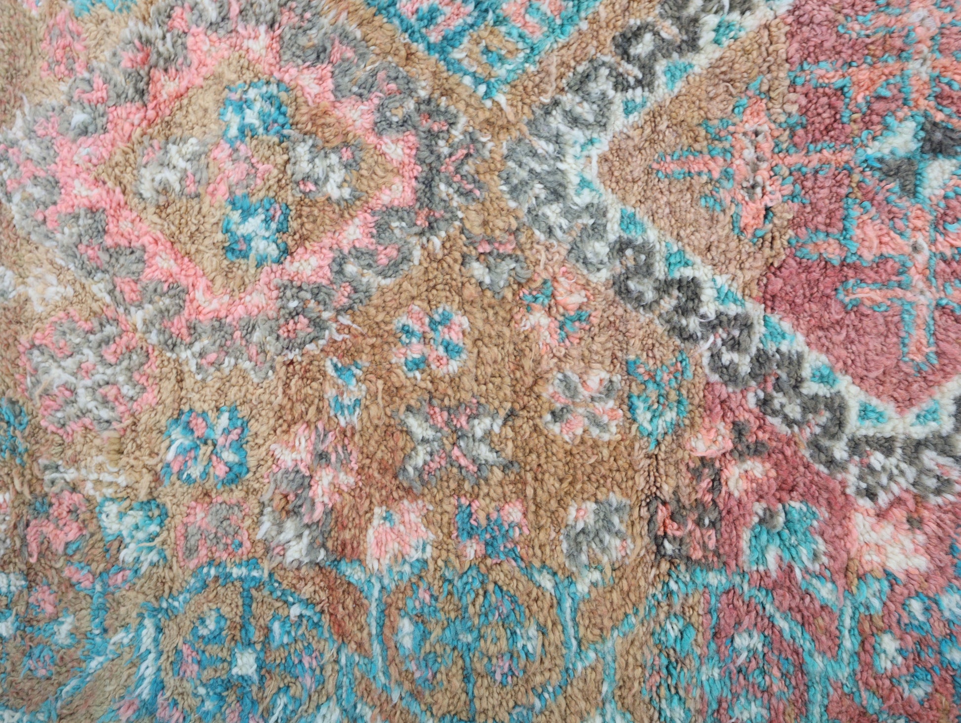 Originating in the Holy town of Boujad, these rugs, woven by diverse tribes, exhibit a wide spectrum of color, composition, and weave. Described as surreal, mystic, and mesmerizing, Boujad rugs transport us to a world beyond reality. Their construction, with twice as many horizontal as vertical knots, renders them floppy and easy to move.