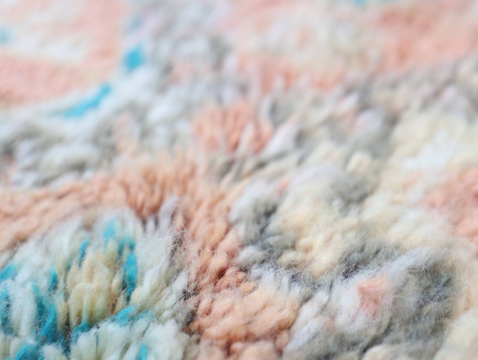 Wool, a sacred material for the Amazigh (Berber) people, forms the cornerstone of Moroccan rug design. Durable, long-lasting, and soft underfoot, wool is both functional and comfortable. In this piece, the wool pile is expertly knotted onto a wool foundation, adding substance and allowing it to gracefully embrace the floor.