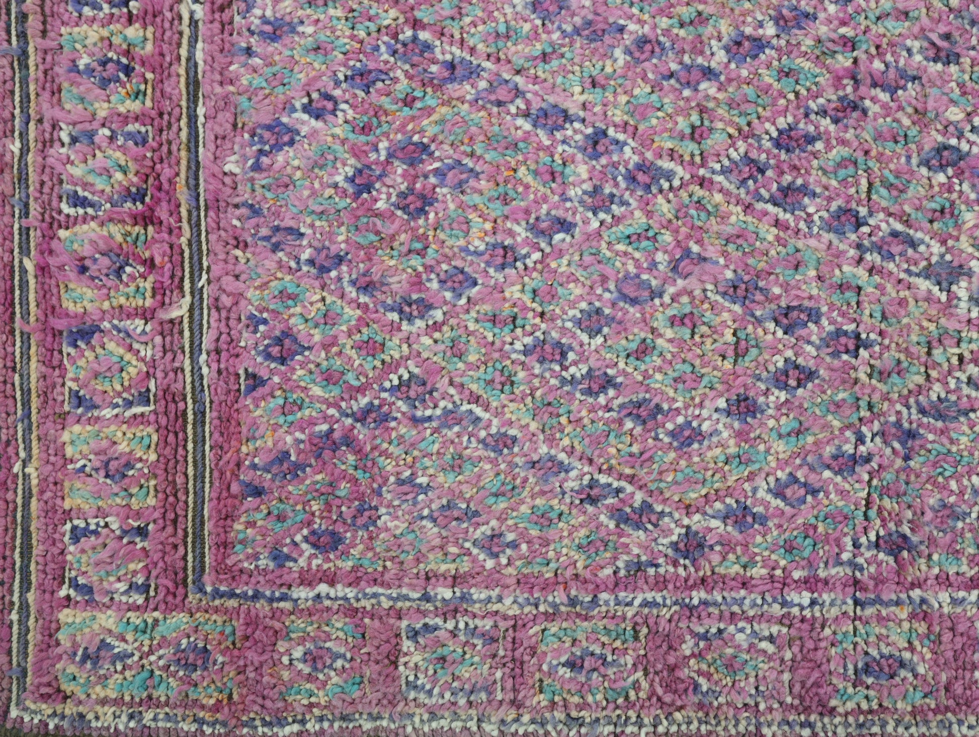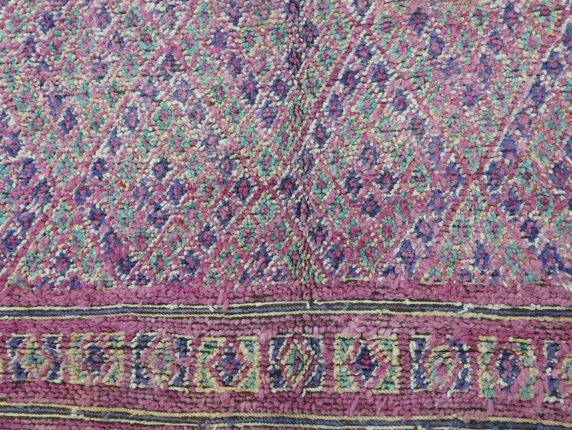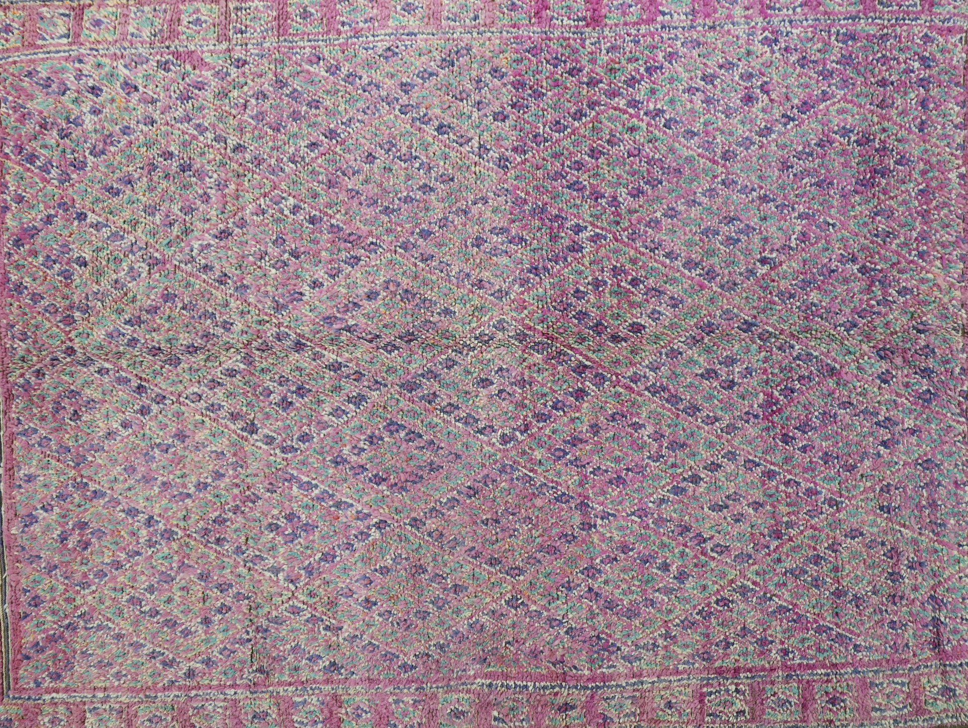 Originating in the Holy town of Boujad, these rugs, woven by diverse tribes, exhibit a wide spectrum of color, composition, and weave. Described as surreal, mystic, and mesmerizing, Boujad rugs transport us to a world beyond reality. Their construction, with twice as many horizontal as vertical knots, renders them floppy and easy to move.