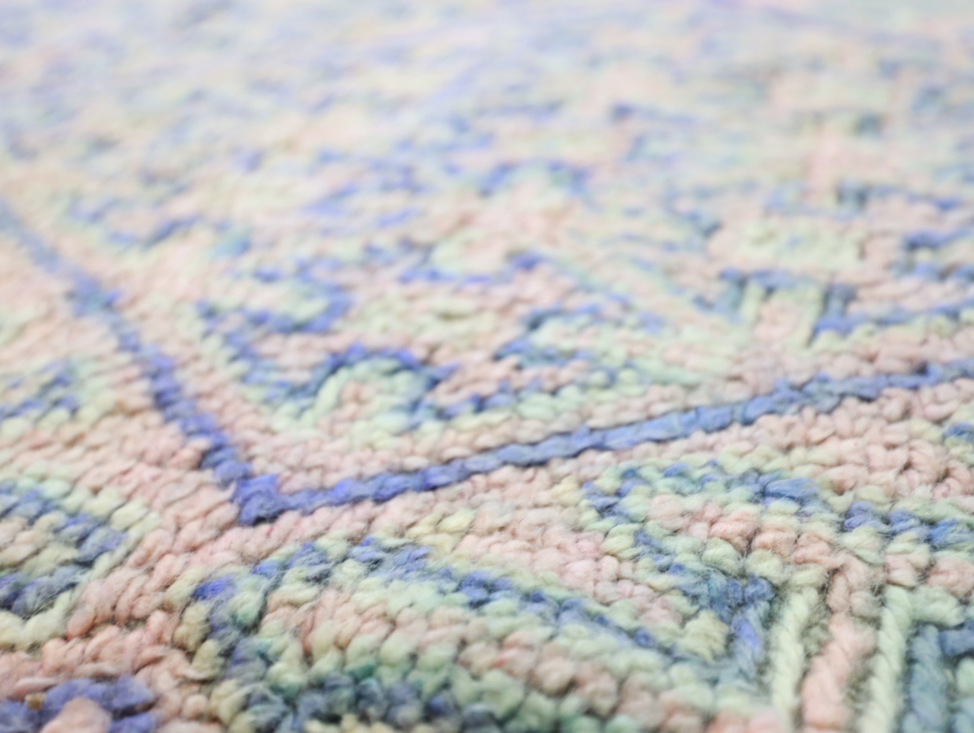 Originating in the Holy town of Boujad, these rugs, woven by diverse tribes, exhibit a wide spectrum of color, composition, and weave. Described as surreal, mystic, and mesmerizing, Boujad rugs transport us to a world beyond reality. Their construction, with twice as many horizontal as vertical knots, renders them floppy and easy to move.