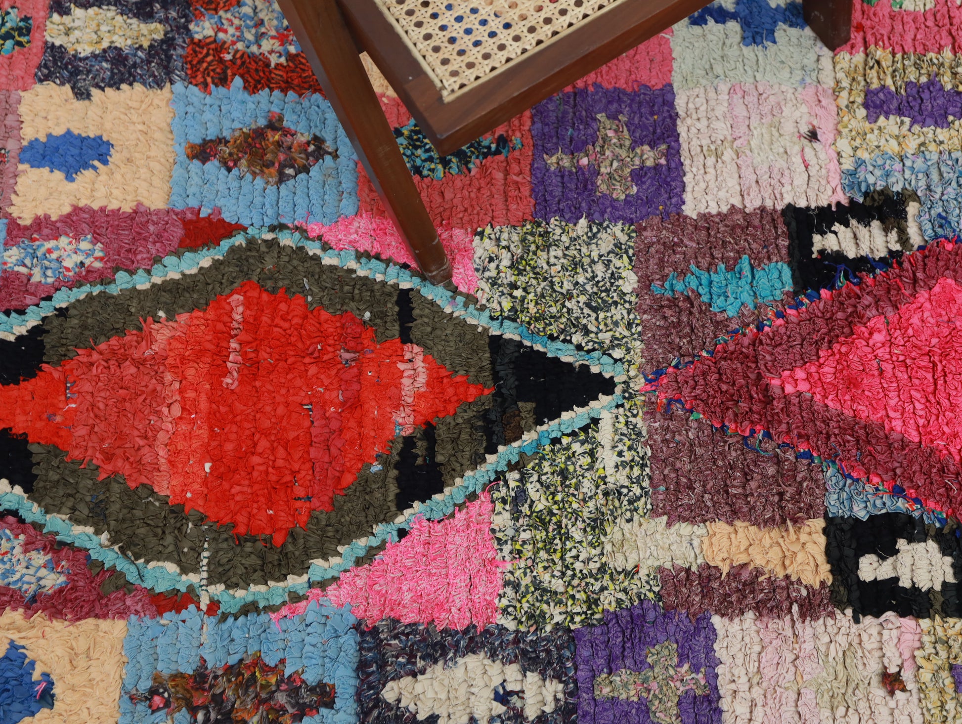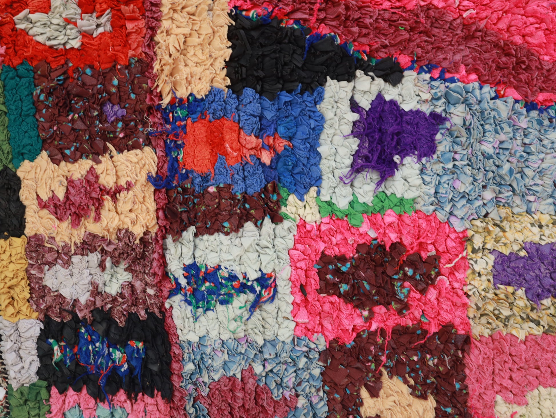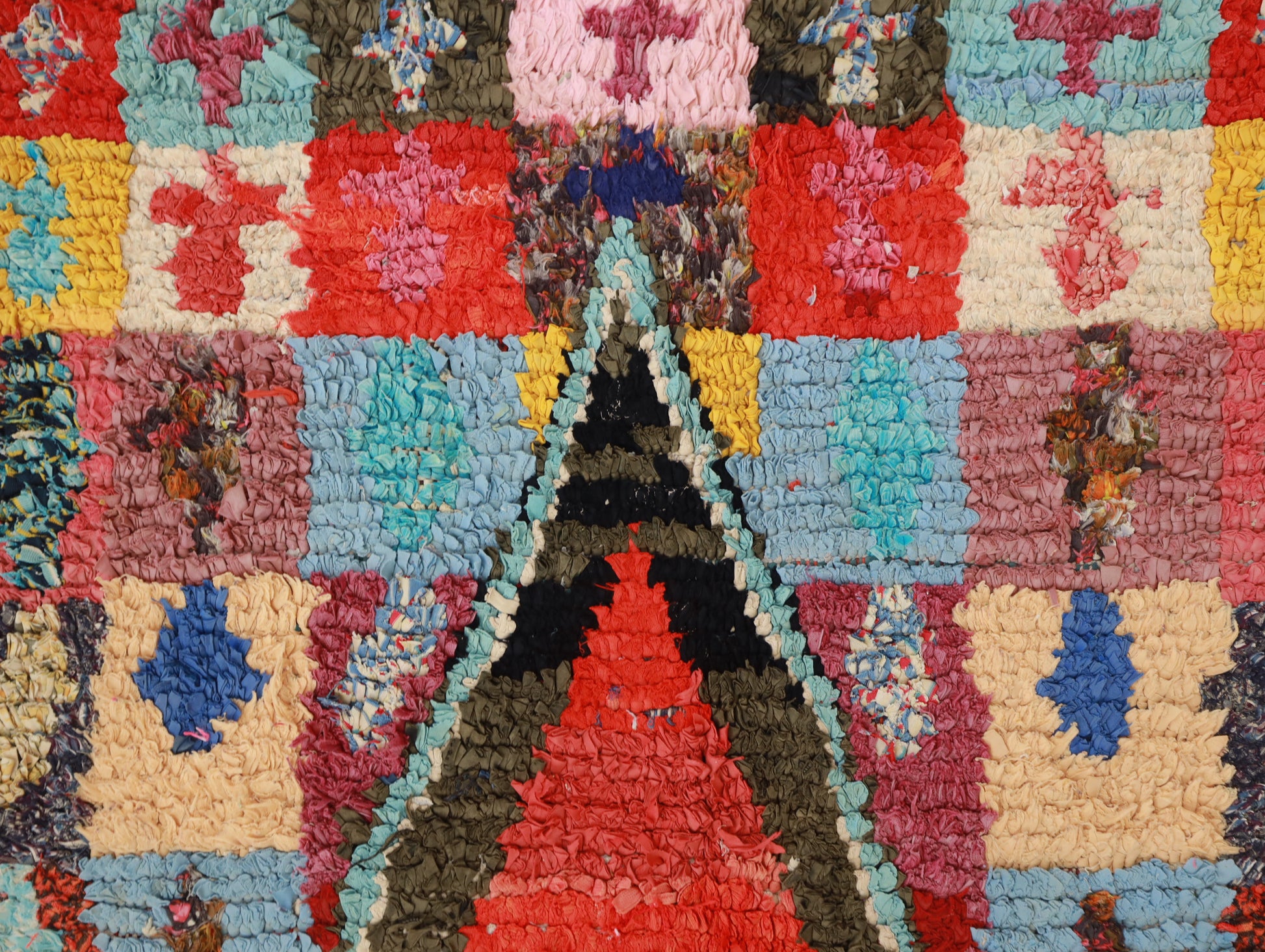 An unparalleled vintage masterpiece, carefully crafted by Berber Tribes in the Boucherouite style using upcycled textiles. Measurements: 3'3" x 6'6" (100 cm x 202 cm),