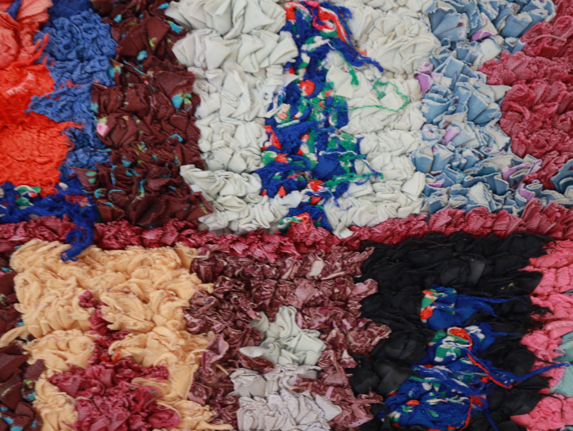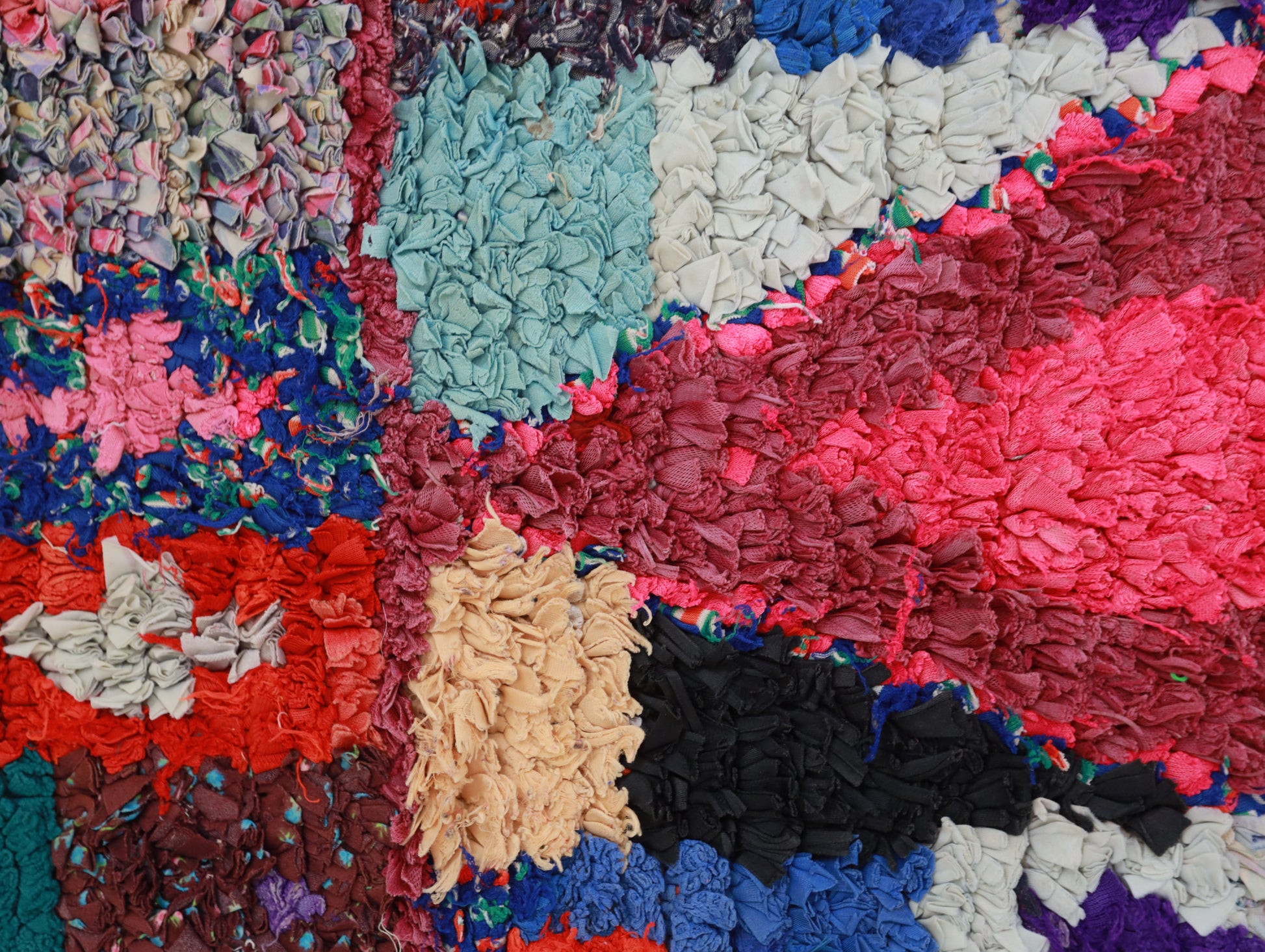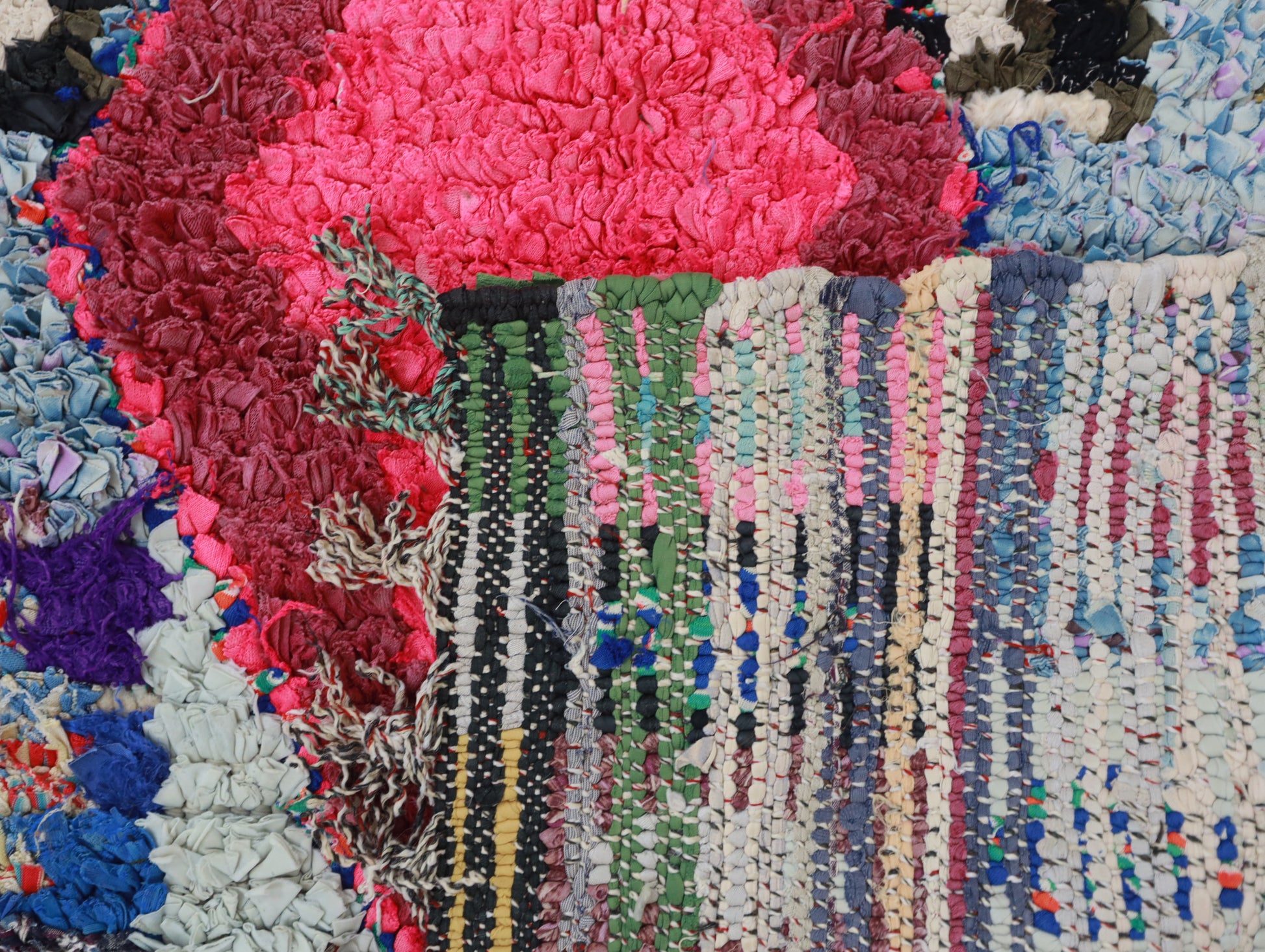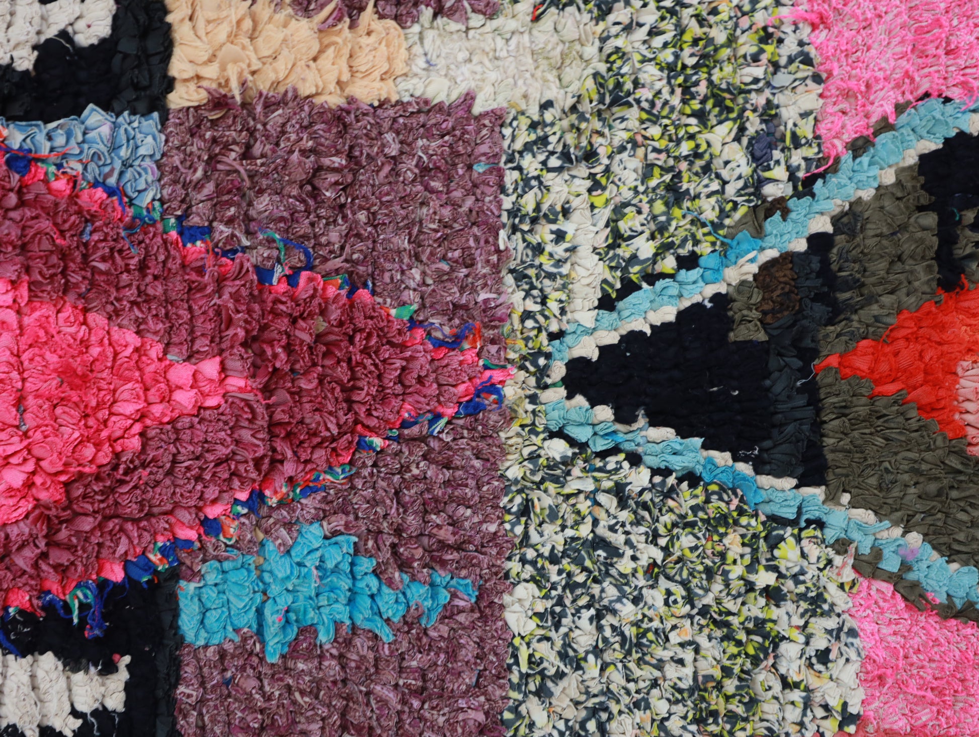 An unparalleled vintage masterpiece, carefully crafted by Berber Tribes in the Boucherouite style using upcycled textiles. Measurements: 3'3" x 6'6" (100 cm x 202 cm),