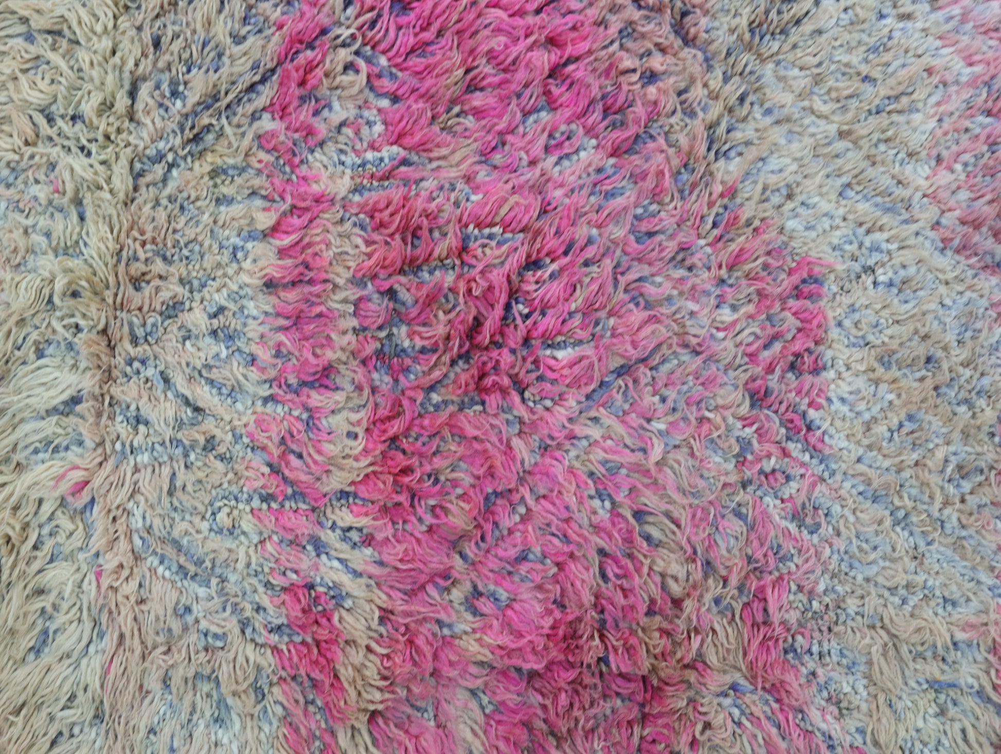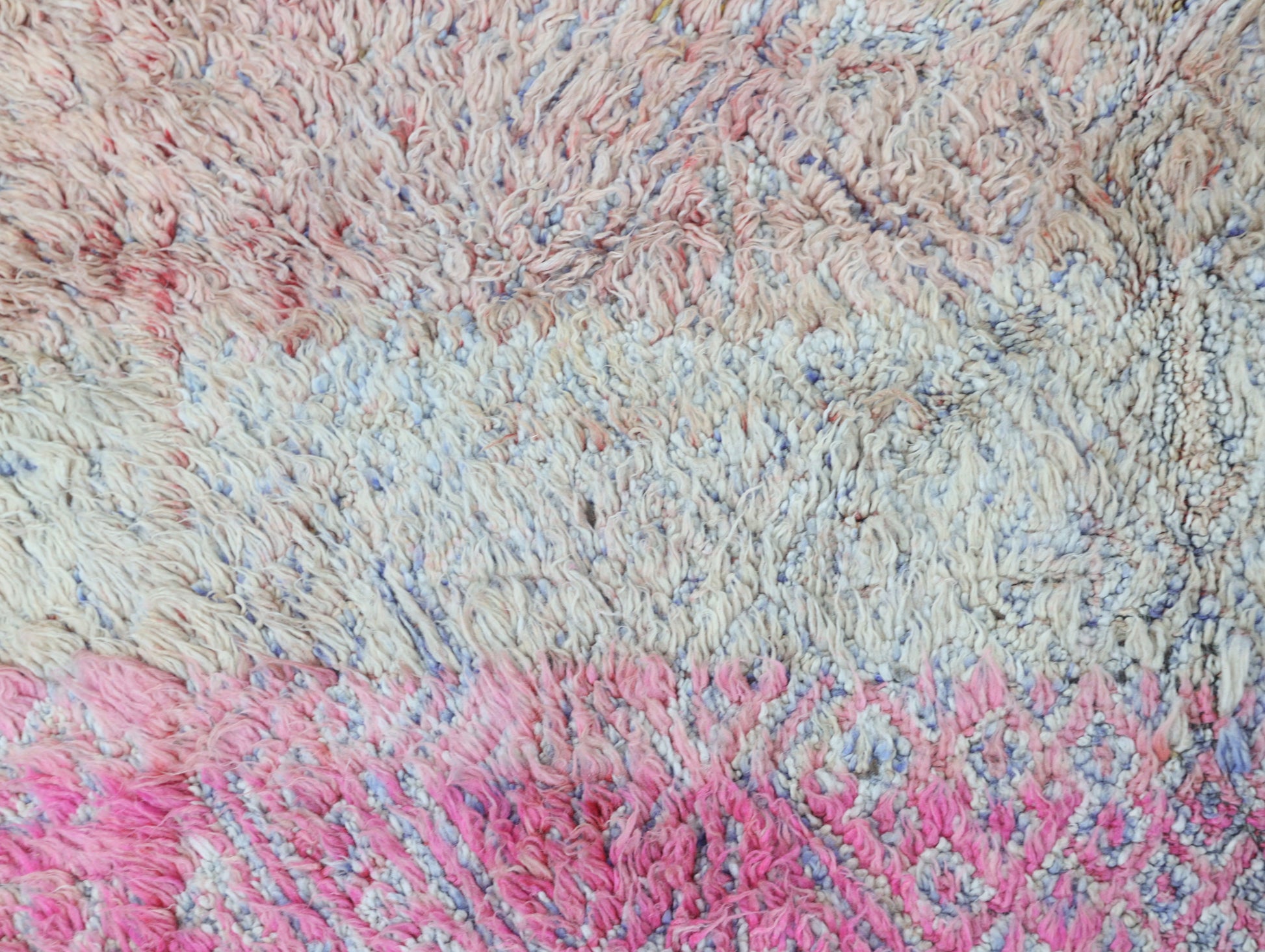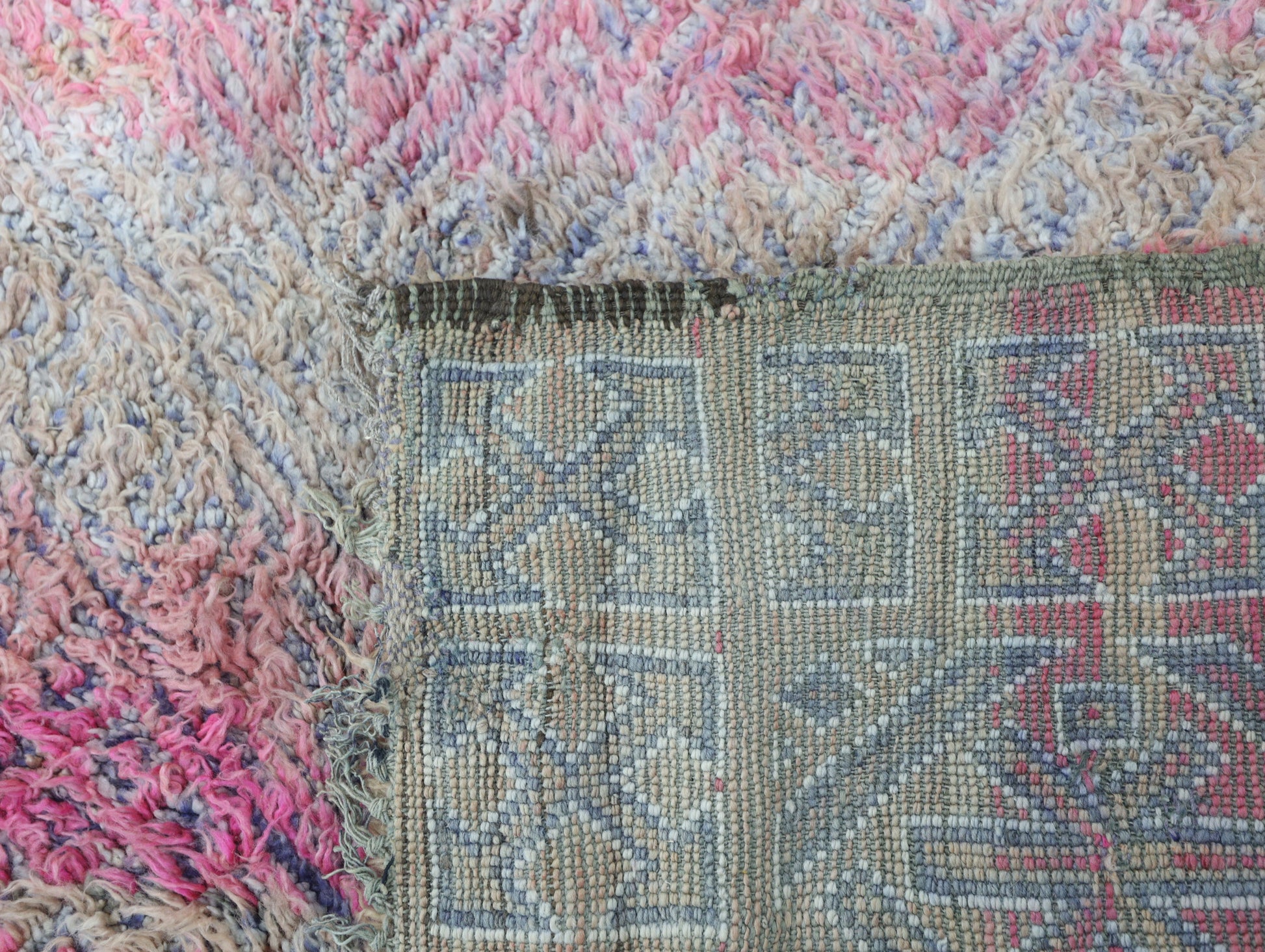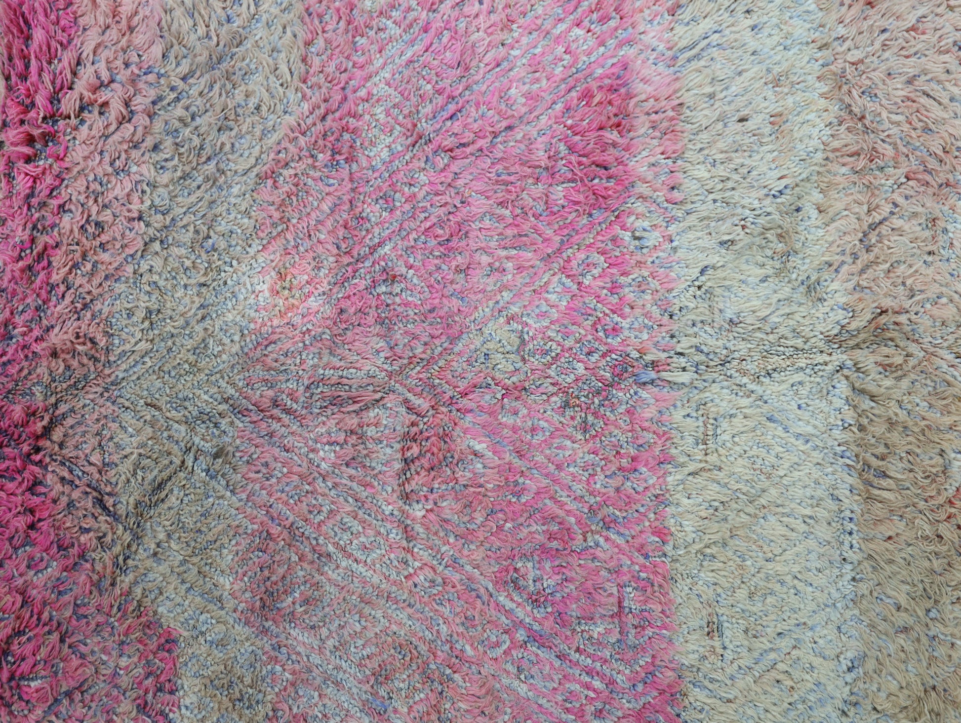 Originating in the Holy town of Boujad, these rugs, woven by diverse tribes, exhibit a wide spectrum of color, composition, and weave. Described as surreal, mystic, and mesmerizing, Boujad rugs transport us to a world beyond reality. Their construction, with twice as many horizontal as vertical knots, renders them floppy and easy to move.