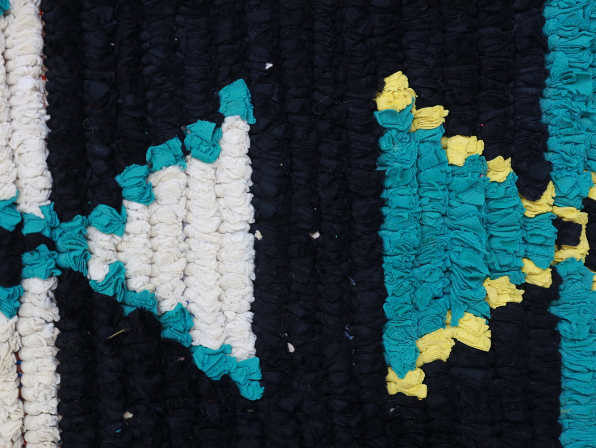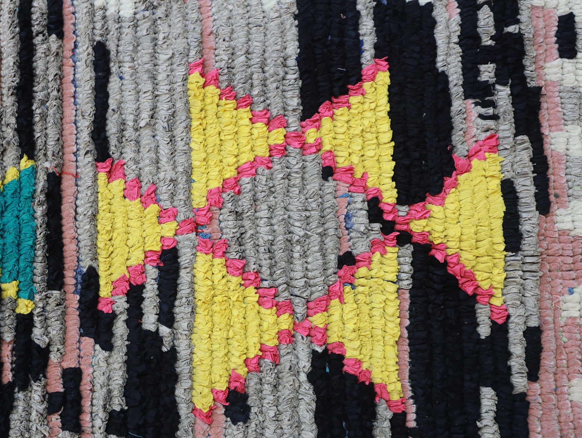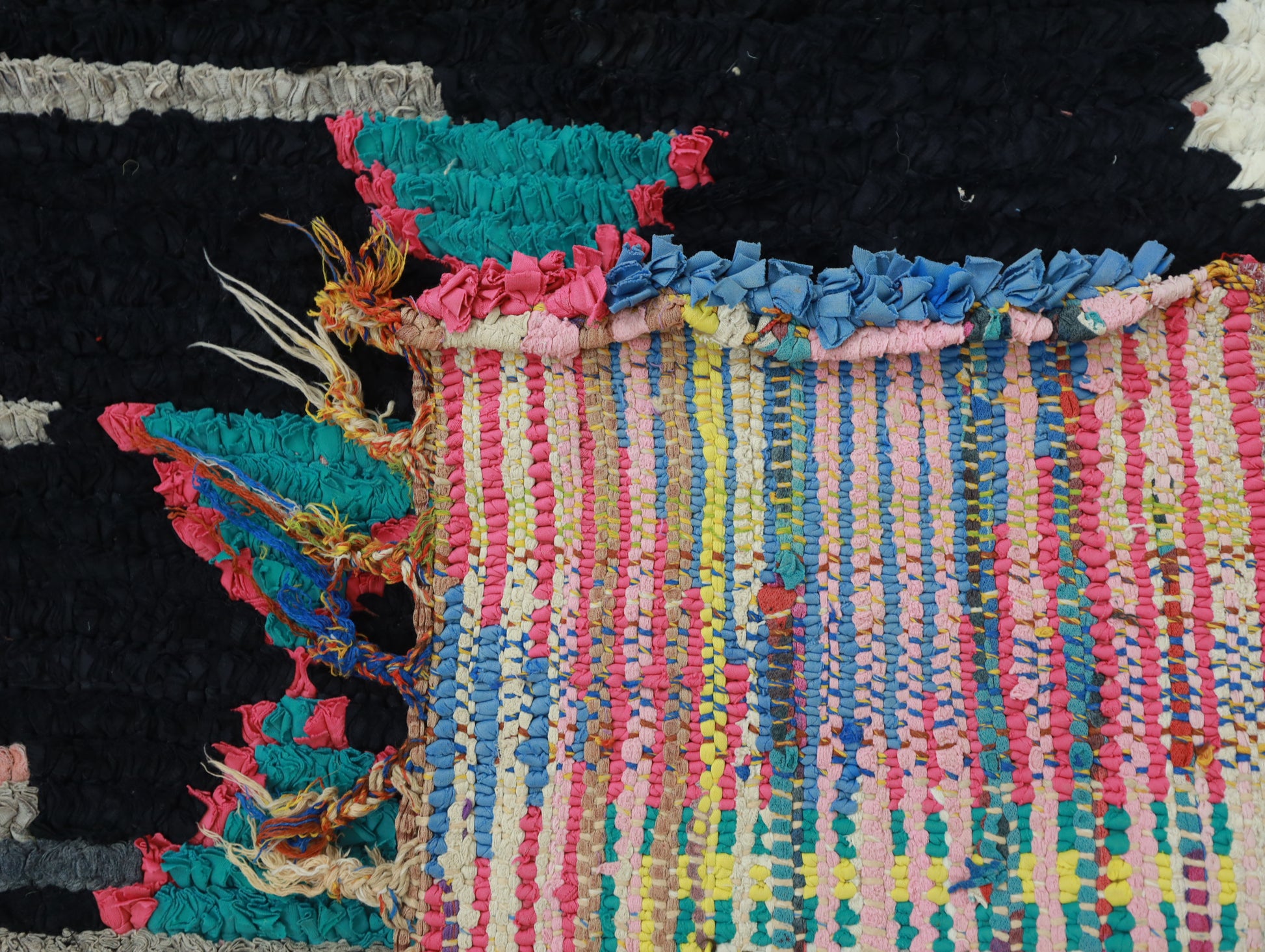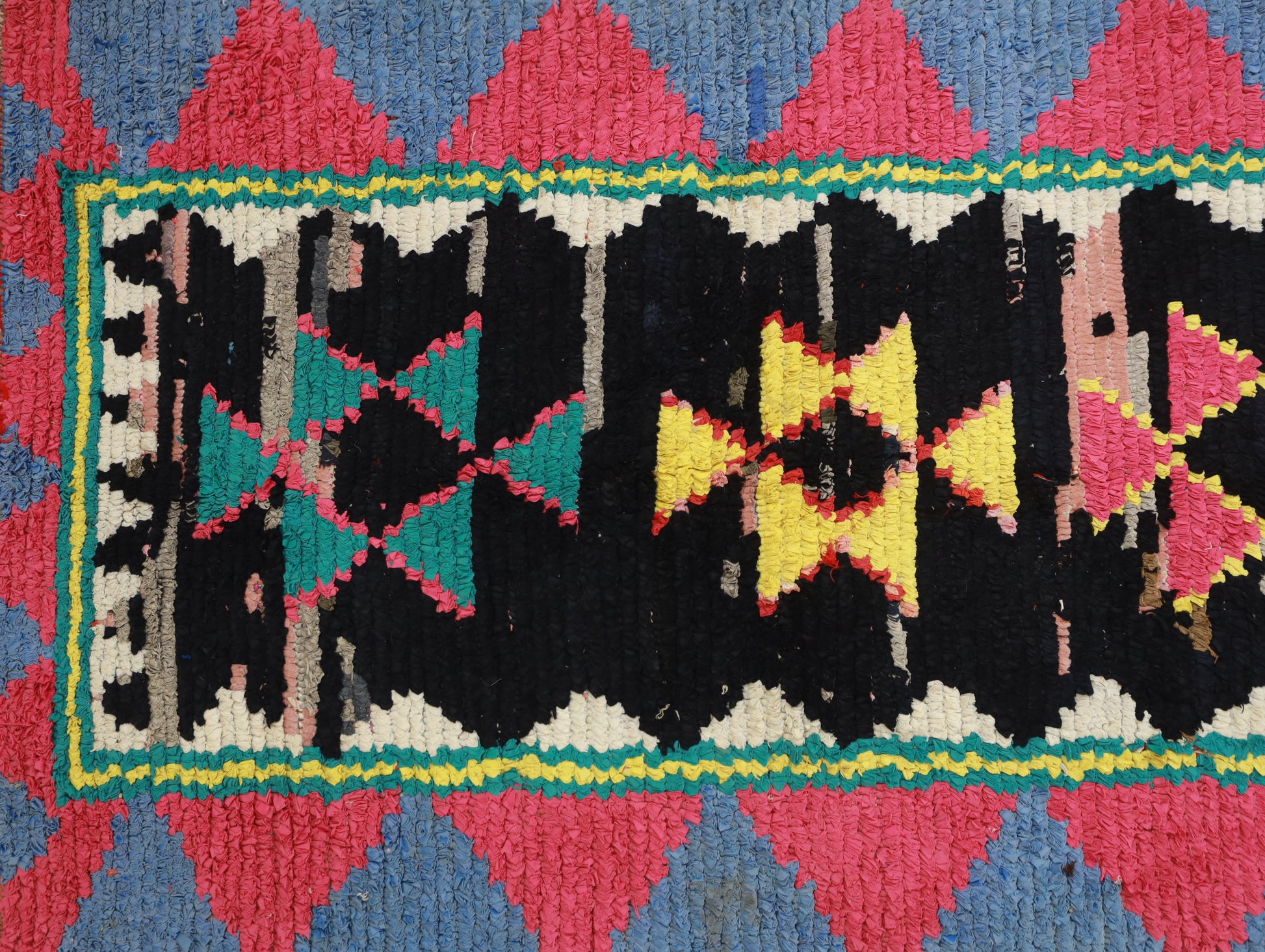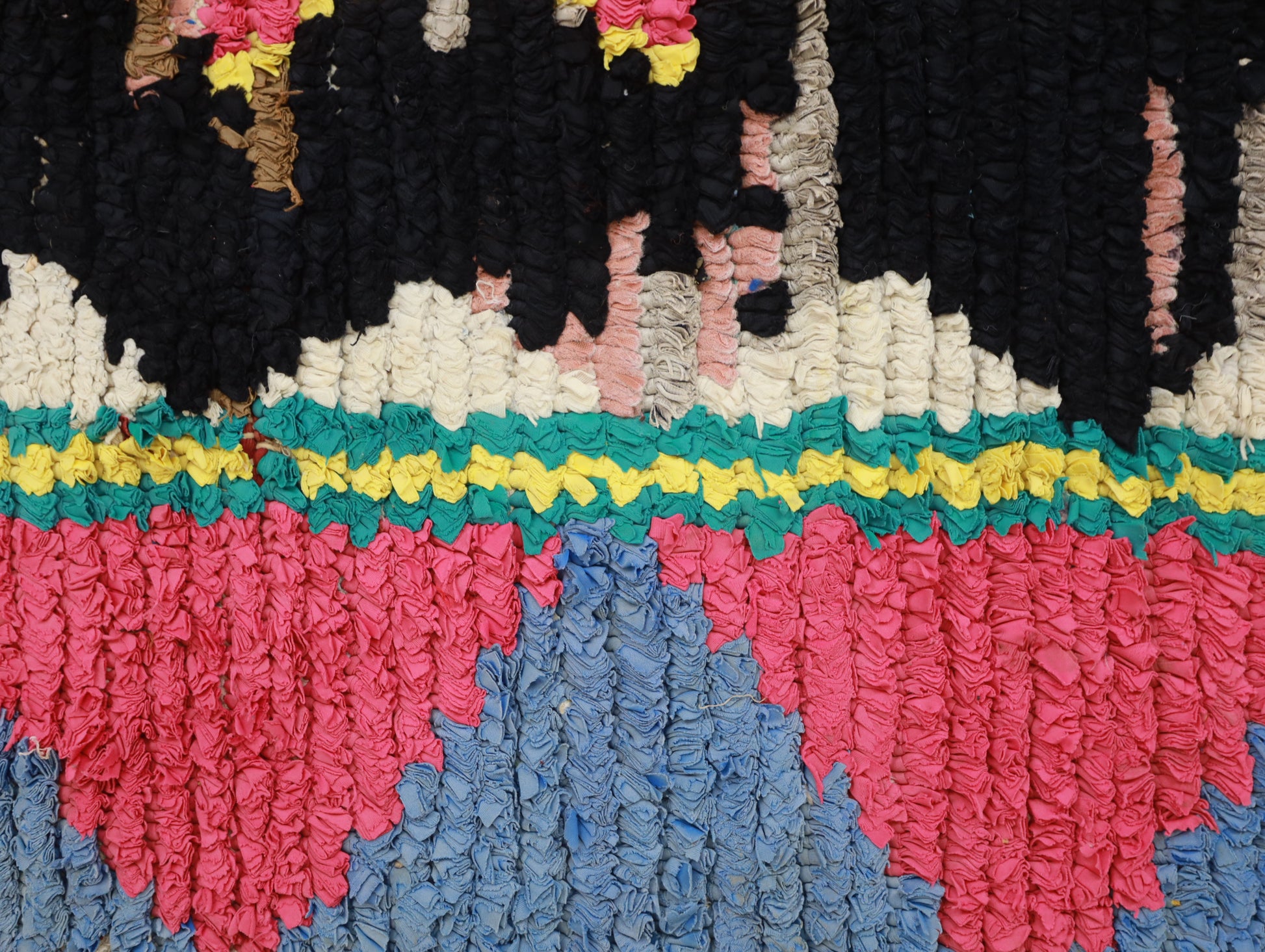 An unparalleled vintage masterpiece, carefully crafted by Berber Tribes in the Boucherouite style using upcycled textiles. Measurements: 3'3" x 10'0" (100 cm x 305 cm),