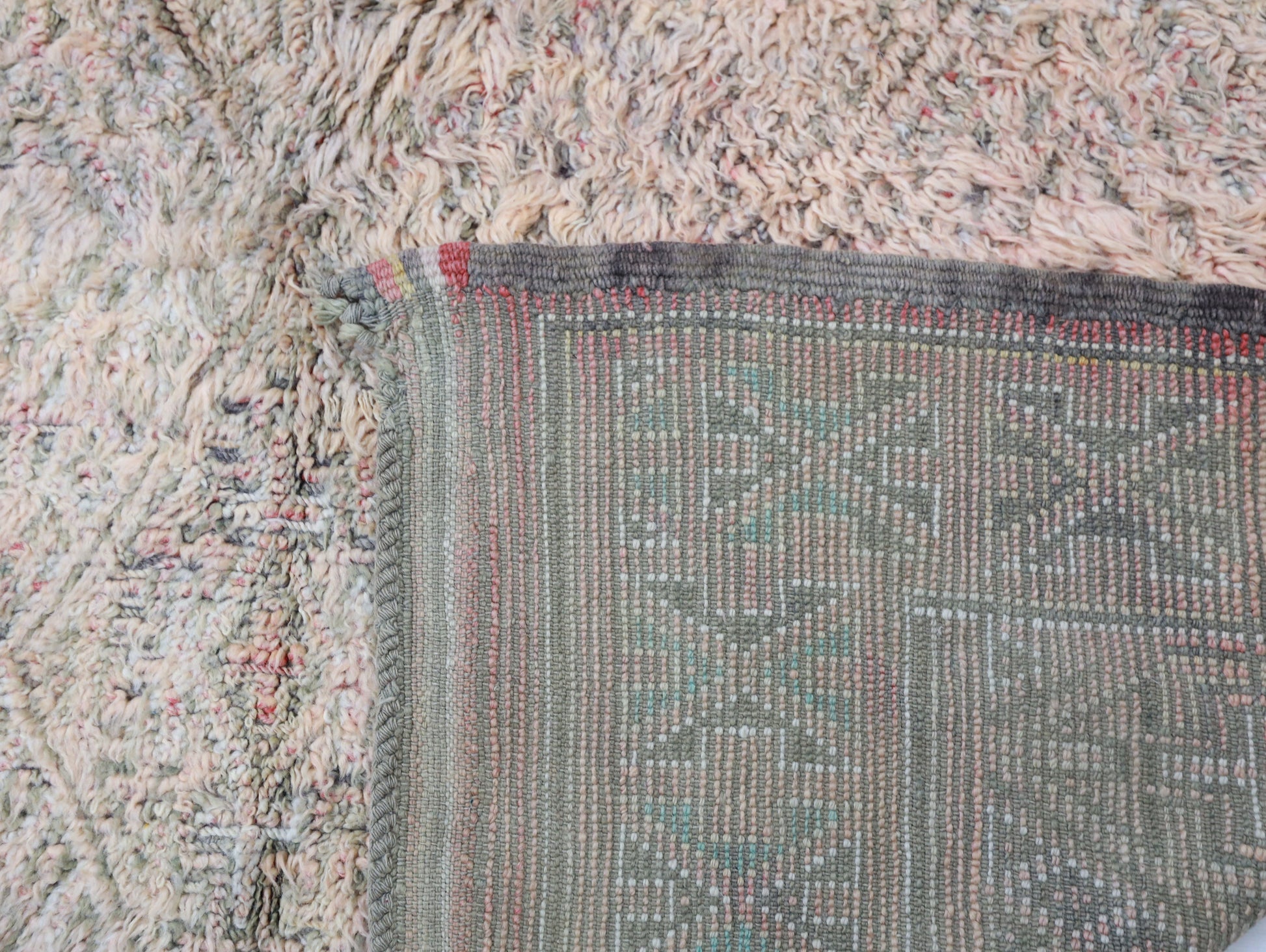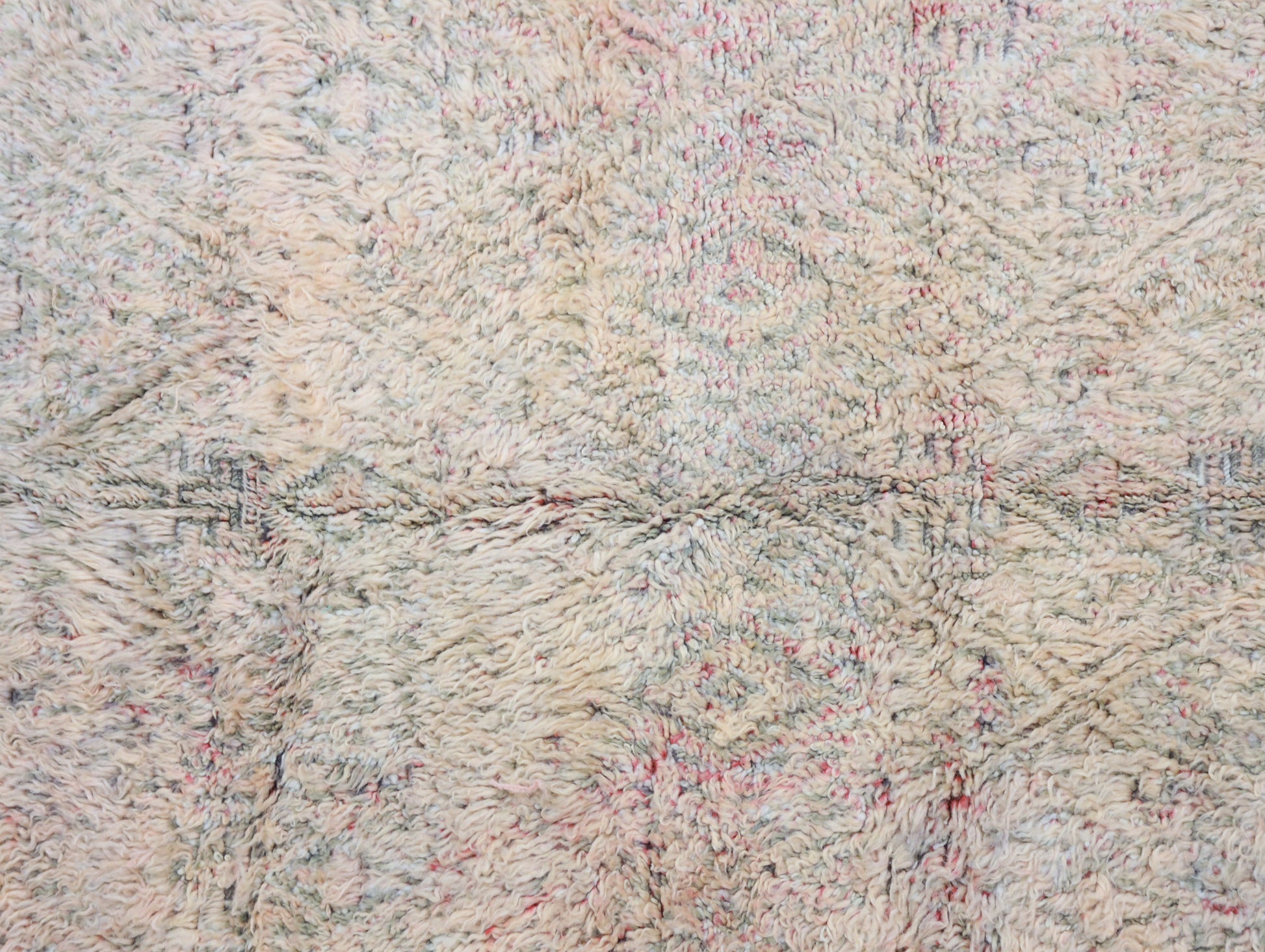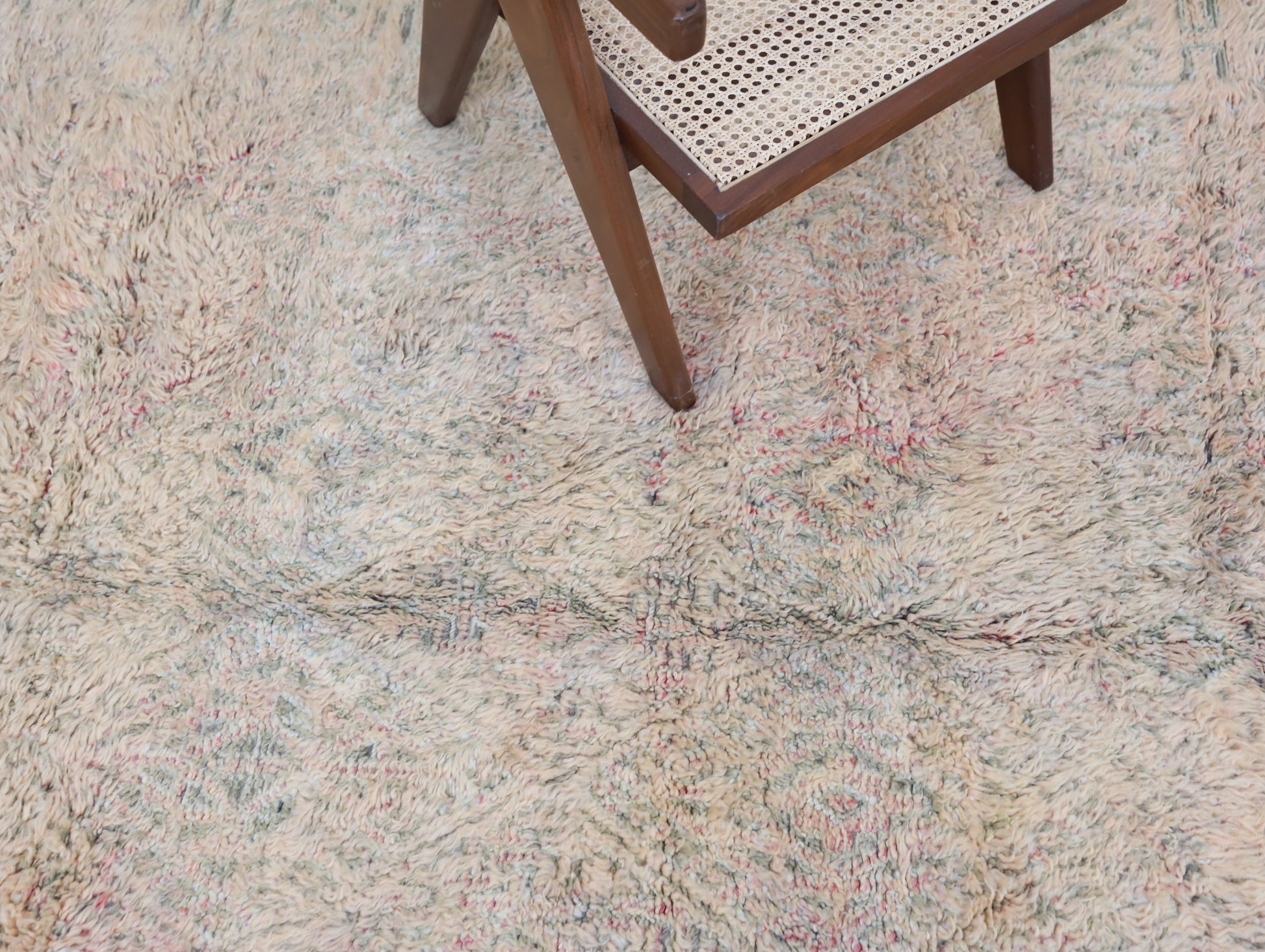 Wool, a sacred material for the Amazigh (Berber) people, forms the cornerstone of Moroccan rug design. Durable, long-lasting, and soft underfoot, wool is both functional and comfortable. In this piece, the wool pile is expertly knotted onto a wool foundation, adding substance and allowing it to gracefully embrace the floor.