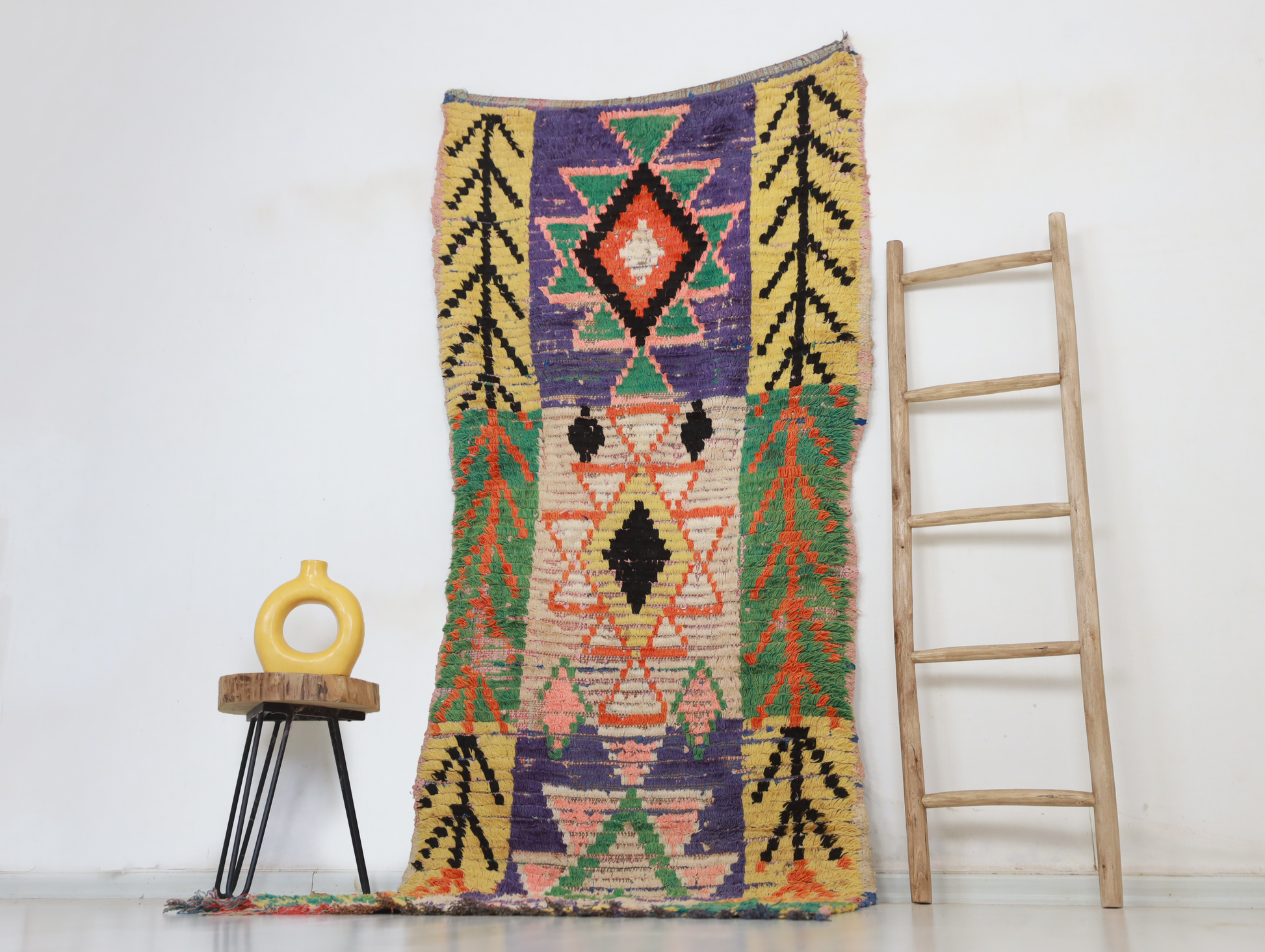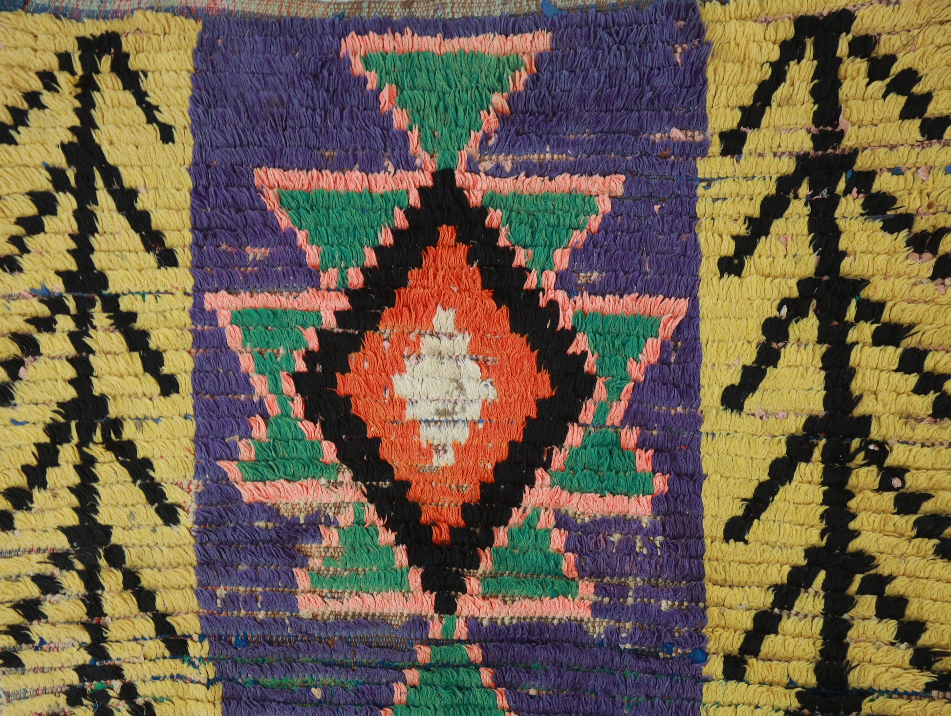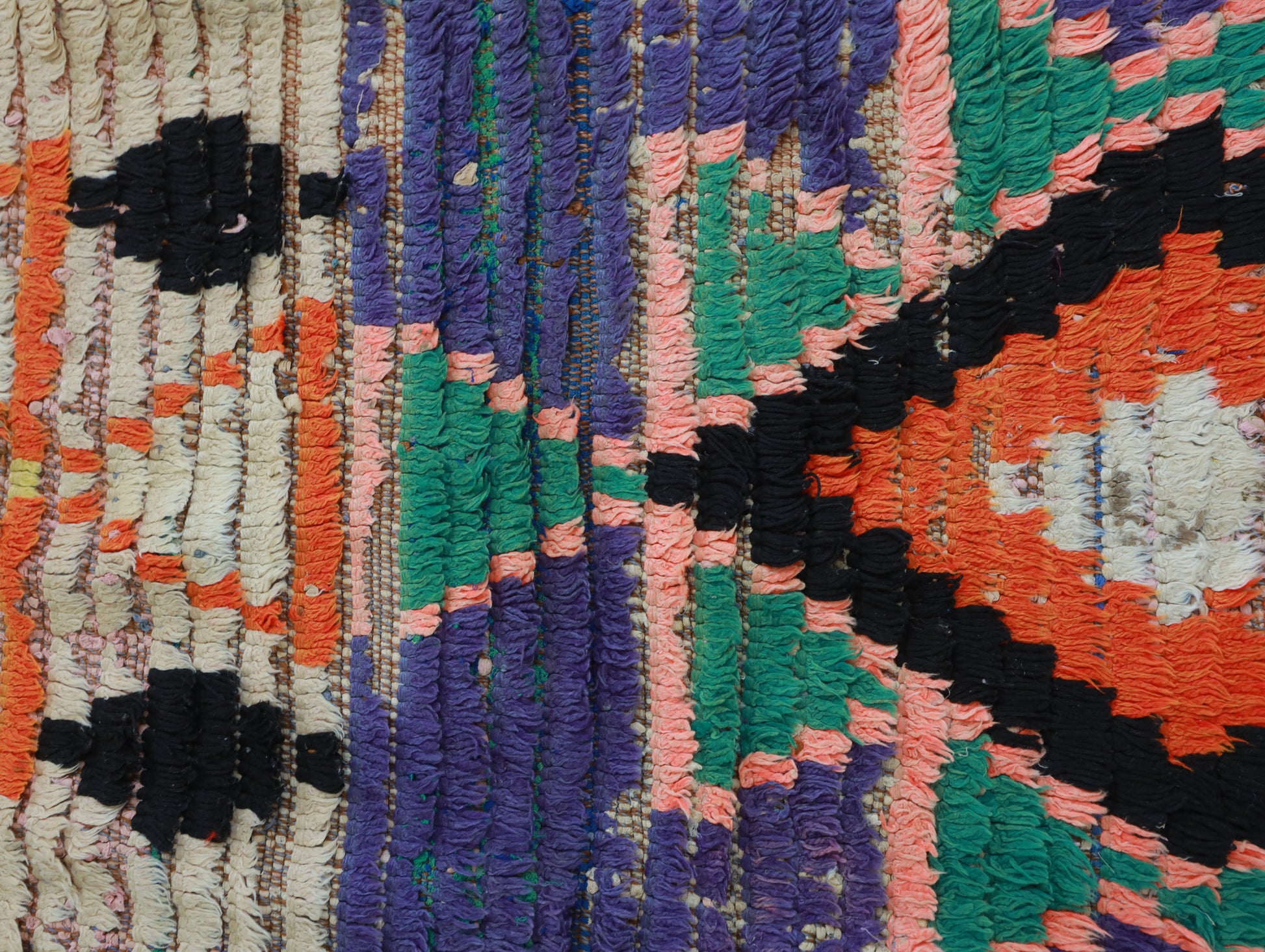 Azilal rugs boast abstract, painterly designs reminiscent of rugs from Ourika. What sets them apart is a vibrant color palette, achieved through the incorporation of cotton alongside wool..
