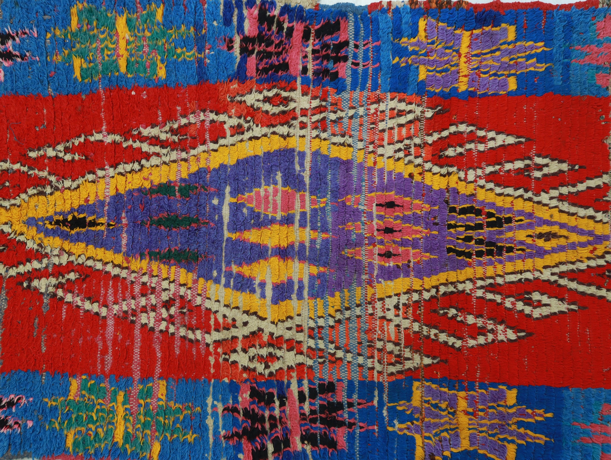 Azilal rugs boast abstract, painterly designs reminiscent of rugs from Ourika. What sets them apart is a vibrant color palette, achieved through the incorporation of cotton alongside wool..
