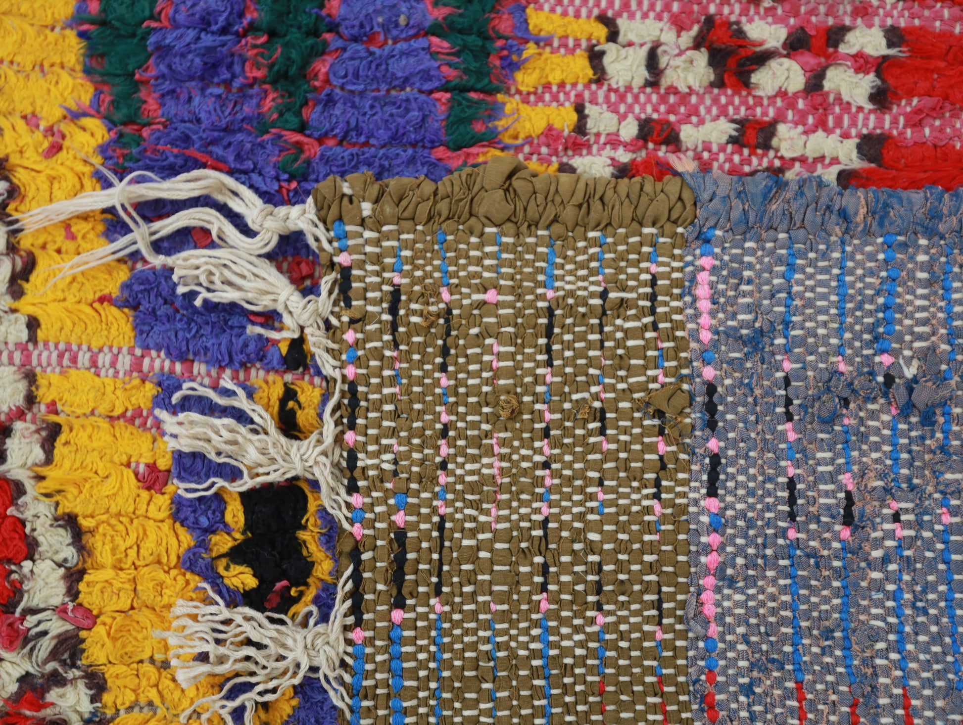 An unparalleled vintage masterpiece, carefully crafted by Berber Tribes in the Boucherouite style using upcycled textiles. Measurements: 3'4" x 7'4" (103 cm x 226 cm),