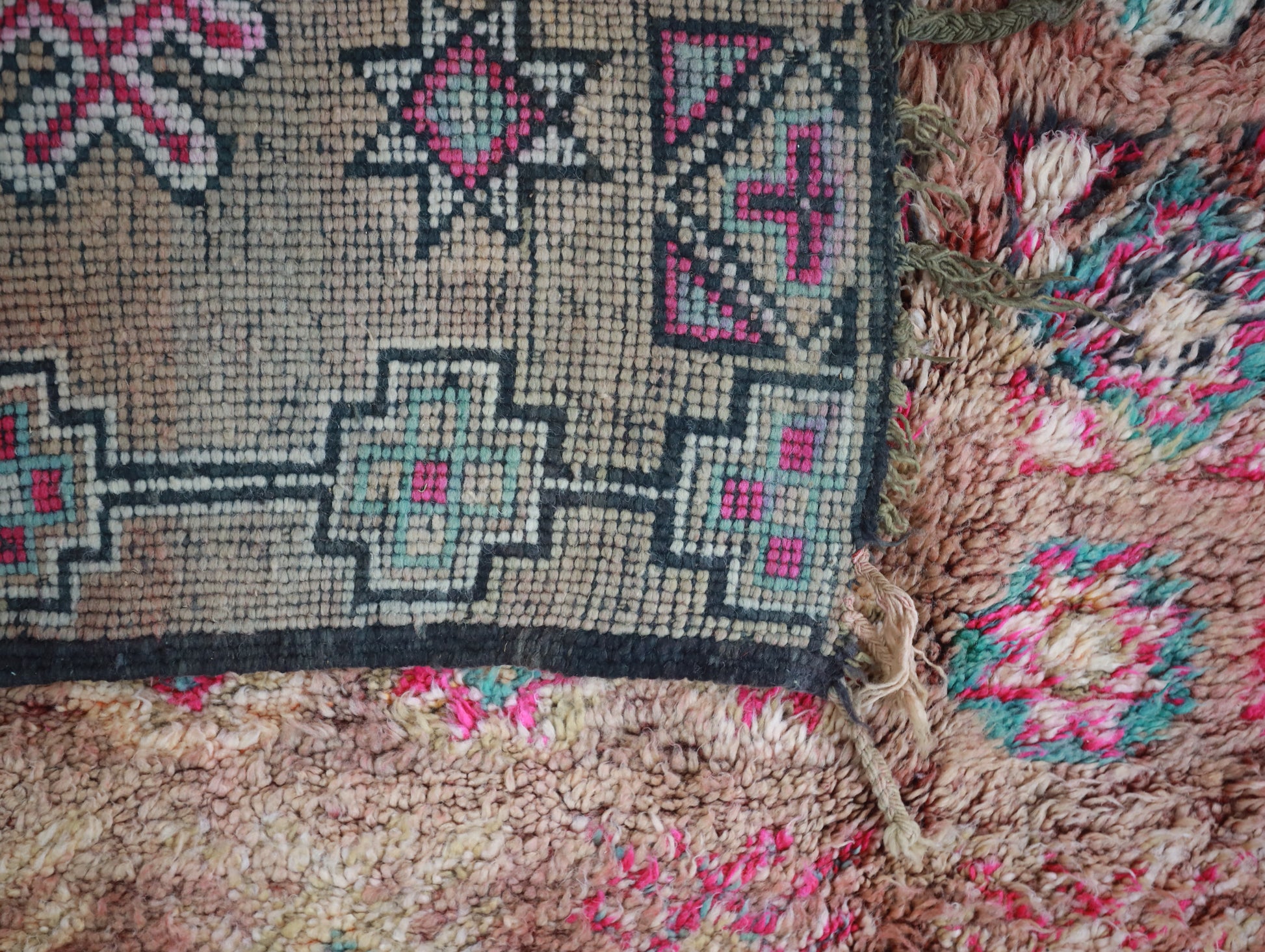 Originating in the Holy town of Boujad, these rugs, woven by diverse tribes, exhibit a wide spectrum of color, composition, and weave. Described as surreal, mystic, and mesmerizing, Boujad rugs transport us to a world beyond reality. Their construction, with twice as many horizontal as vertical knots, renders them floppy and easy to move.