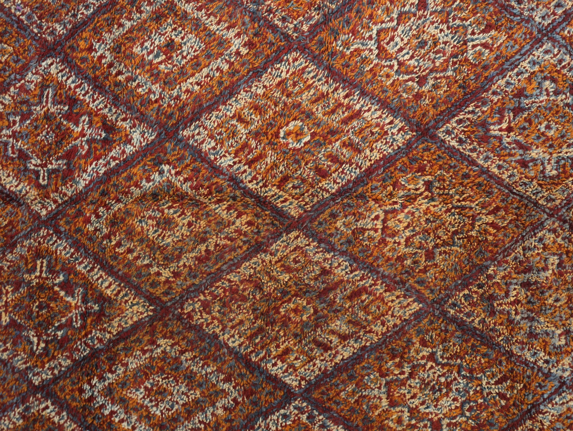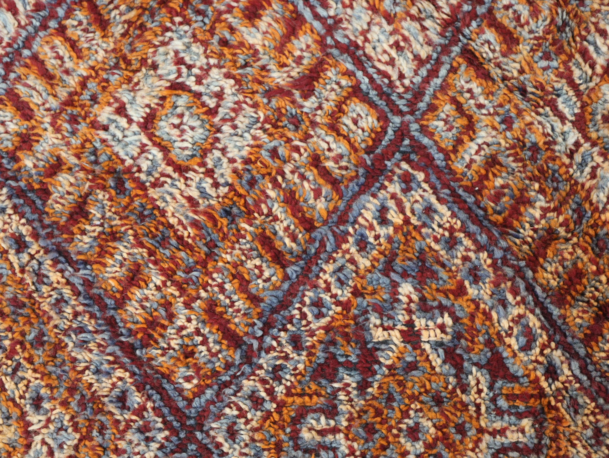 Wool, a sacred material for the Amazigh (Berber) people, forms the cornerstone of Moroccan rug design. Durable, long-lasting, and soft underfoot, wool is both functional and comfortable. In this piece, the wool pile is expertly knotted onto a wool foundation, adding substance and allowing it to gracefully embrace the floor.