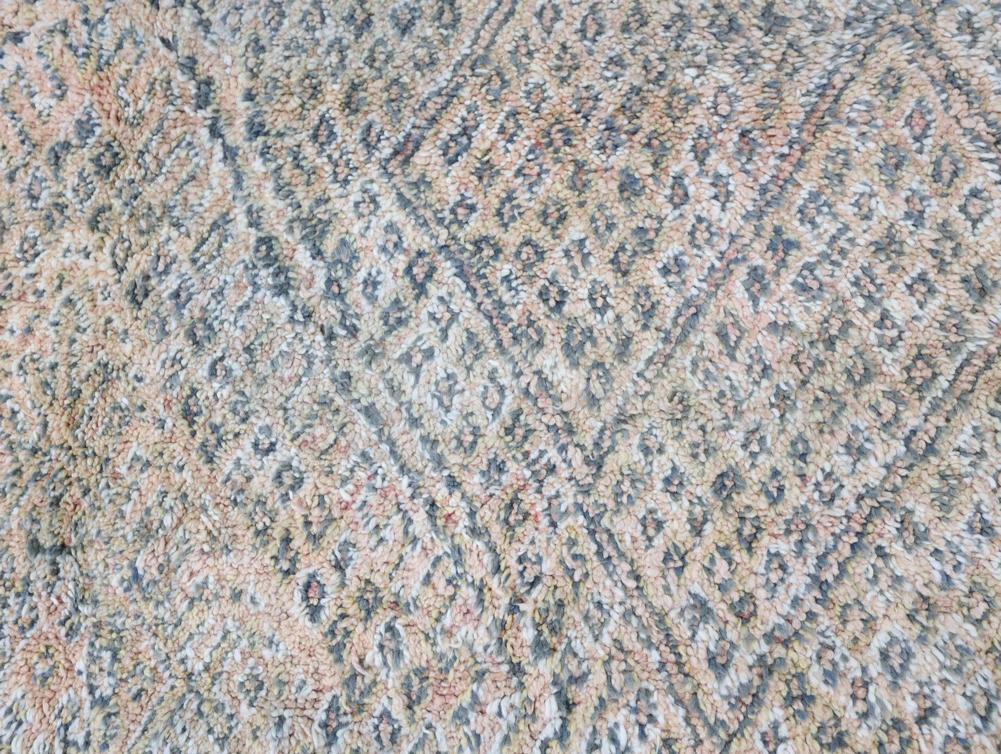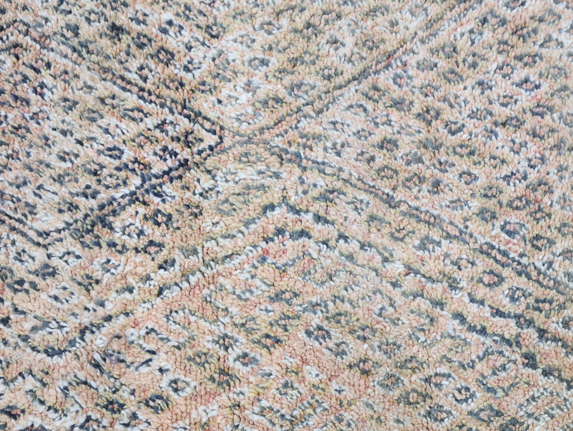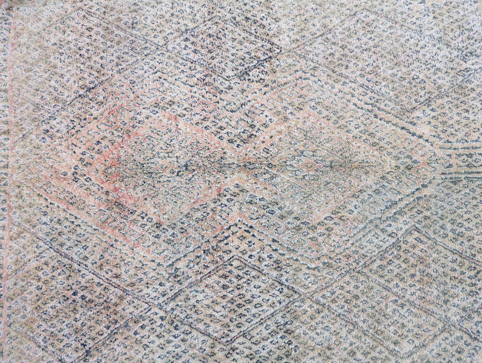 Wool, a sacred material for the Amazigh (Berber) people, forms the cornerstone of Moroccan rug design. Durable, long-lasting, and soft underfoot, wool is both functional and comfortable. In this piece, the wool pile is expertly knotted onto a wool foundation, adding substance and allowing it to gracefully embrace the floor.