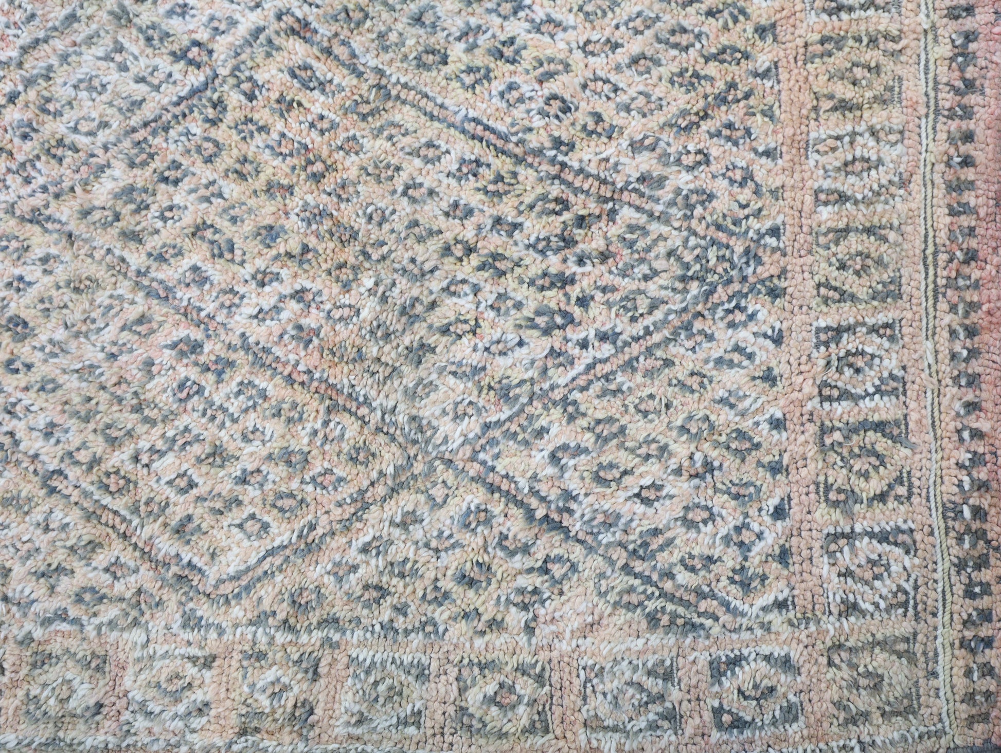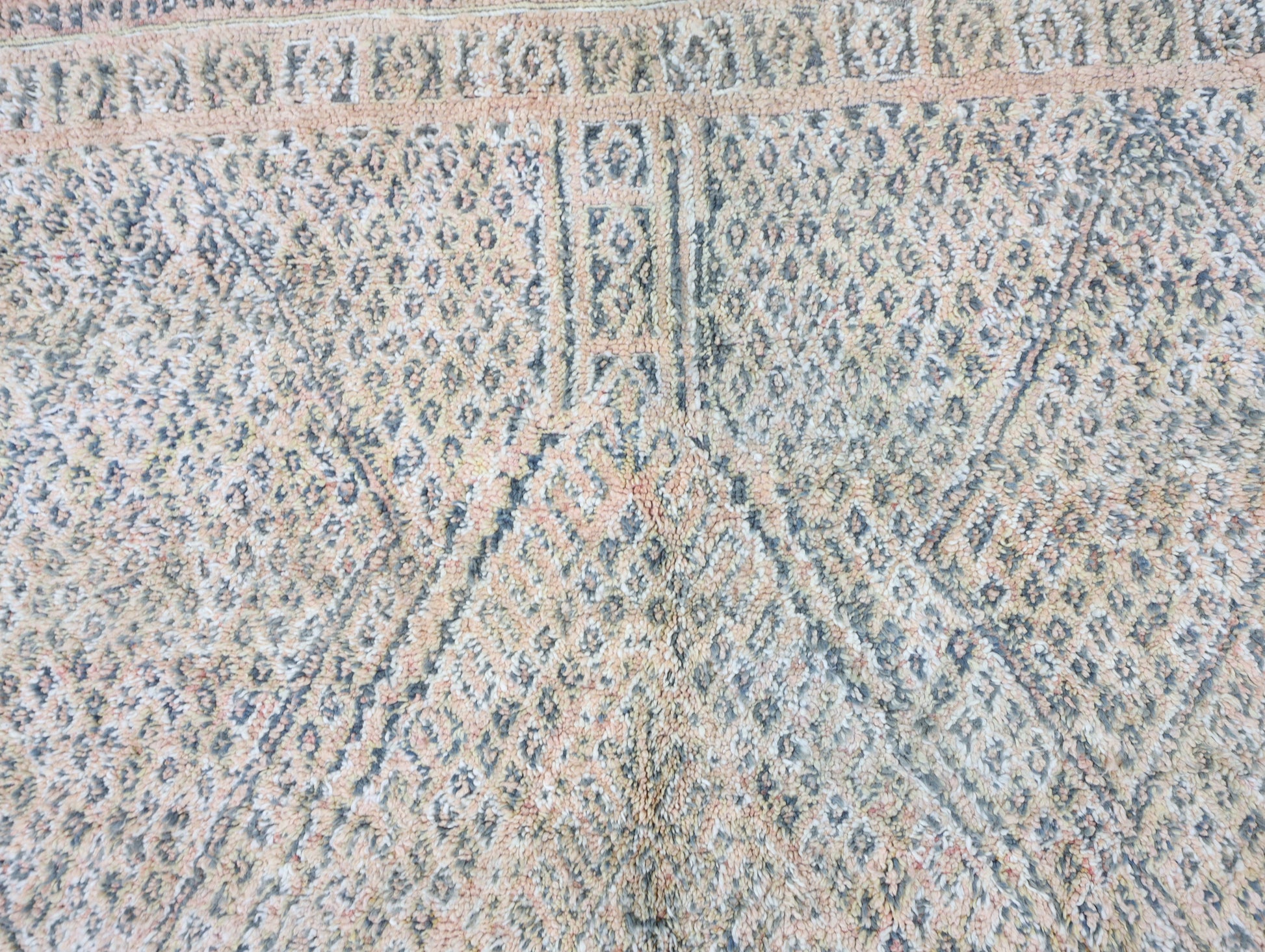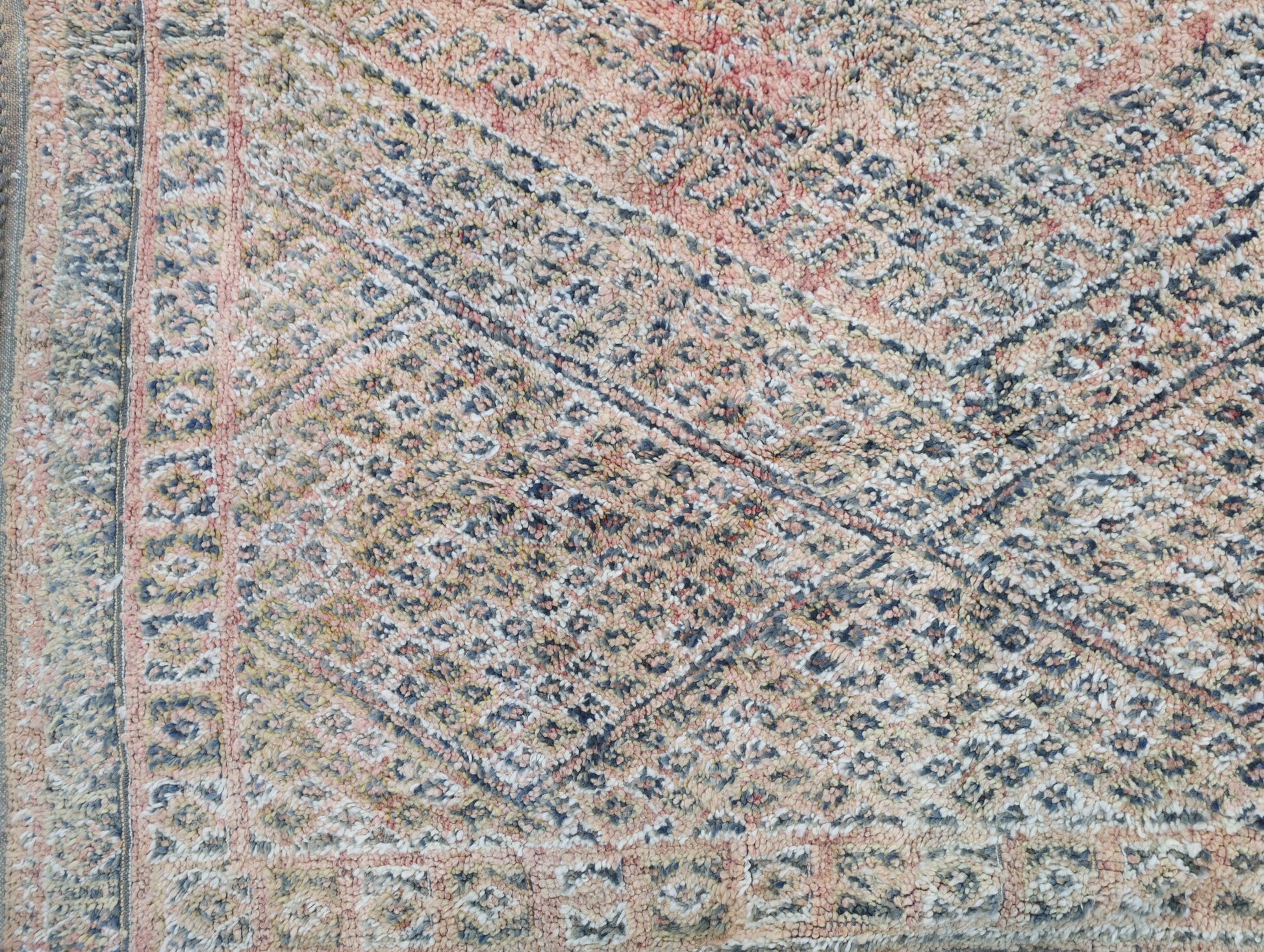 Wool, a sacred material for the Amazigh (Berber) people, forms the cornerstone of Moroccan rug design. Durable, long-lasting, and soft underfoot, wool is both functional and comfortable. In this piece, the wool pile is expertly knotted onto a wool foundation, adding substance and allowing it to gracefully embrace the floor.