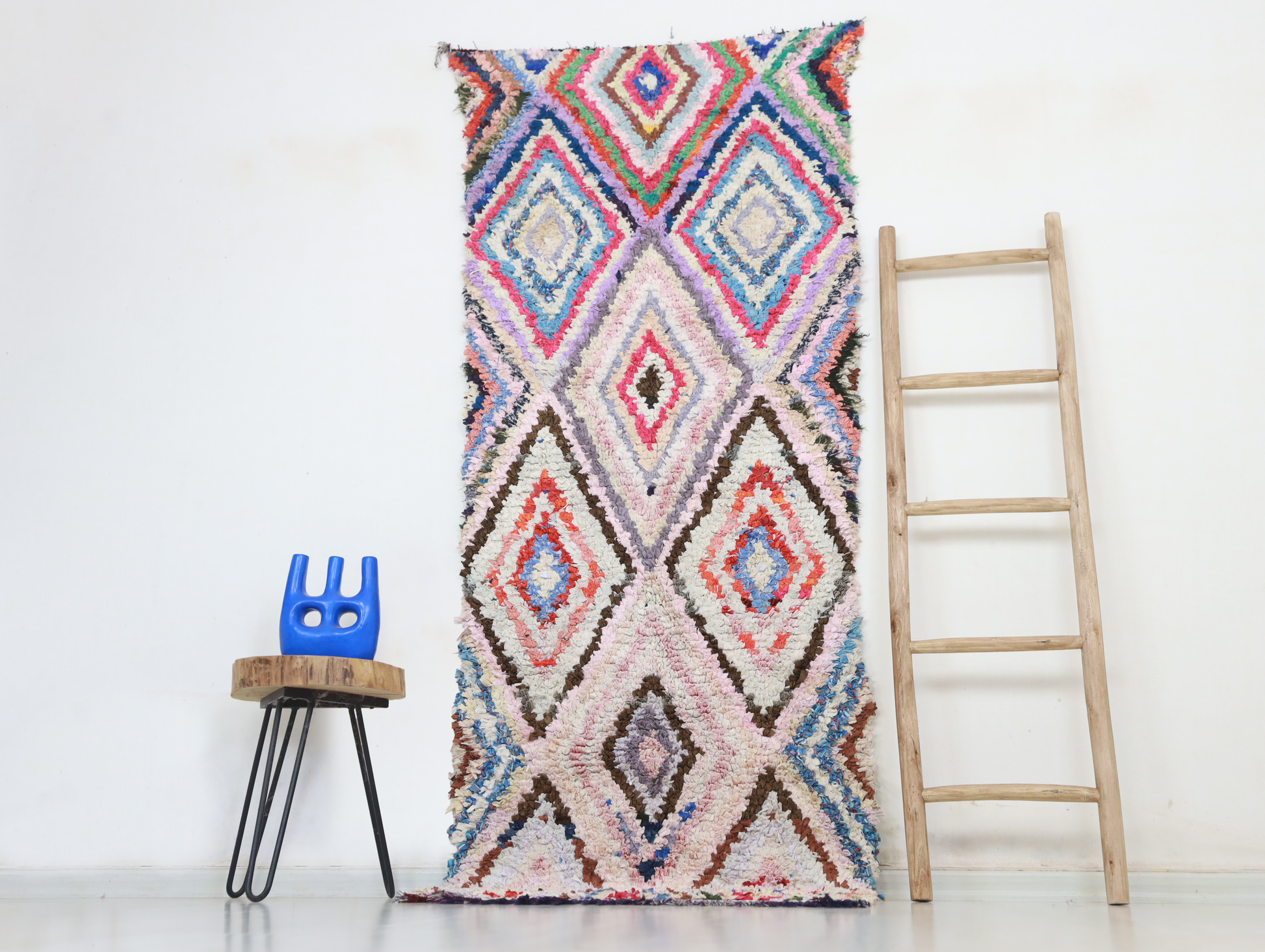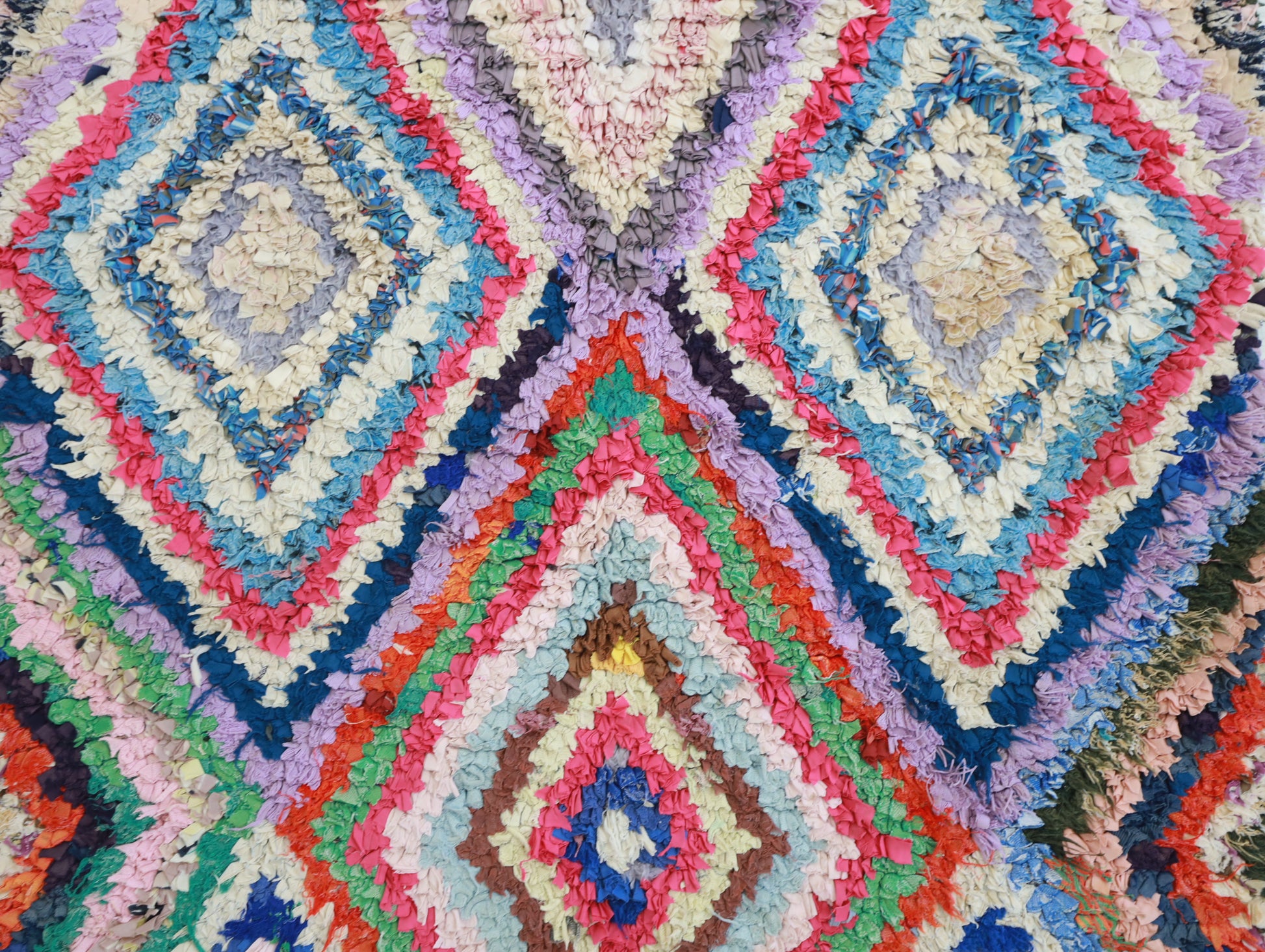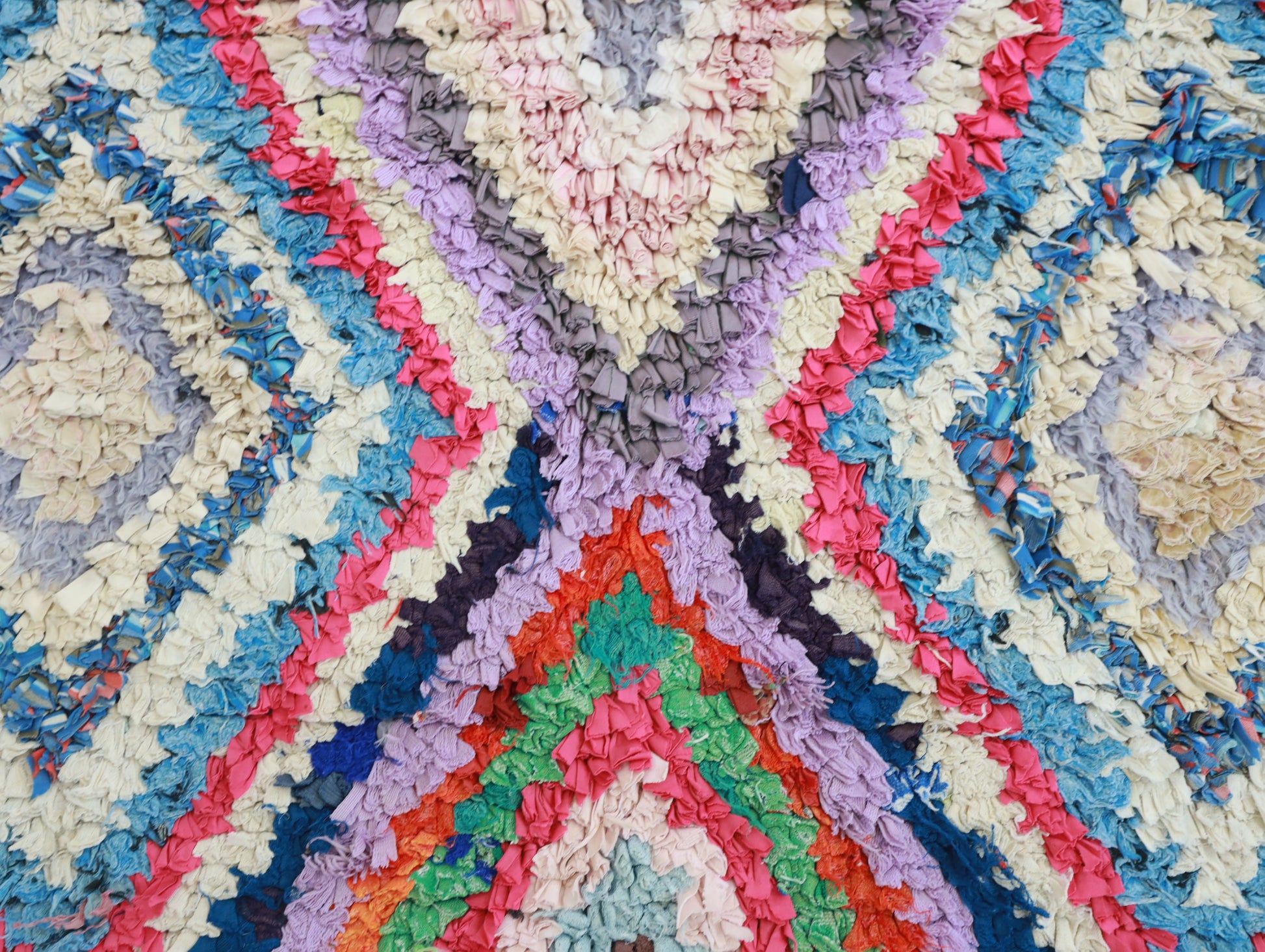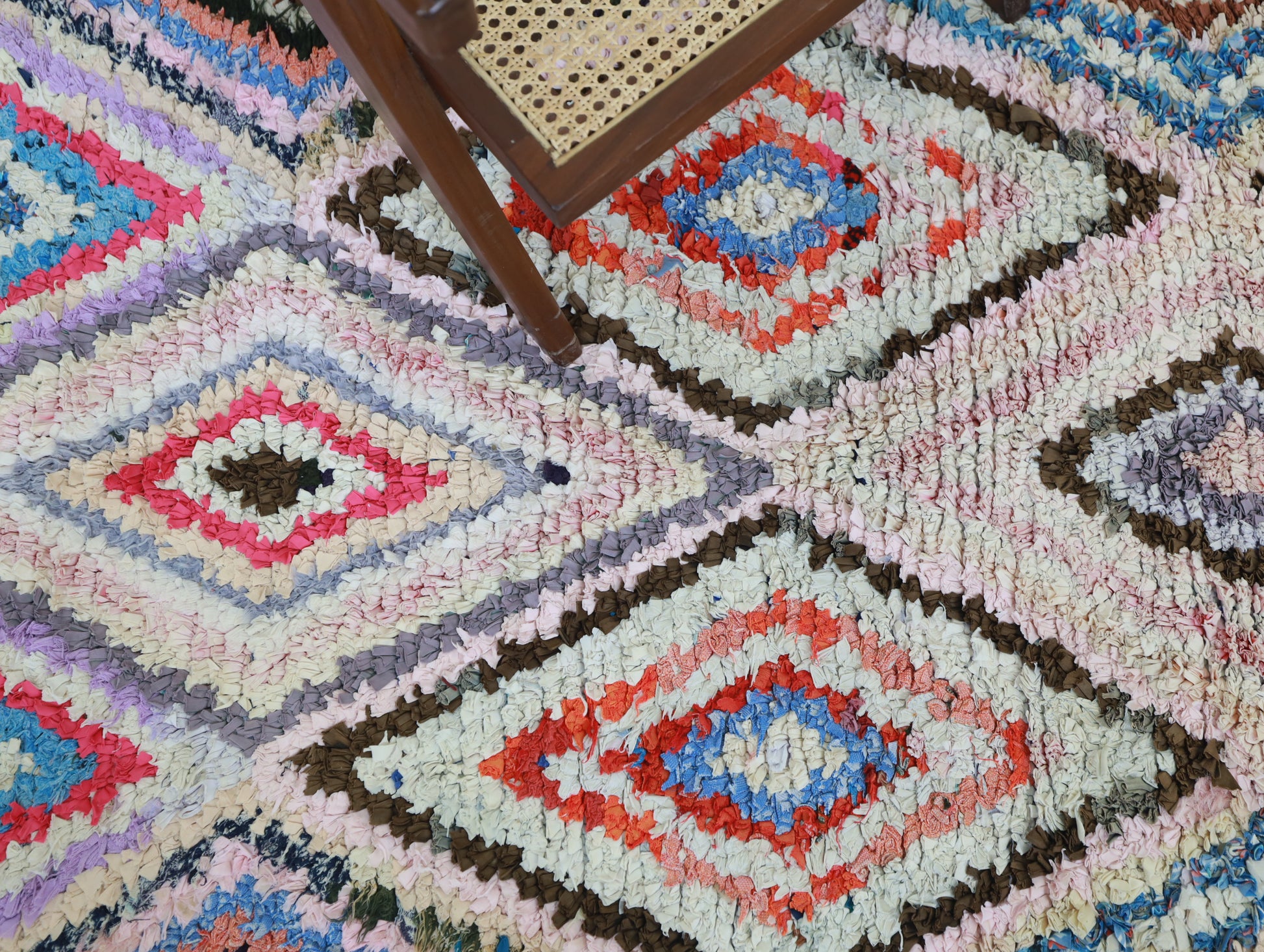 Azilal rugs boast abstract, painterly designs reminiscent of rugs from Ourika. What sets them apart is a vibrant color palette, achieved through the incorporation of cotton alongside wool..