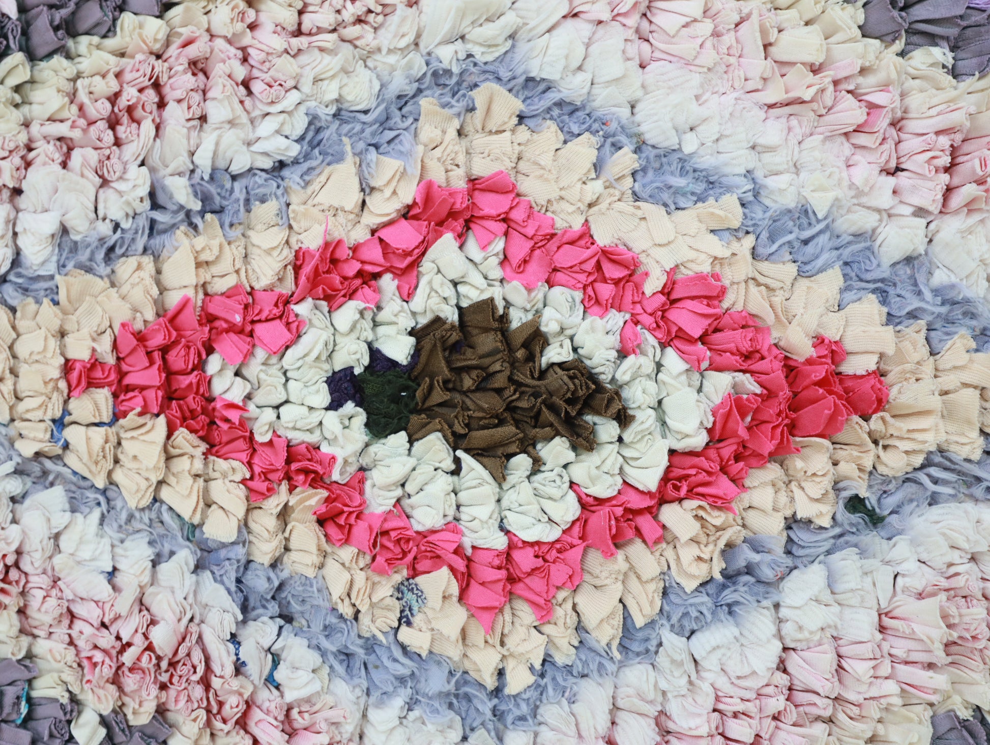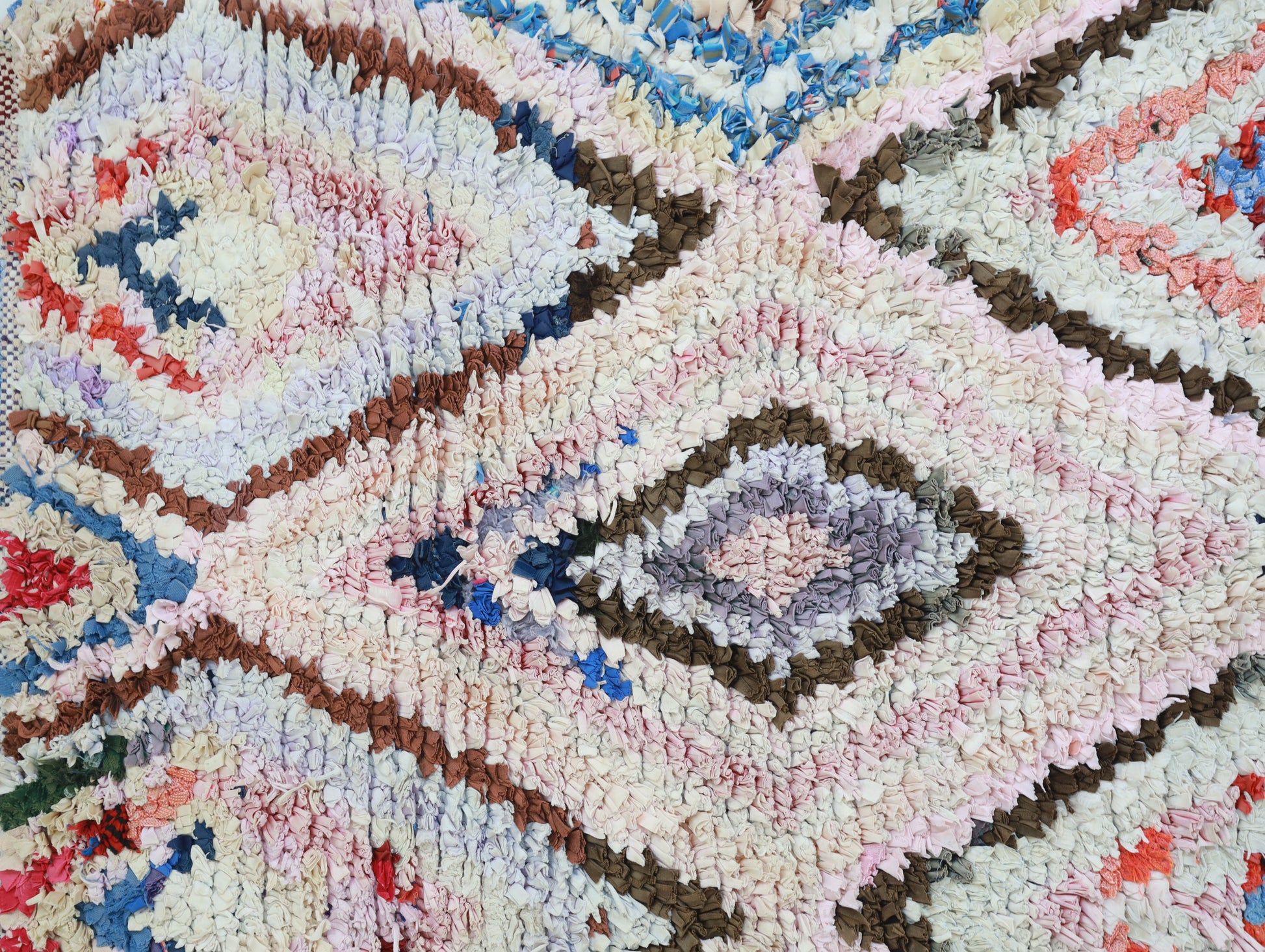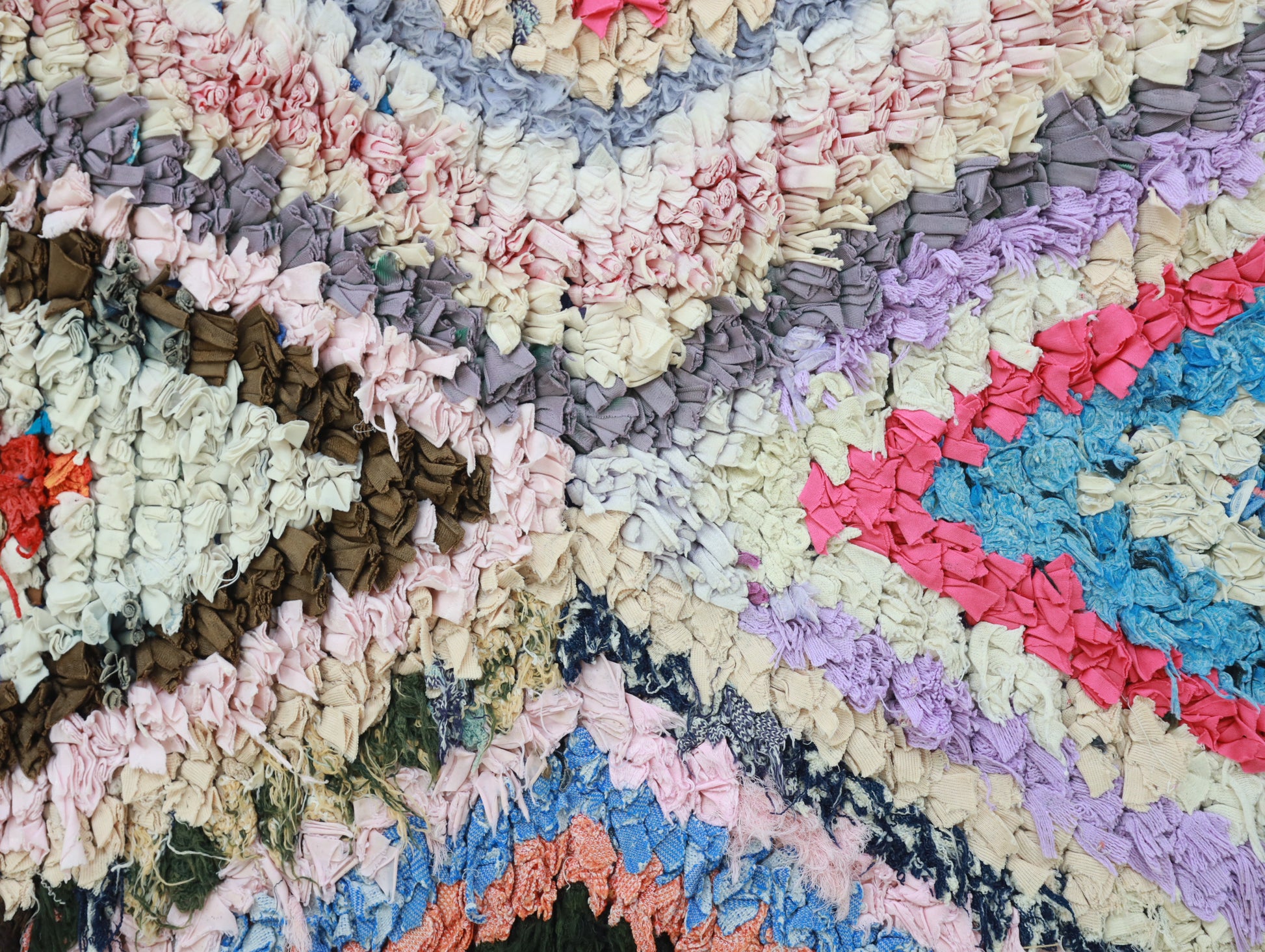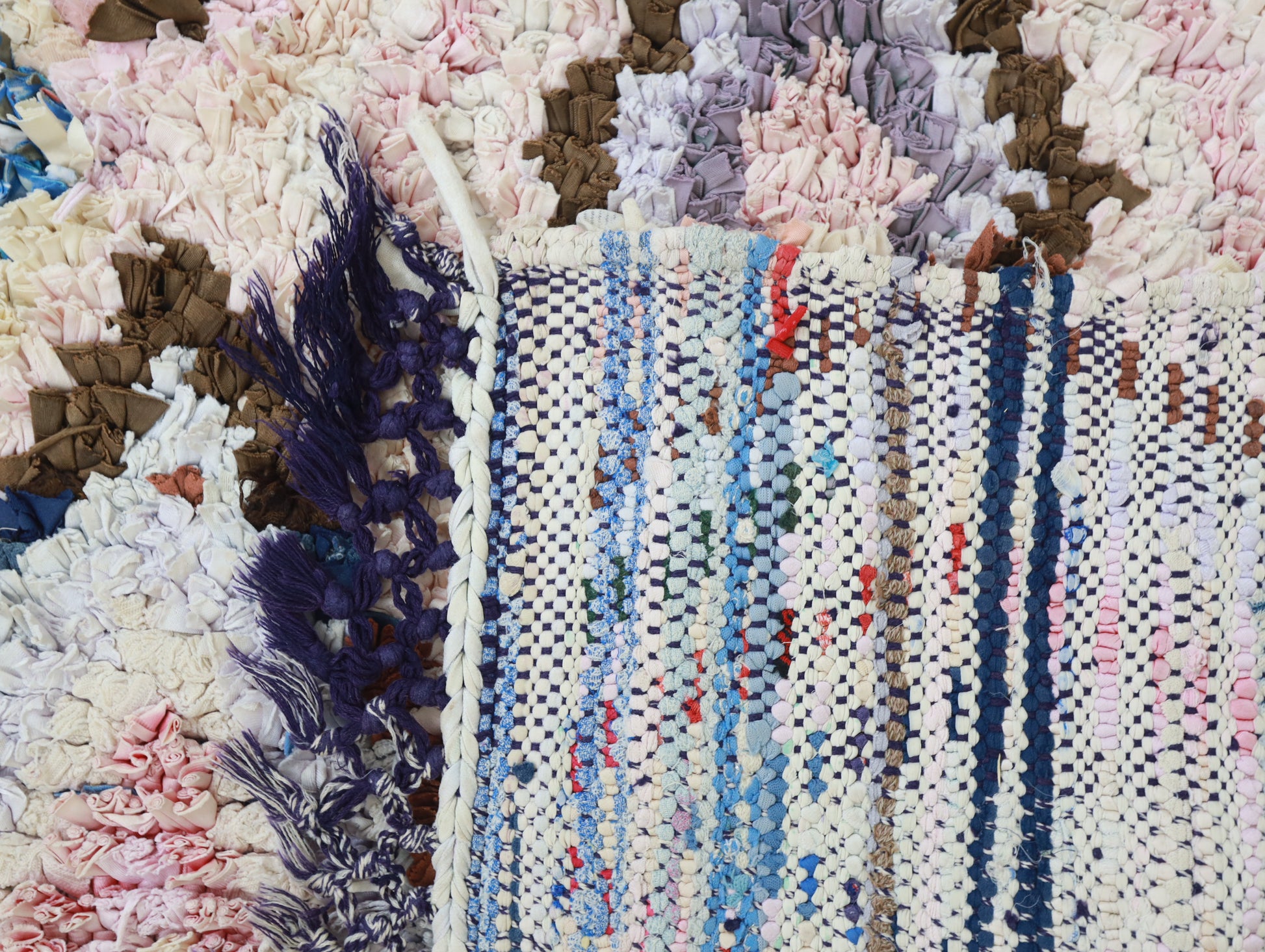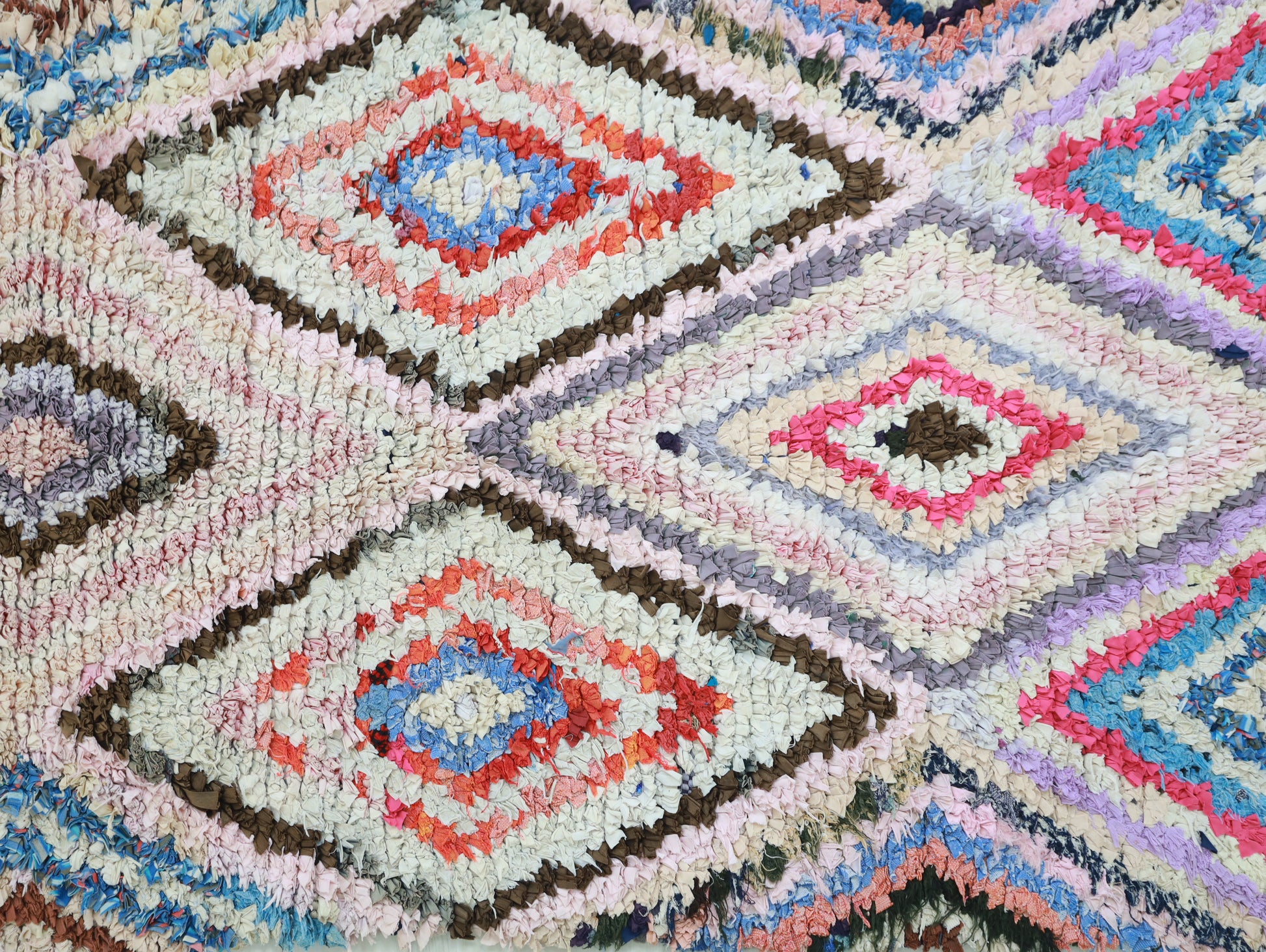 An unparalleled vintage masterpiece, carefully crafted by Berber Tribes in the Boucherouite style using upcycled textiles. Measurements: 3'1" x 7'7" (94 cm x 235 cm),