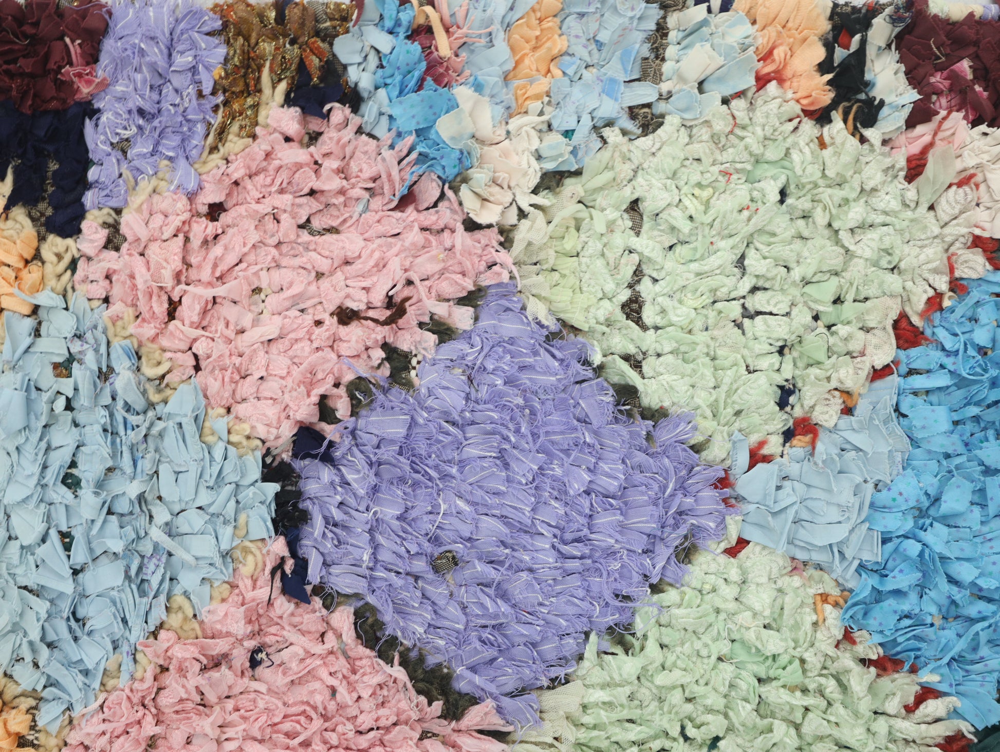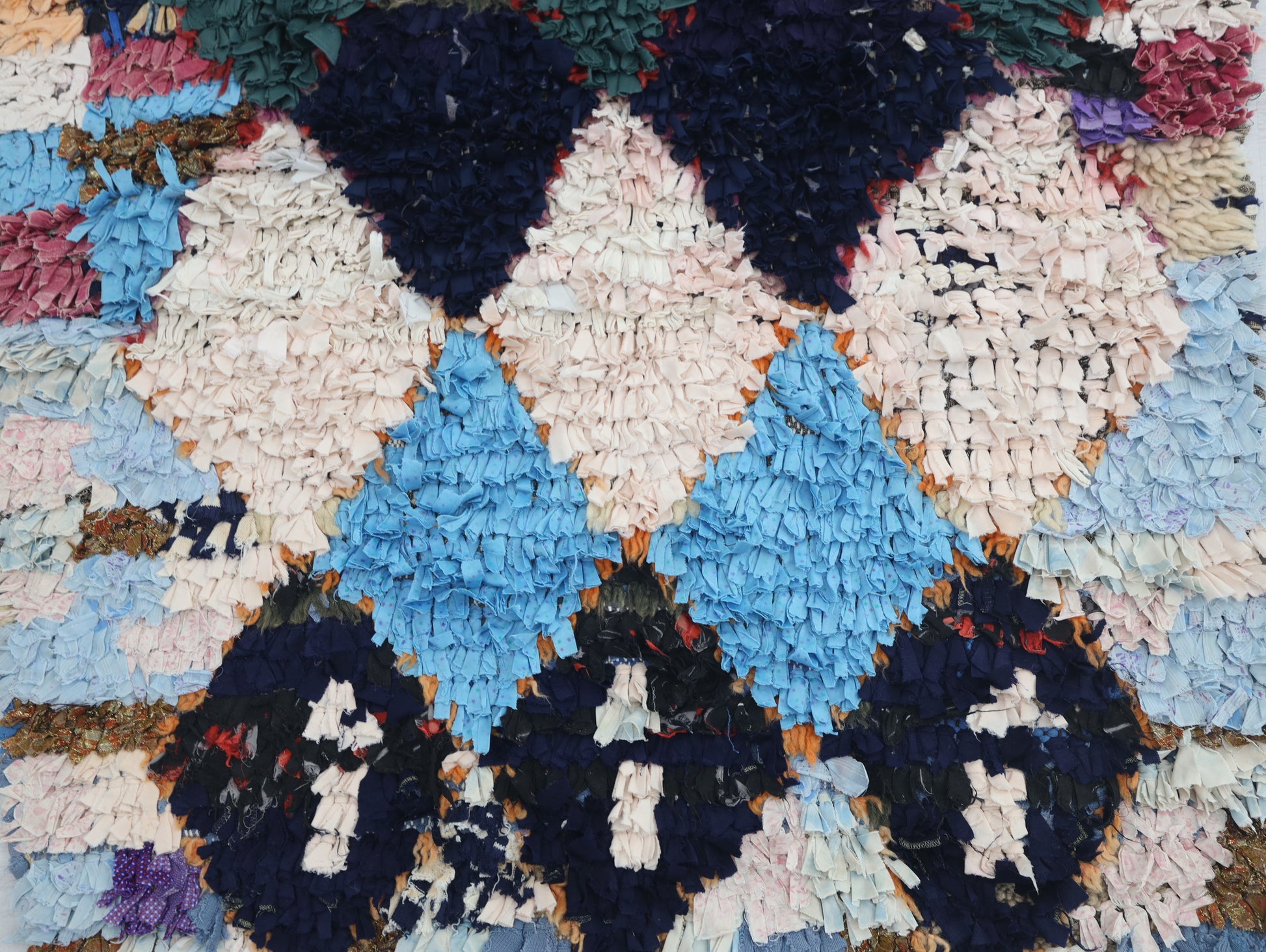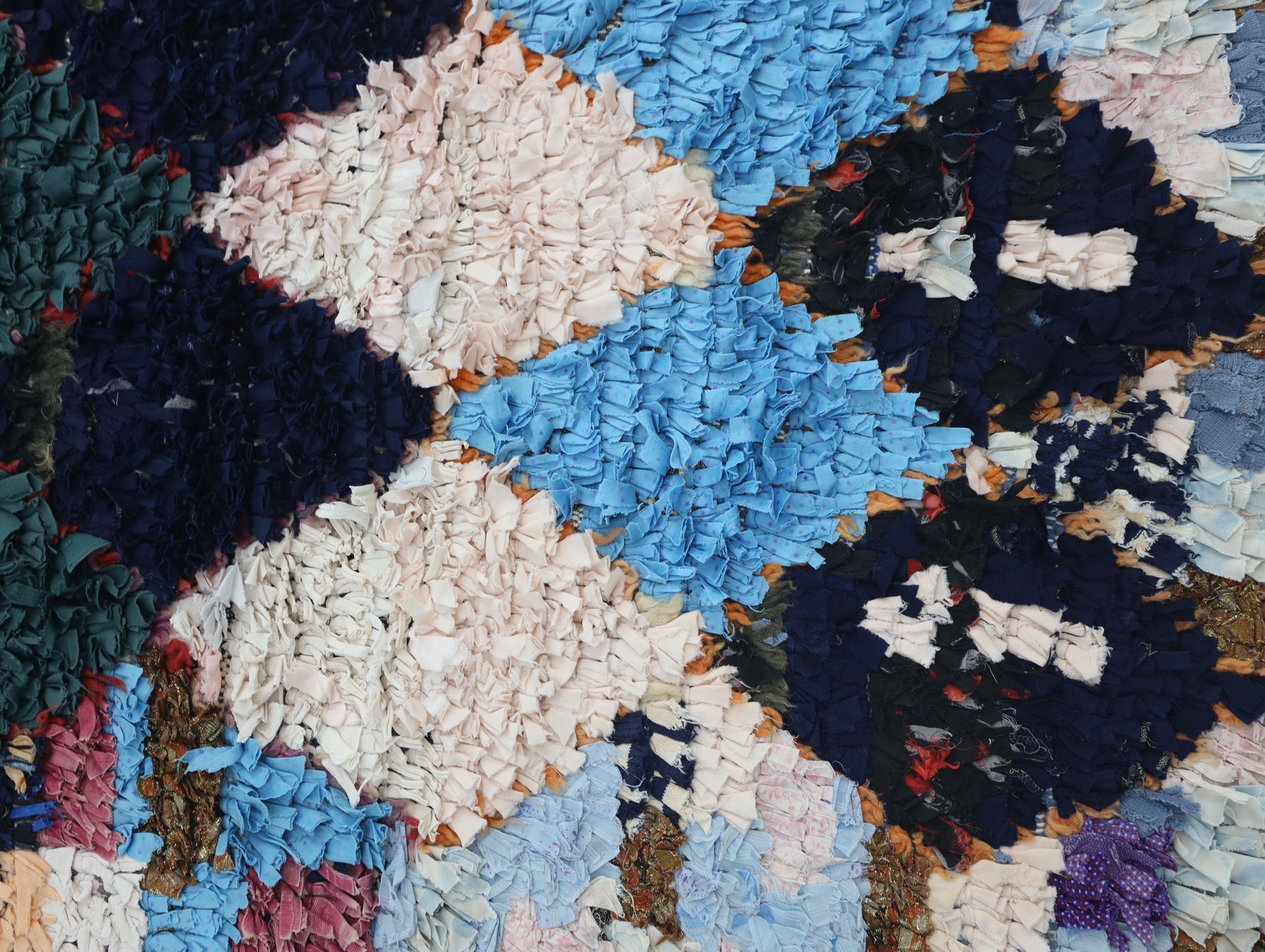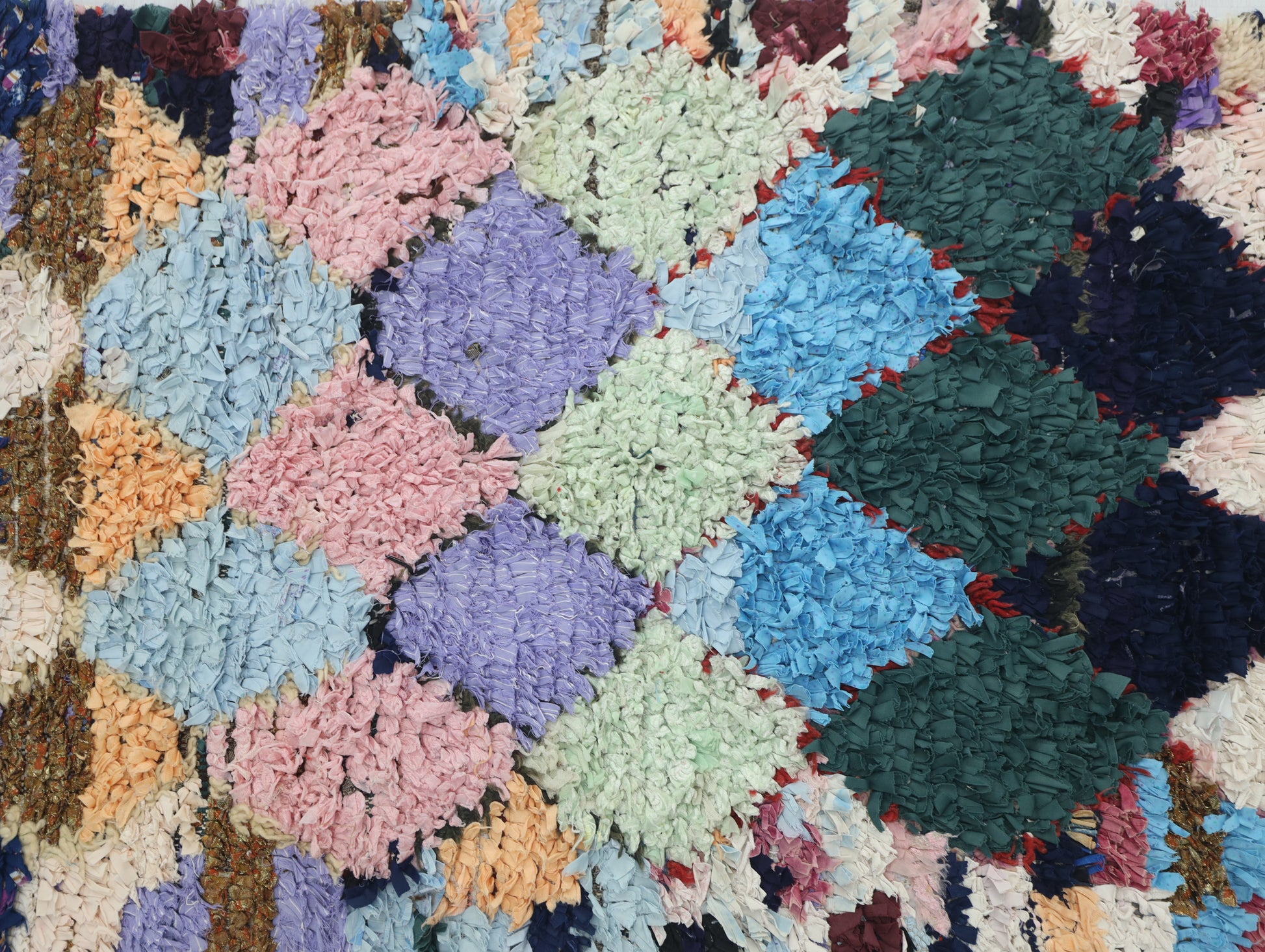 An unparalleled vintage masterpiece, carefully crafted by Berber Tribes in the Boucherouite style using upcycled textiles. Measurements: 3'3" x 7'9" (100 cm x 242 cm),