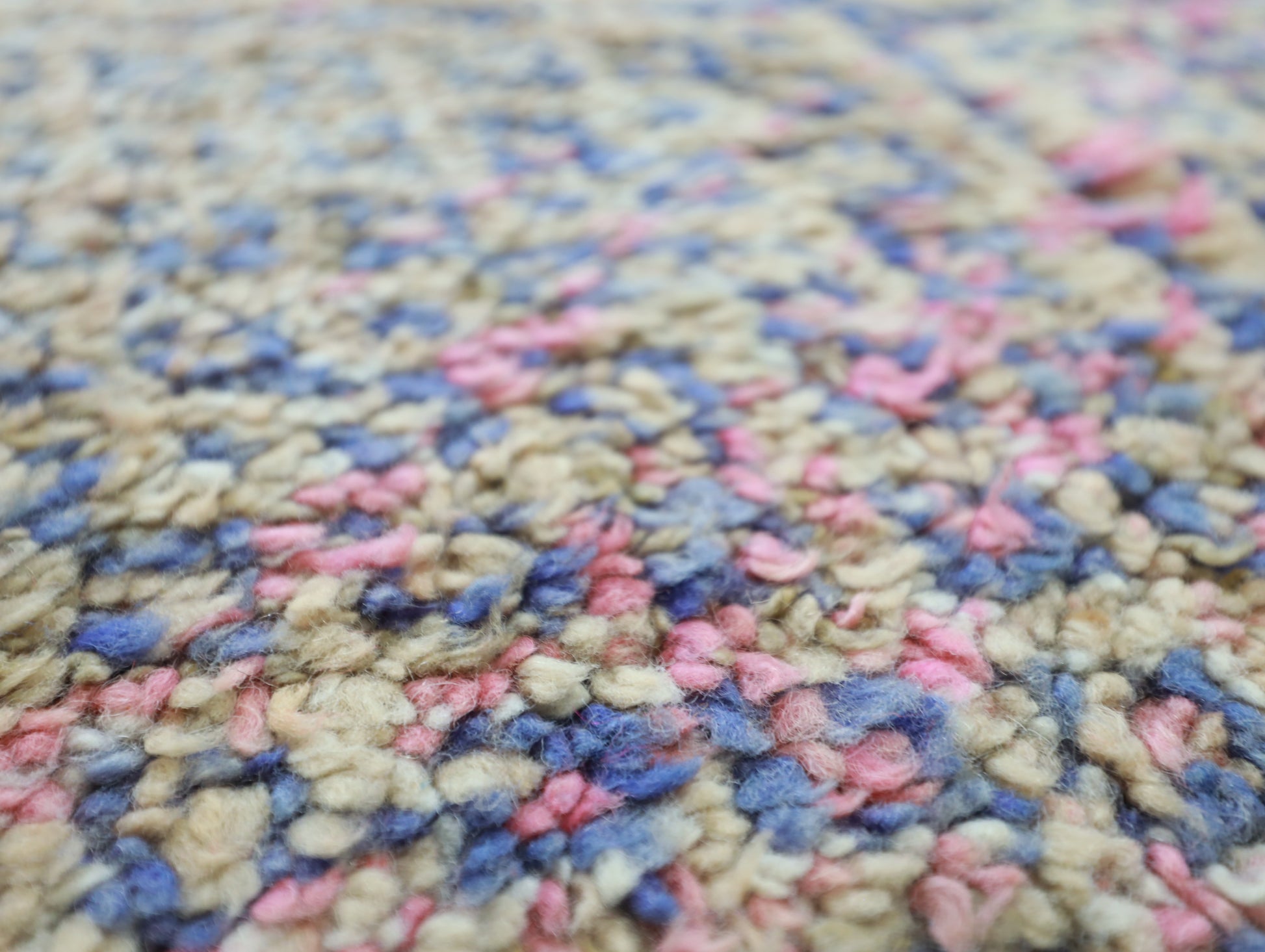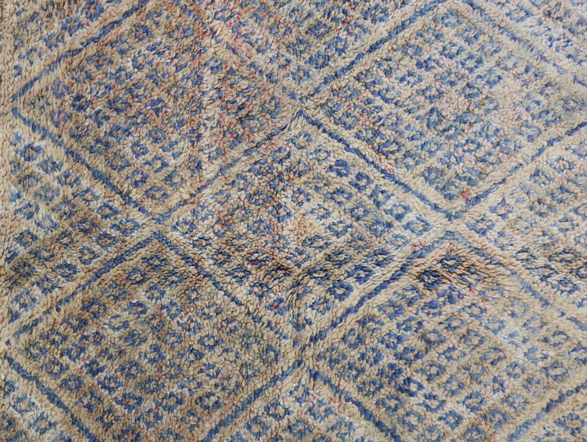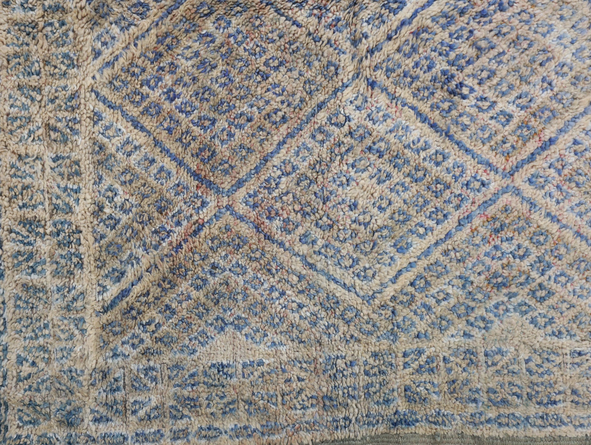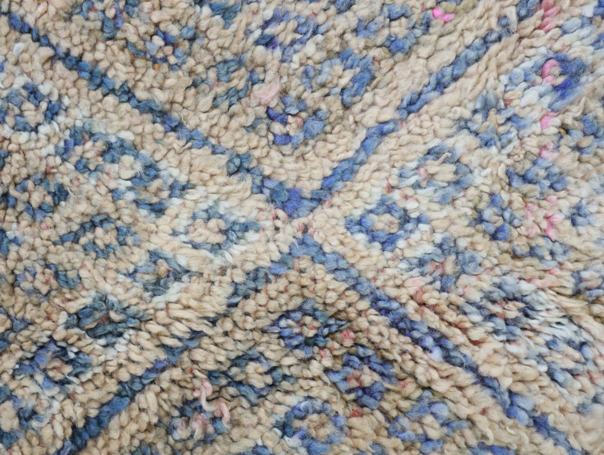 Wool, a sacred material for the Amazigh (Berber) people, forms the cornerstone of Moroccan rug design. Durable, long-lasting, and soft underfoot, wool is both functional and comfortable. In this piece, the wool pile is expertly knotted onto a wool foundation, adding substance and allowing it to gracefully embrace the floor.